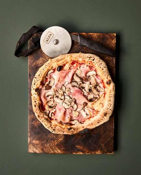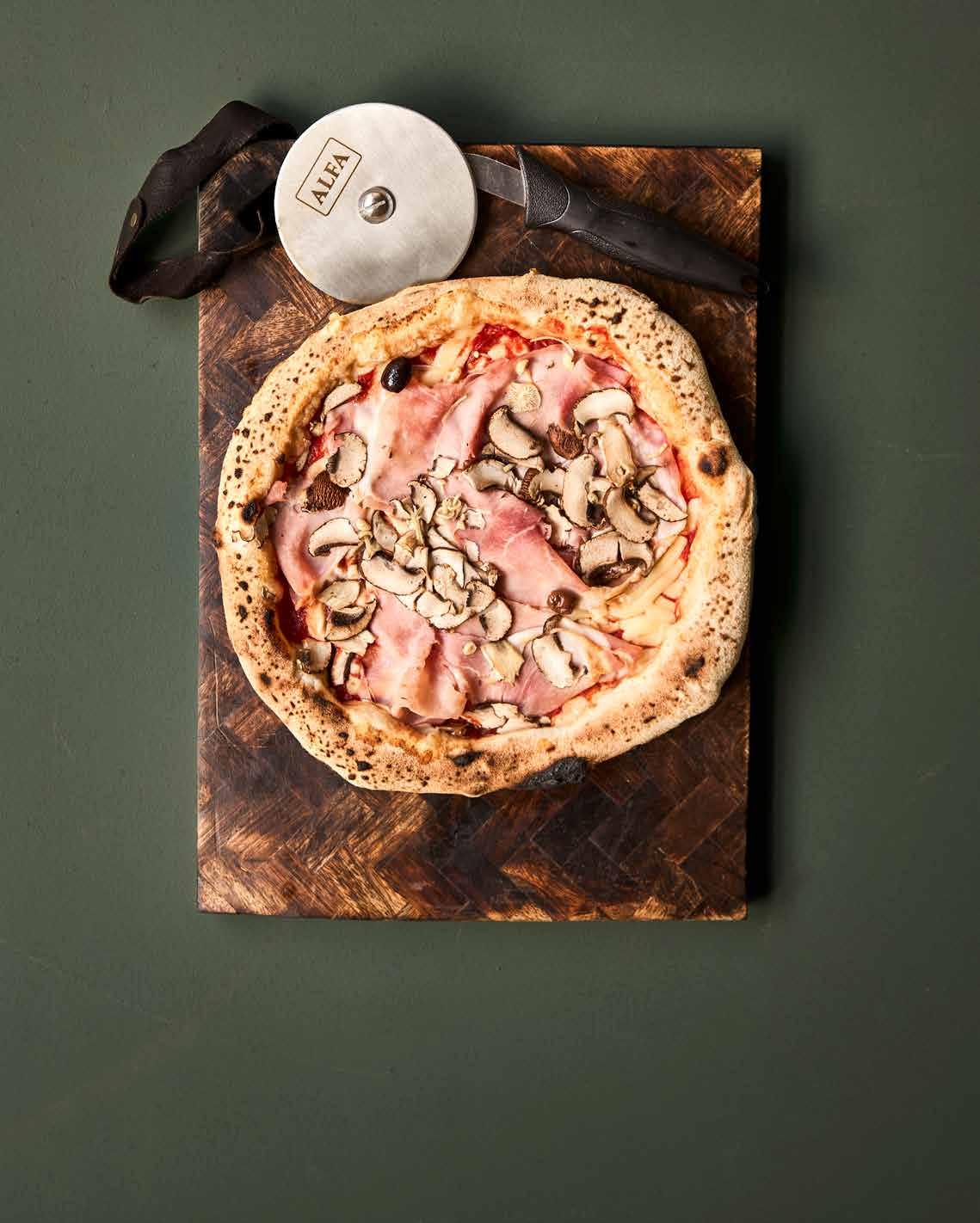 San marzano sauce, fior de latte, prosciutto cotto, champignon og oliven.