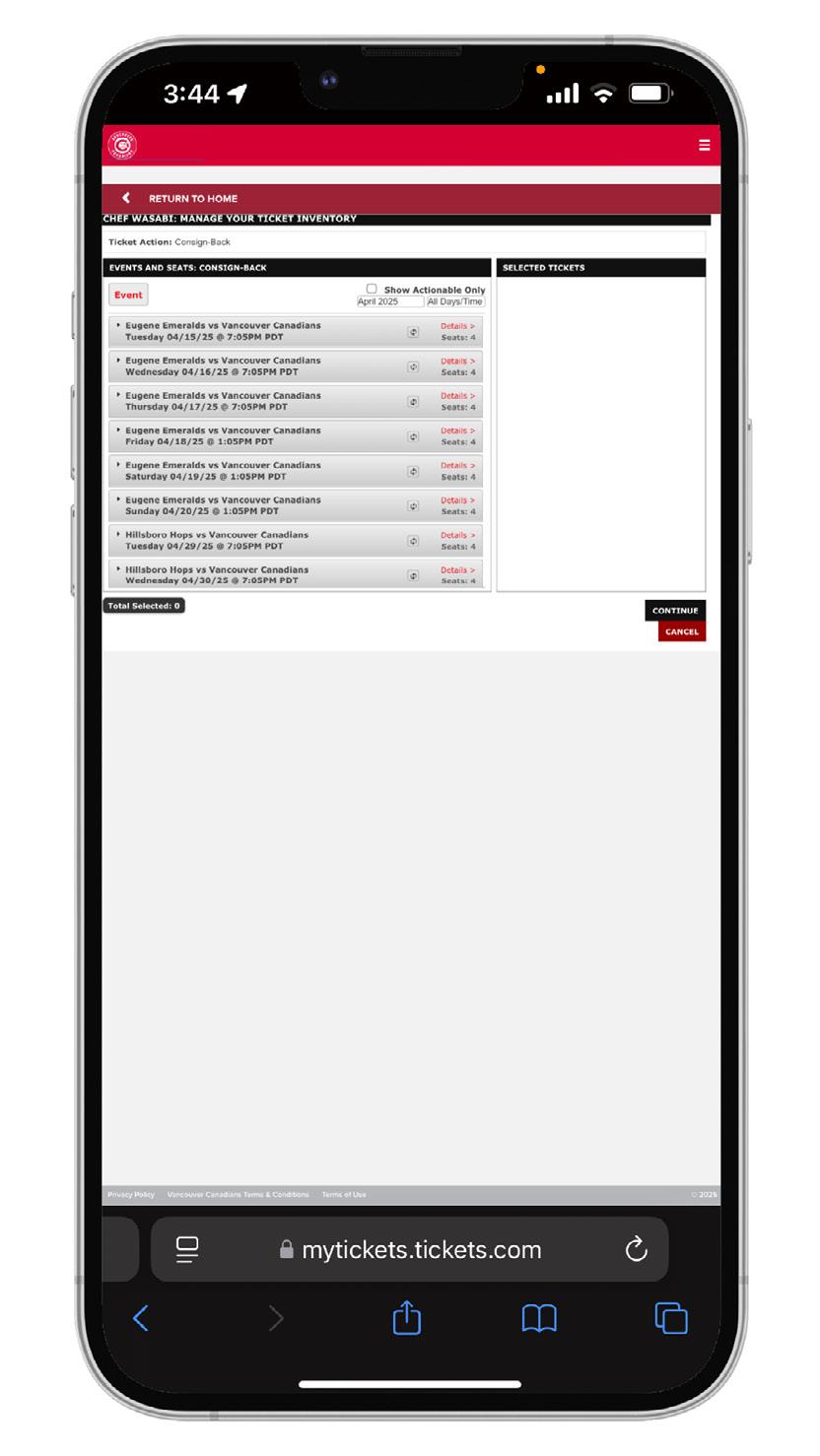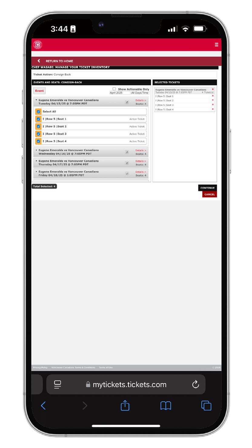 3. Select the tickets you want to consignback and select “Continue”.