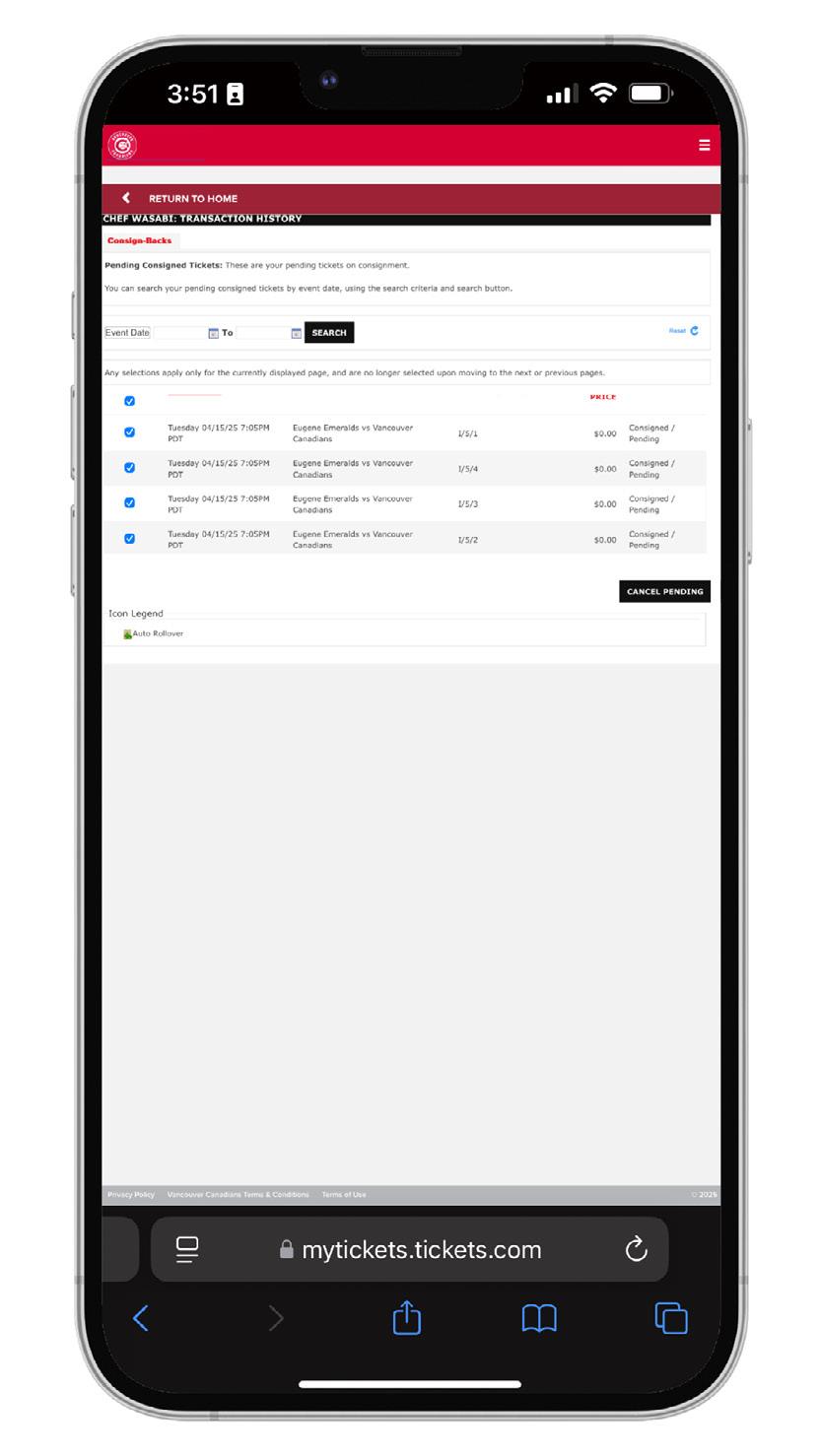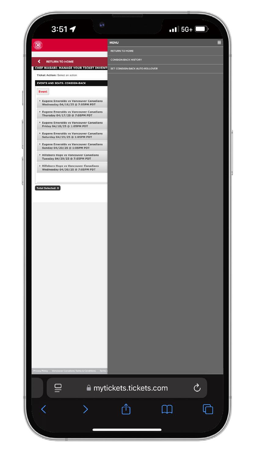 1. After logging into your account, click the three white lines in the top right-hand corner of the page. Then, select “My Canadians Tickets”, then “Consign-Back”.