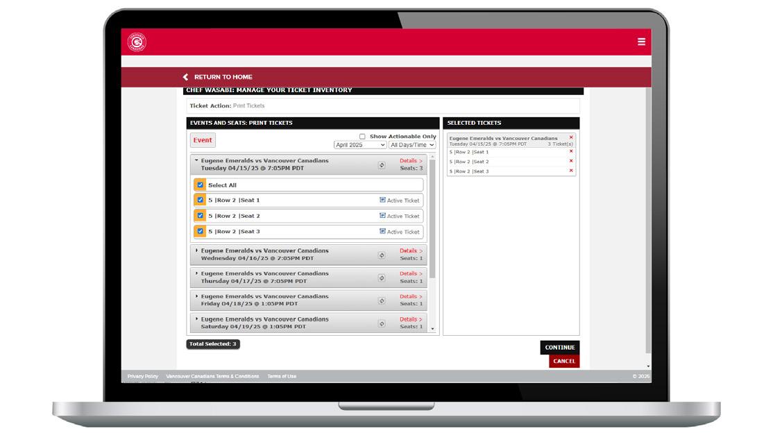 4. Confirm the game(s) and seat(s) you have selected for printing by clicking “PRINT TICKETS.”
