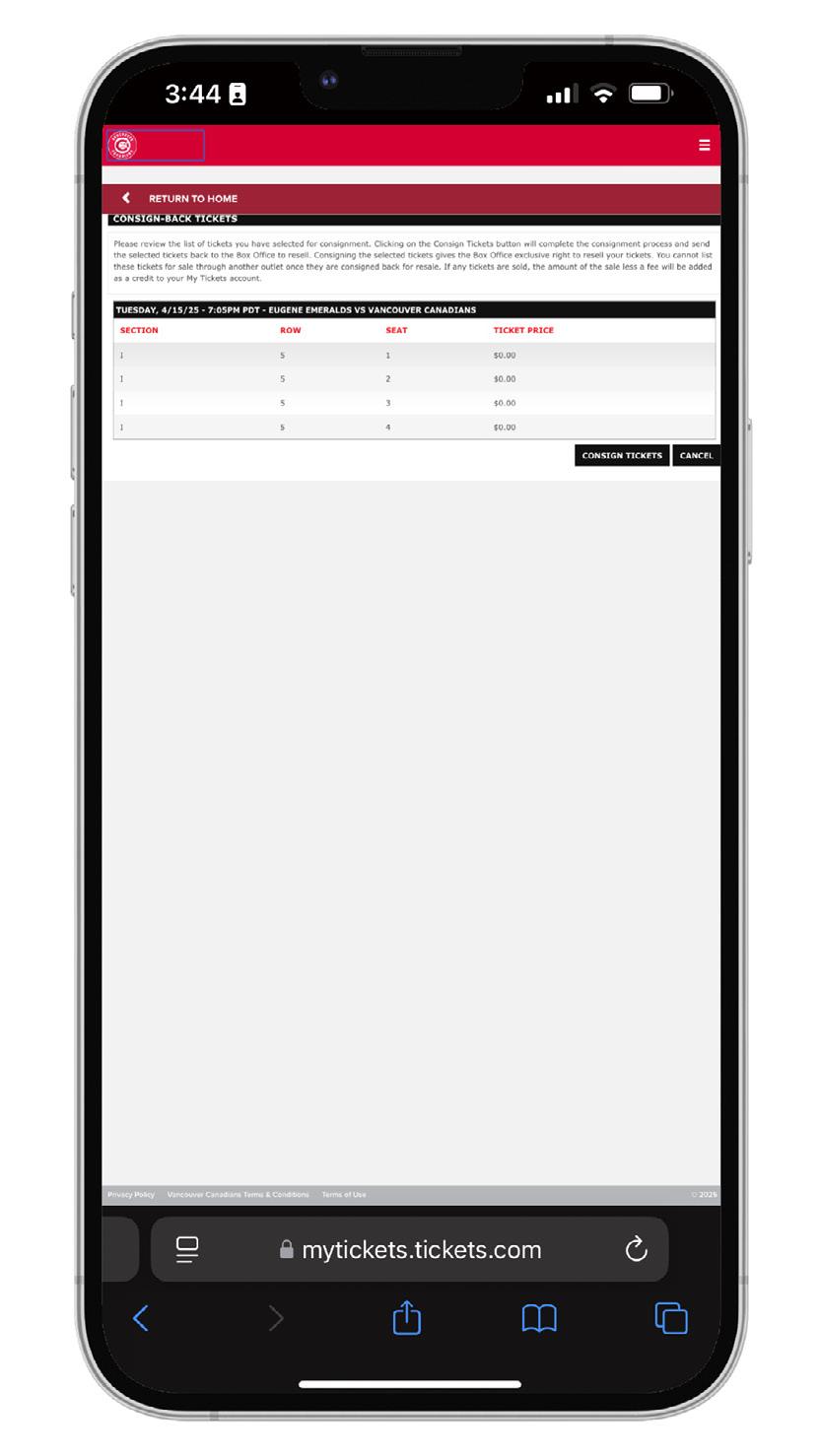 WHAT IS CONSIGNMENT? SEASON TICKET HOLDERS THAT ARE UNABLE TO ATTEND A VANCOUVER CANADIANS HOME GAME HAVE THE OPTION TO CONSIGN THEIR SEATS BACK TO THE BOX OFFICE THROUGH THEIR MY C’S TICKET ACCOUNT. CONSIGNING YOUR SEATS MEANS RELEASING YOUR SEATS BACK TO THE BOX OFFICE TO BE RESOLD AS SINGLE GAME TICKETS. IF YOUR CONSIGNED BACK SEATS ARE RESOLD THROUGH THE VANCOUVER CANADIANS BOX OFFICE, YOU WILL RECEIVE THE PER TICKET COST OF YOUR SEASON TICKETS ON YOUR ACCOUNT AS A TICKET CREDIT THAT CAN BE USED FOR FUTURE TICKET PURCHASES.