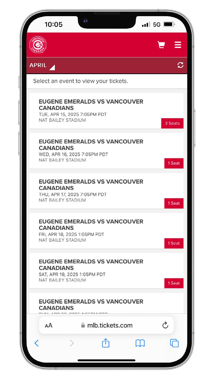 2. Once you choose the game date you’re attending, a list of available tickets for that date will appear. Click on the specific ticket to view the ticket barcode.