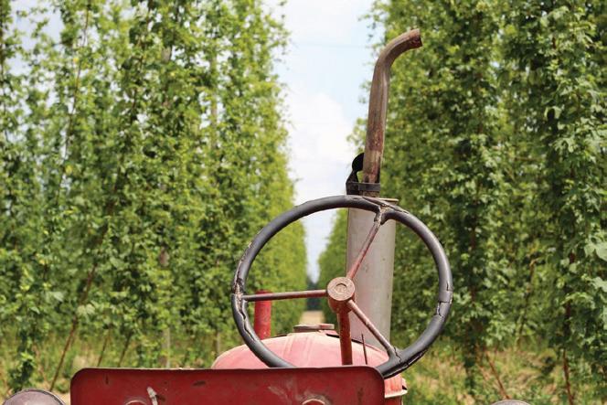 During harvest, you have to steer between the bines, as they do here at the Von Edgar Hop Yard. Photo courtesy of The Paris Beer Co.