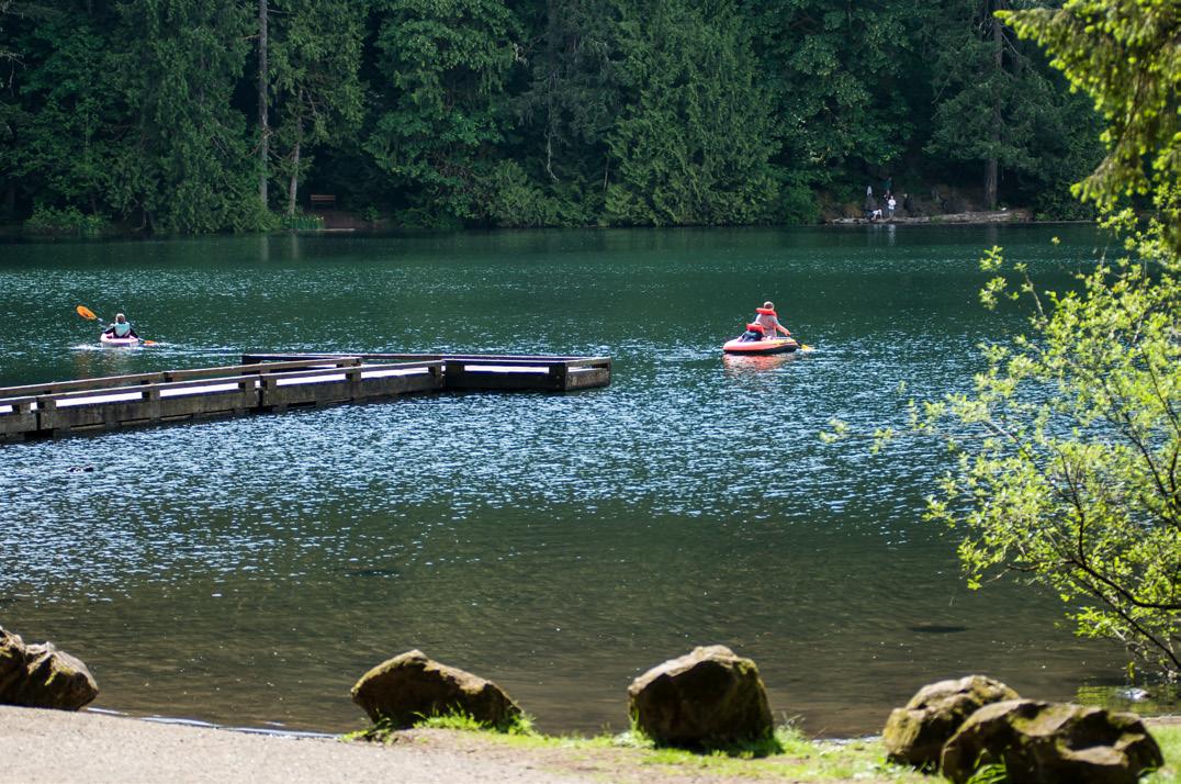 The swim area is also nice, but because there is no creek bringing fresh water into Battle Ground Lake, it occasionally has unsafe levels of E. coli and/or algae. I prefer walking the short trail that circles the lake. One time, my kids and I took a wrong turn and ended up on an equestrian trail that was covered in poop and hard to navigate. Those trails lead to equestrian campsites, which are much more secluded.