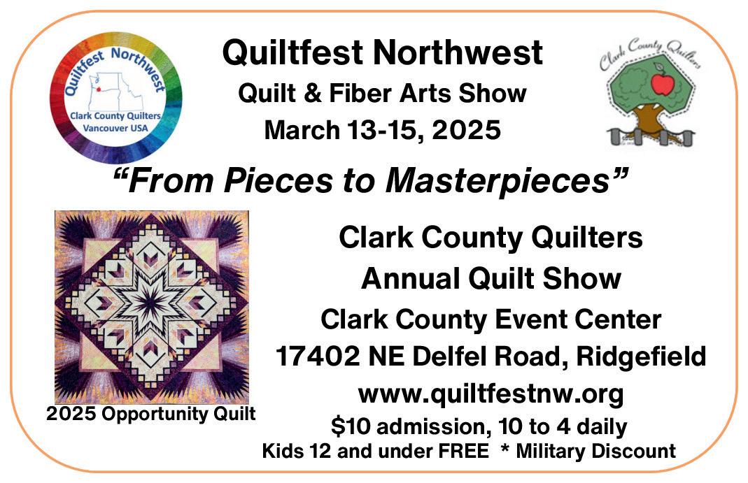 QuiltFest NW will happen March 13-15, 2025 at Clark County Event Center, 10 am-4 pm each day. Admission is $10 per day,
