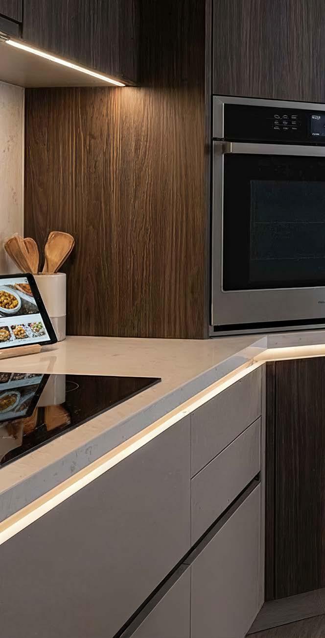 Plak een ledstrip onder je hangmeubels en zwevende toestellen om diepte te creëren. Als je ze onzichtbaar achter een rand plakt, zorgen ze voor indirecte verlichting zonder afbreuk te doen aan de strakke look.