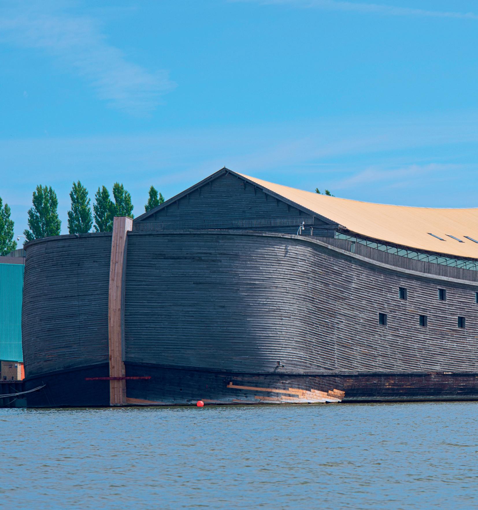 Ondernemer en evangelist Johan Huibers uit Broek op Langedijk heeft de Ark van Noach nagebouwd. Twee keer zelfs: eerst een kleinere en daarna dit exemplaar dat ongeveer aan de Bijbelse afmetingen voldoet – 122 meter lang, 29 meter breed en 27 meter hoog. Afmetingen noteerde men in die tijd in ellen en niet ieders elleboog is even lang, vandaar het ‘ongeveer’. Het gevaarte is klaar in 2012 en telt zeven verdiepingen. In het indrukwekkende project vormen vooren achterdek elk een soort amfitheater met 1.400 zitplaatsen en is voorzien in dierenverblijven, appartementen, bioscopen, liften, een conferentieruimte, een restaurant; zelfs een sprinklerinstallatie ontbreekt niet. Het fantastische project van Huibers beoogt bezoekers nieuwsgierig te maken naar de Bijbel.