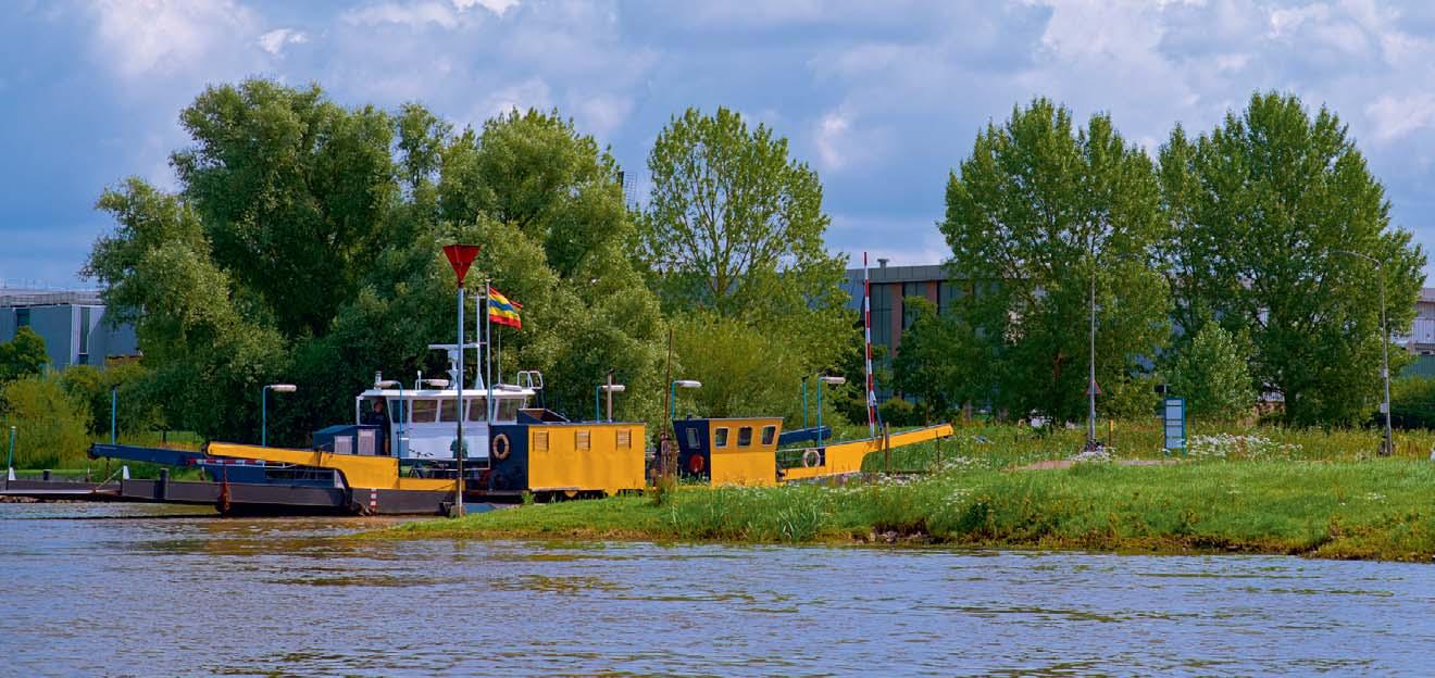 nog Overijssel is en de Heerdese oever Gelderland. Met koeienletters staat op het veer: let op kabelpont. De meeste schippers zullen daarvan de neiging krijgen te wachten of op zijn minst voorzichtig te zijn. En dat geldt ook voor ons!