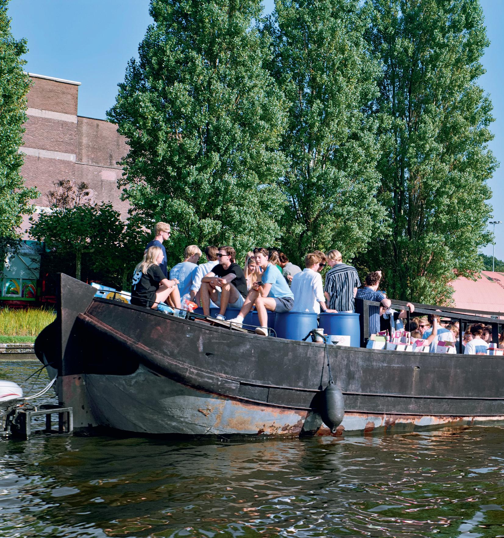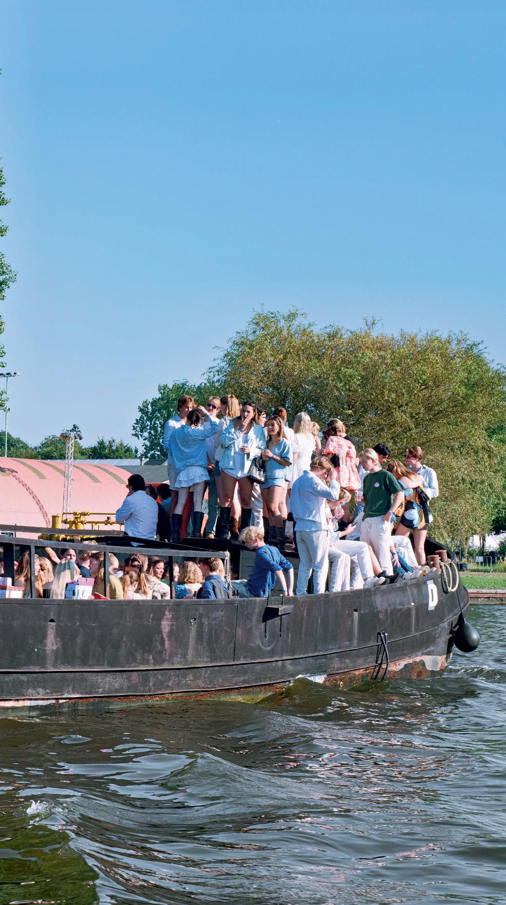 De schuit heeft een schipper maar die is onderdeel van de crowd geworden. Je vraagt je daarom af wie er in de gaten houdt dat de boot nergens tegenaan vaart. Want zelfs al zou de schipper zich bovenop de blauwe tonnen posteren, dan nog kan hij niet om de enorme ploeg op zijn voorschip heen kijken. Vanuit een oogpunt van veiligheid is het wel weer goed dat de boot geen noemenswaardige voorwaartse snelheid kan ontwikkelen. En je hoopt ook maar dat al die jongelui kunnen zwemmen, want het is immers niet denkbeeldig dat er een of meer te water zullen raken. Over het algemeen kenmerken dit soort festiviteiten zich nu eenmaal niet door een hoog blauwe-knoop-gehalte.