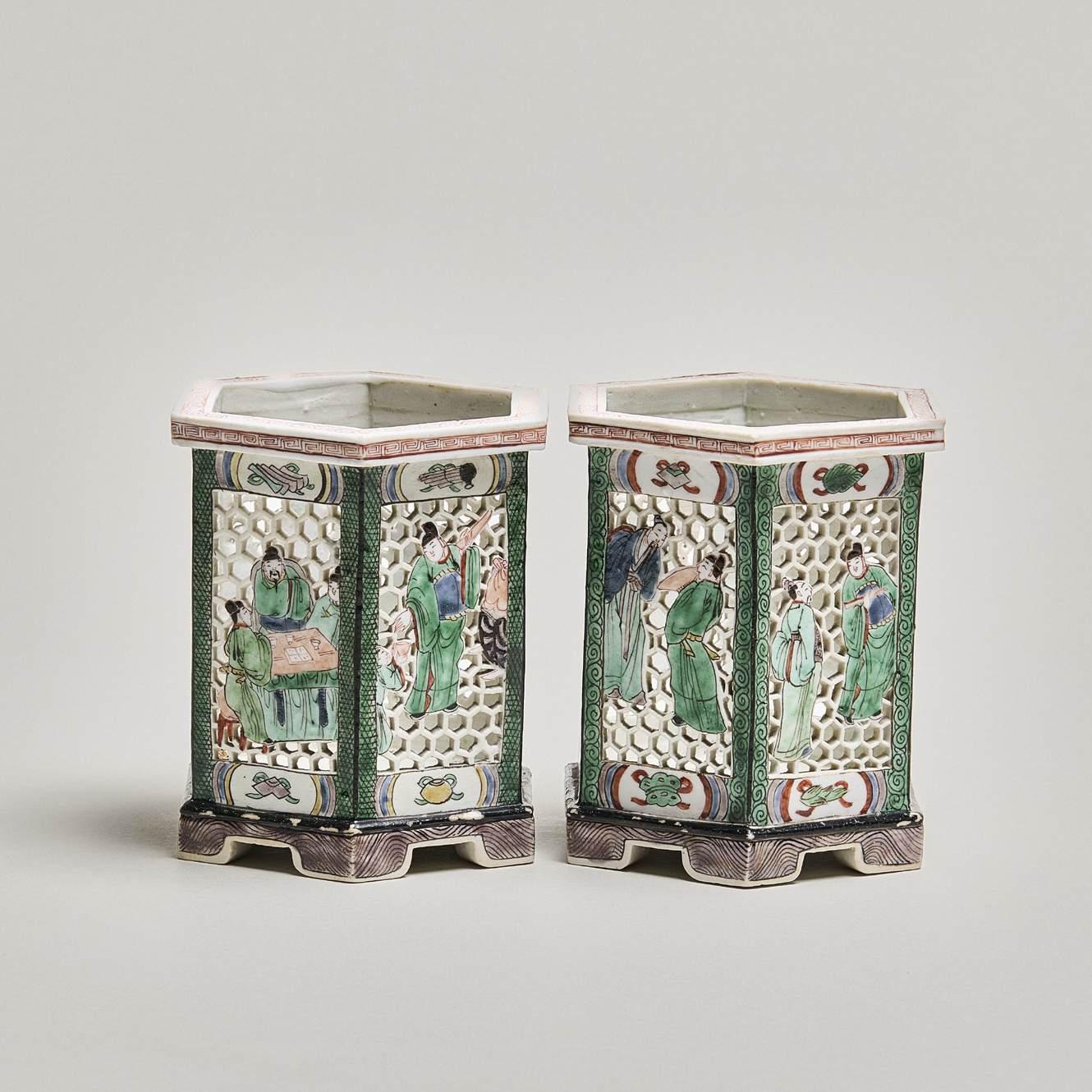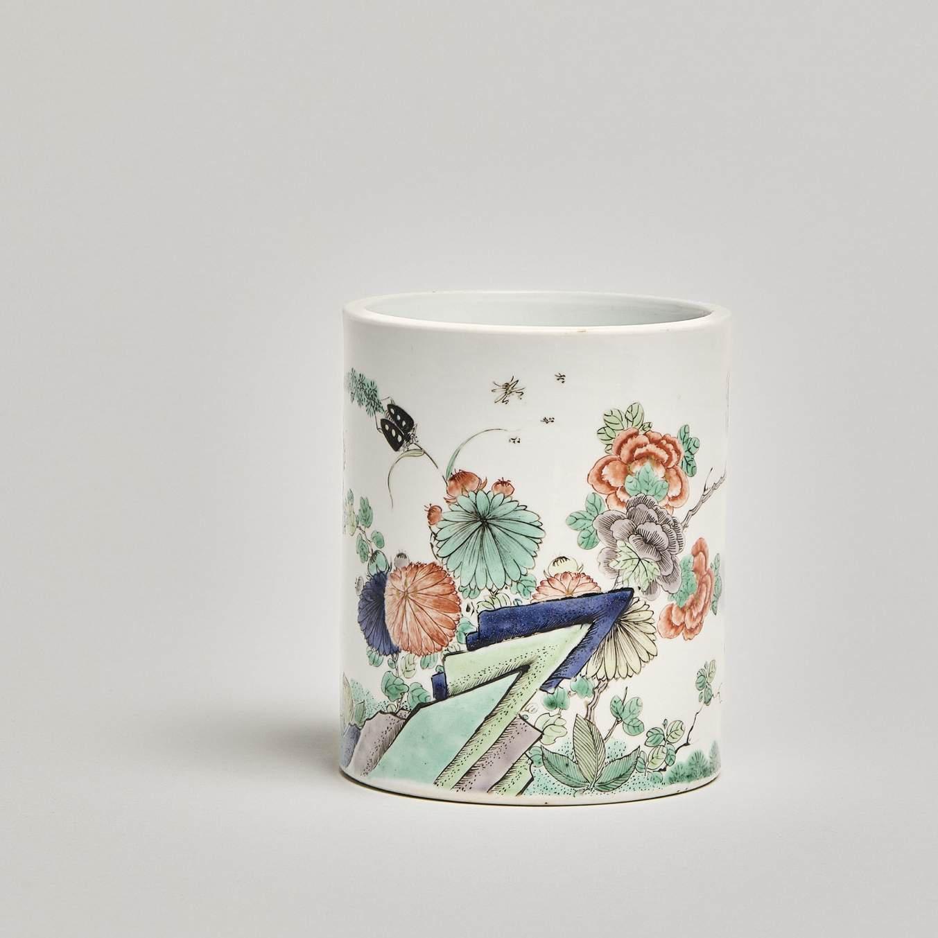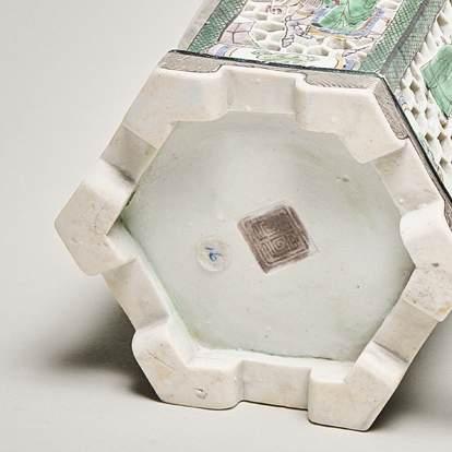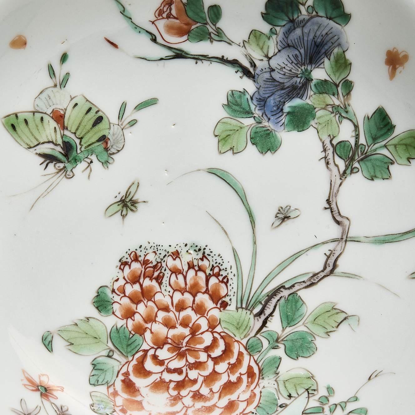 Famille verte - literally translated as “green family” - was a term coined in the 1860s by Albert Jacquemart. He was the first to classify Chinese porcelain, according to the predominant enamel colour used. Typical famille verte wares are made with a highly refined white porcelain clay, decorated with bright, almost translucent, enamels which slightly rise above the surface of the porcelain. In addition to the various vivid greens, the colour-set includes yellow, aubergine and a coral toned iron-red and a composite black. The blue over-glaze enamels in this palette, have a violet or royal blue tone. Gold is also occasionally applied, to further enhance the decoration. Underglaze blue was still used for the markings on the base or circles around the foot, rim or central panel.