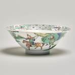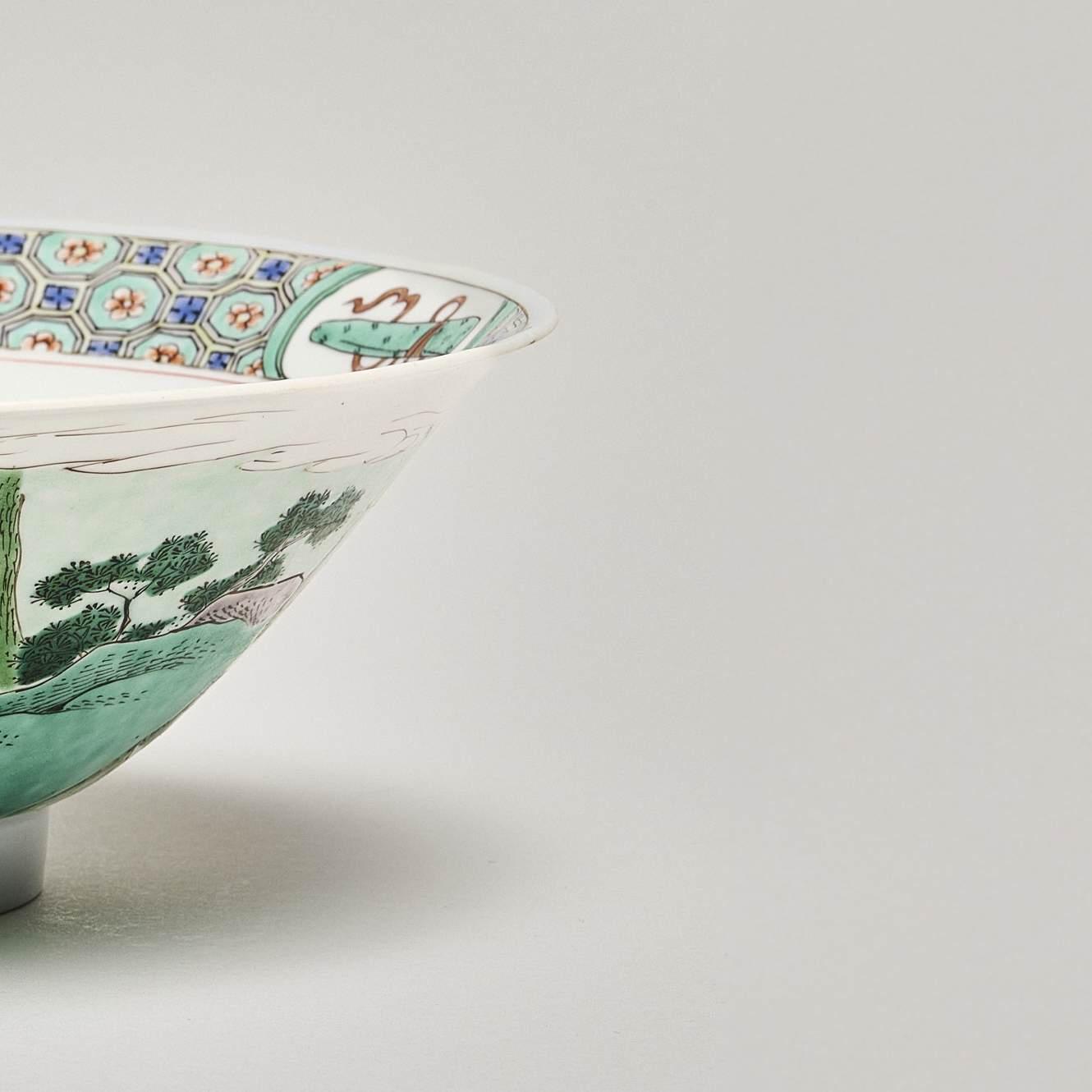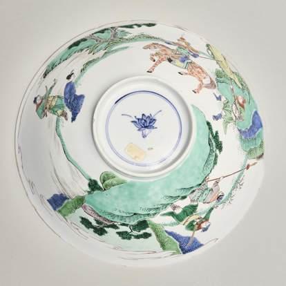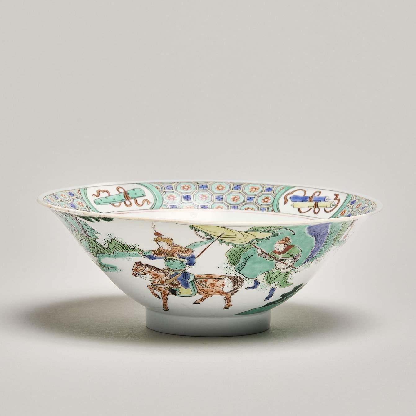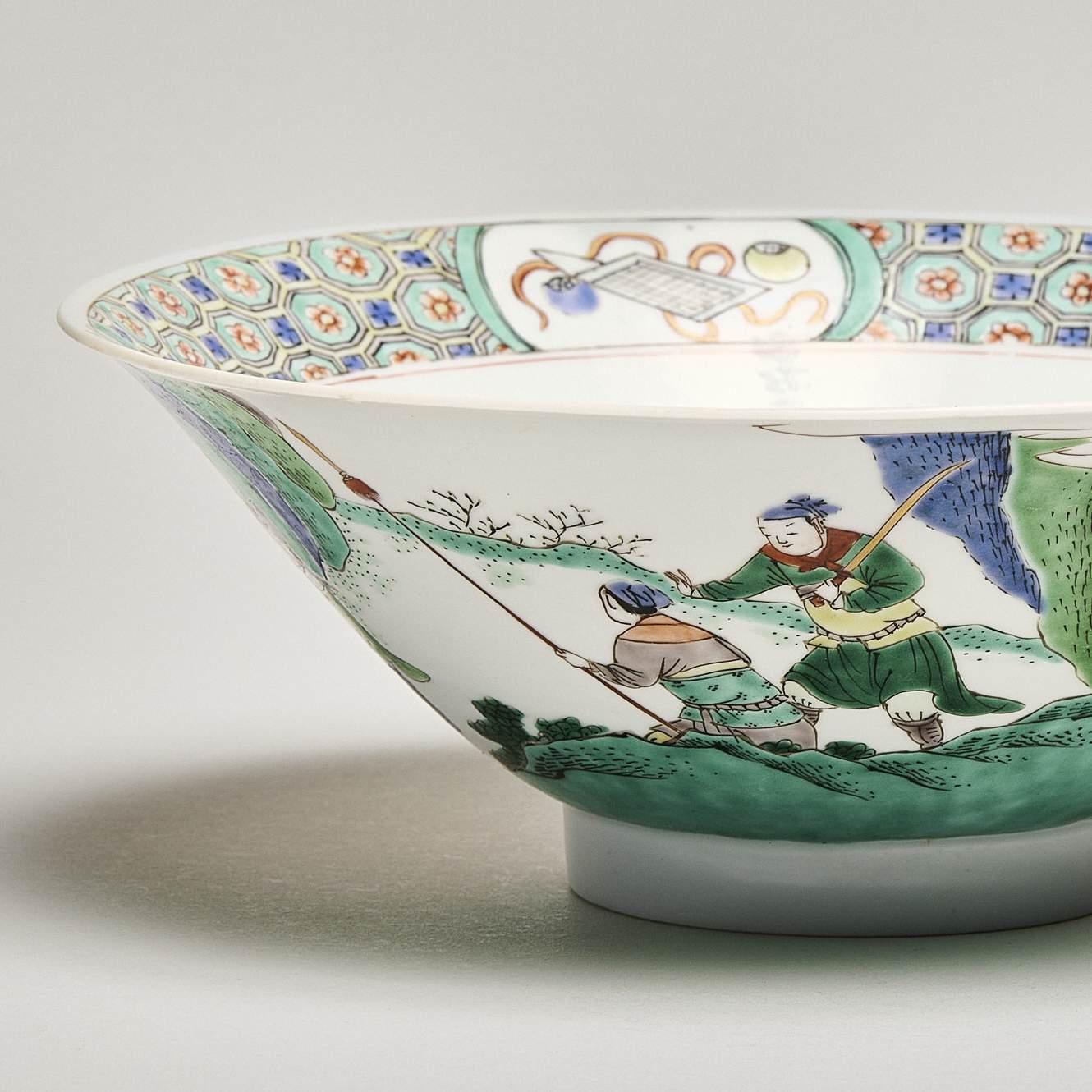 This unusual conical bowl, is decorated on the outside, with a continuous narrative scene in fine famille verte enamels. It is divided into three different figural episodes set in a rocky landscape, executed in three shades of green, blue, red, yellow and black enamels. The first scene is of a warrior on horseback holding a guandao polearm, followed on foot by a guard bearing a yellow standard. The second scene is of a mustachioed man holding a sword and a kneeling figure in a blue robe, who is about to be executed. The final scene is of a man holding a sword approaching a crouching figure holding a spear. The inside of the bowl is decorated on the bottom with a small figure of a kneeling scholar. The inside rim has a green, yellow, blue and red honeycomb diaper border, with four cartouches in reserve - each with an auspicious emblem representing the Four Scholarly Accomplishments (siyi 四藝). The bowl stands on a high undecorated foot-ring and the underside has a loosely painted blue lotus flower within a double ring. A slightly worn white rectangular label, bears a stock number of the renowned Amsterdam dealer Bernhard Stodel.