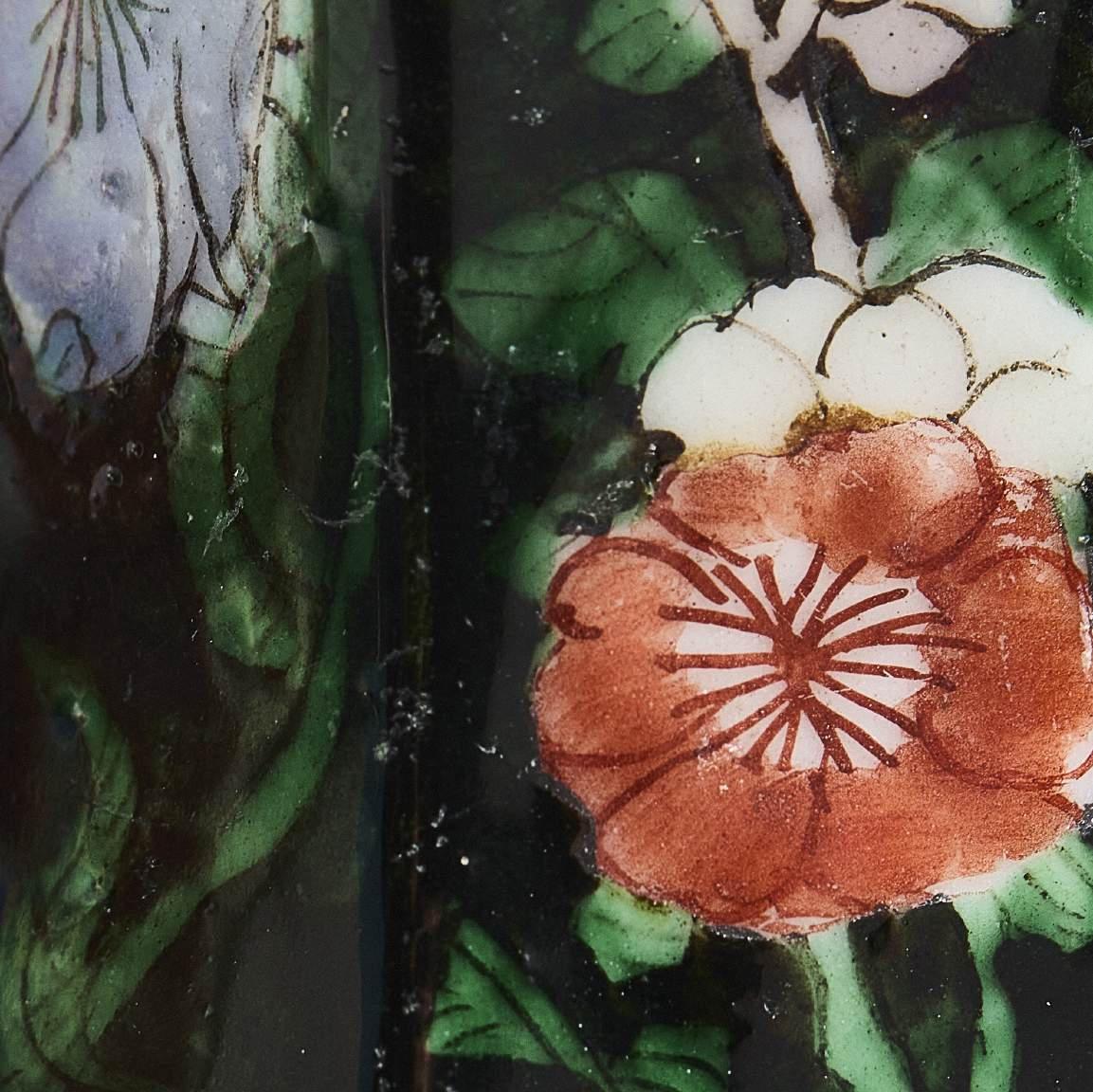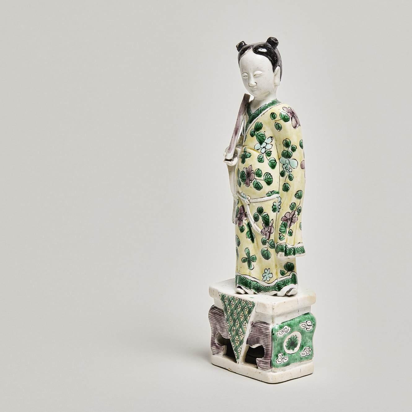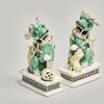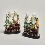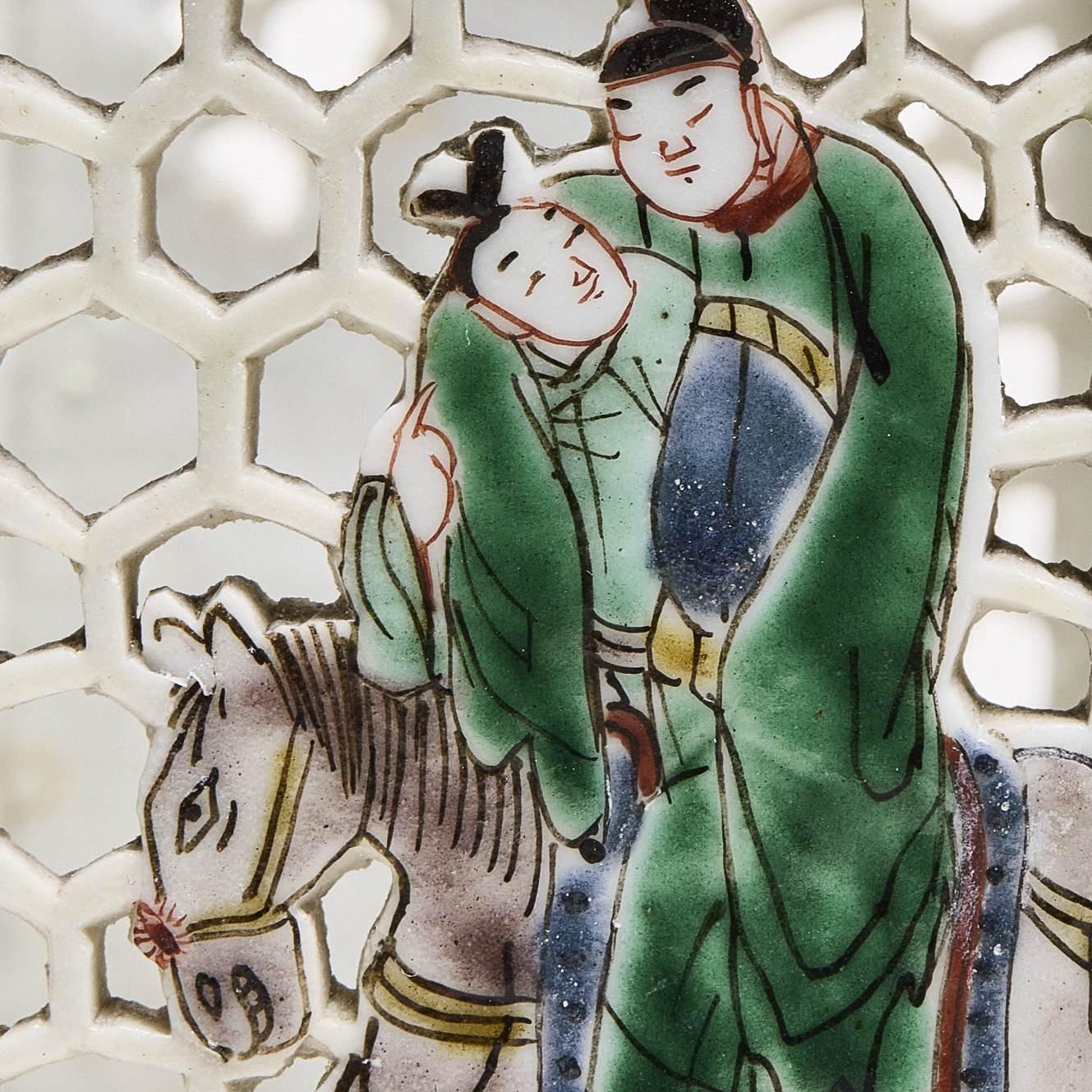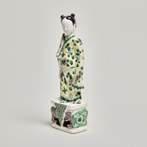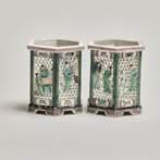 Within famille verte, several distinct subtypes developed, each appealing in its own way. The combination of verte enamels with an underglaze powdered blue ground produces a dramatic contrast: the mottled cobalt background sets off vividly painted panels of flora and fauna or figural scenes. Another prized category is the use of enamels on biscuit porcelain, where the decoration is applied directly to the unglazed ceramic body. These pieces, often small figures, possess a velvety surface and have a charm of their own. A further variation pairs verte enamels with coral red, creating another contrasting, but warm palette much admired for its elegance.