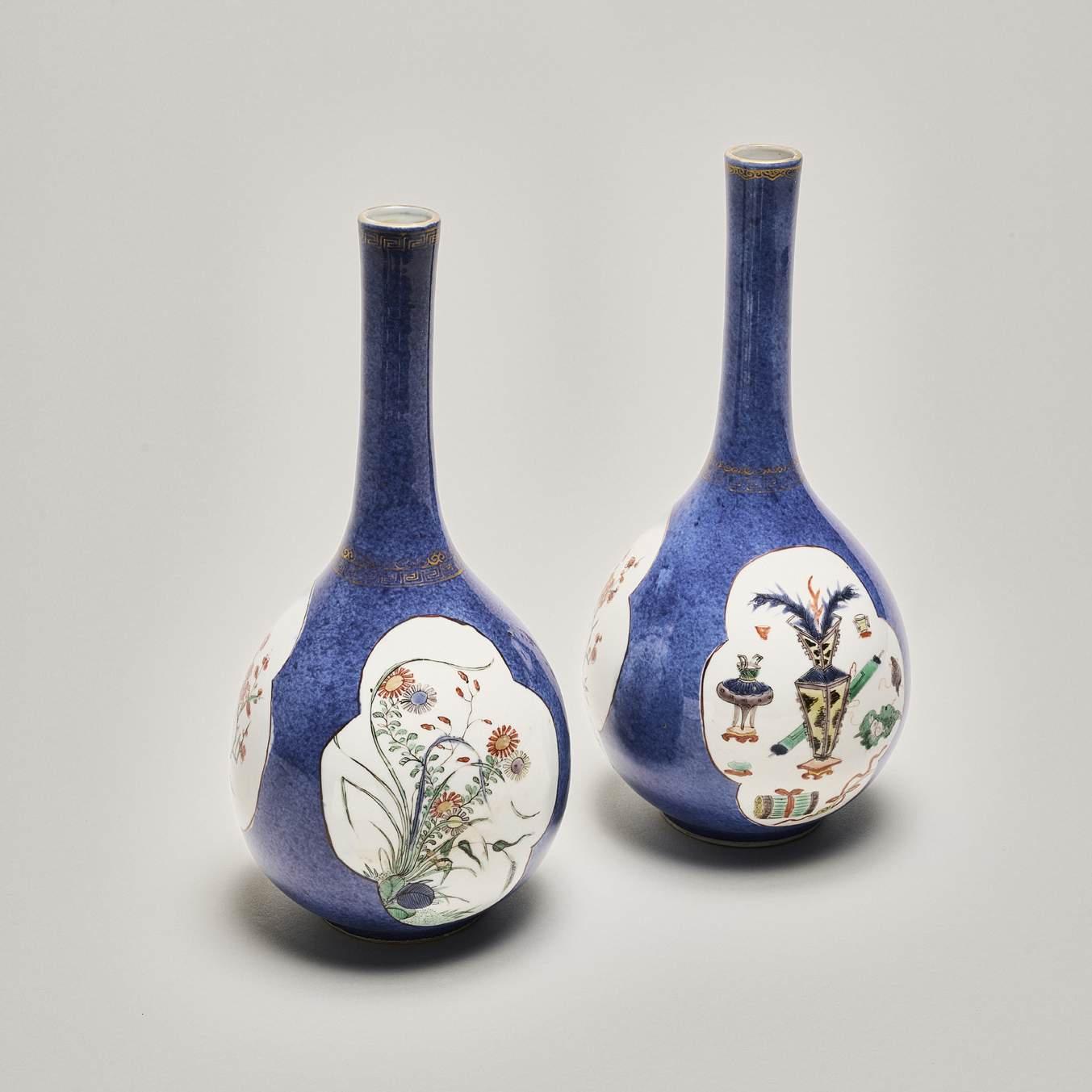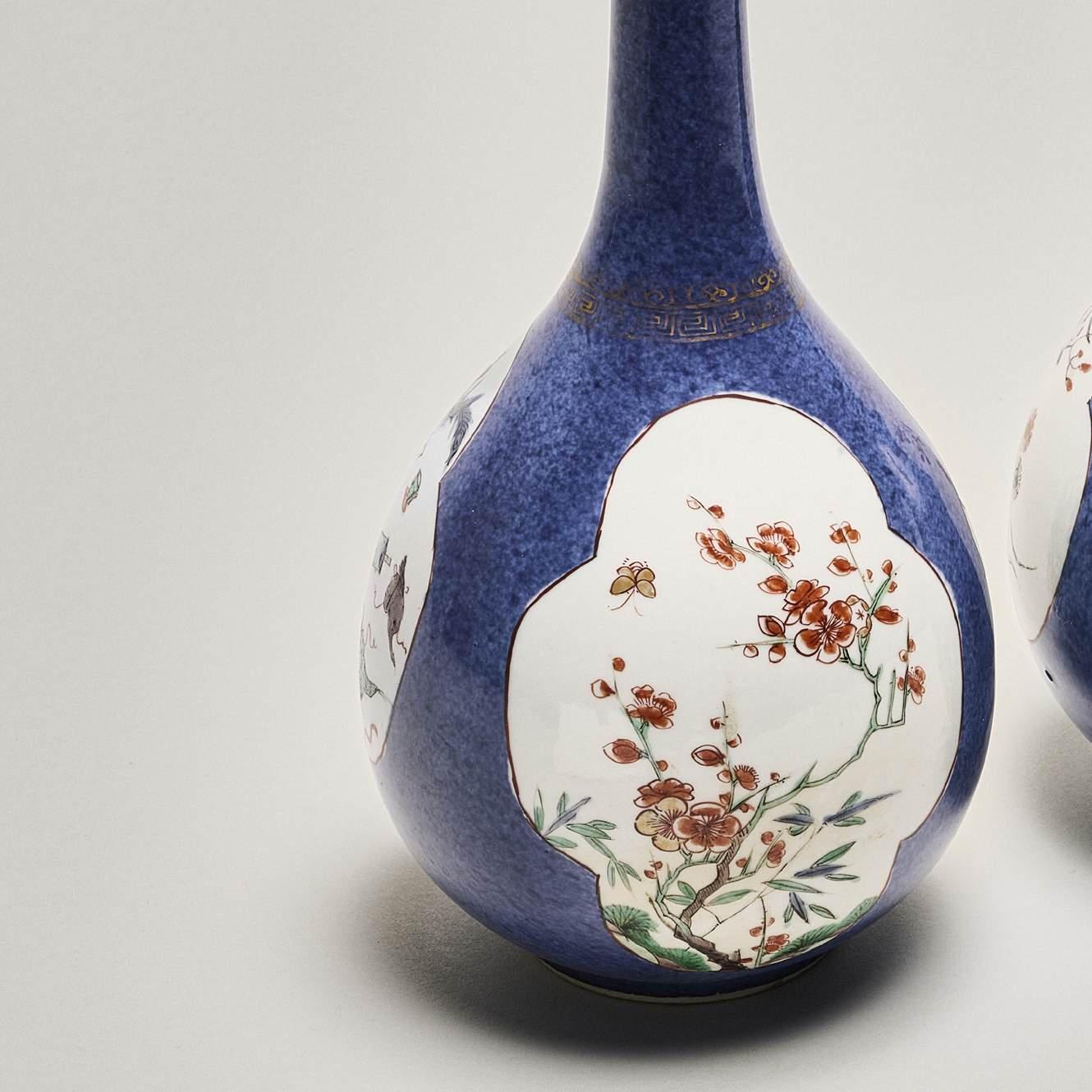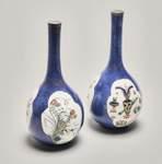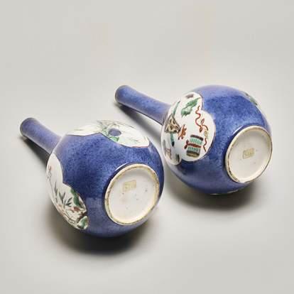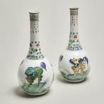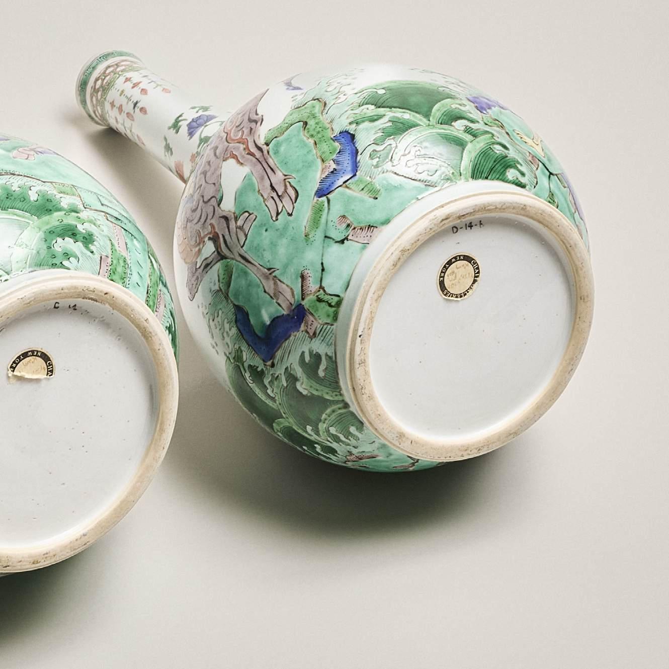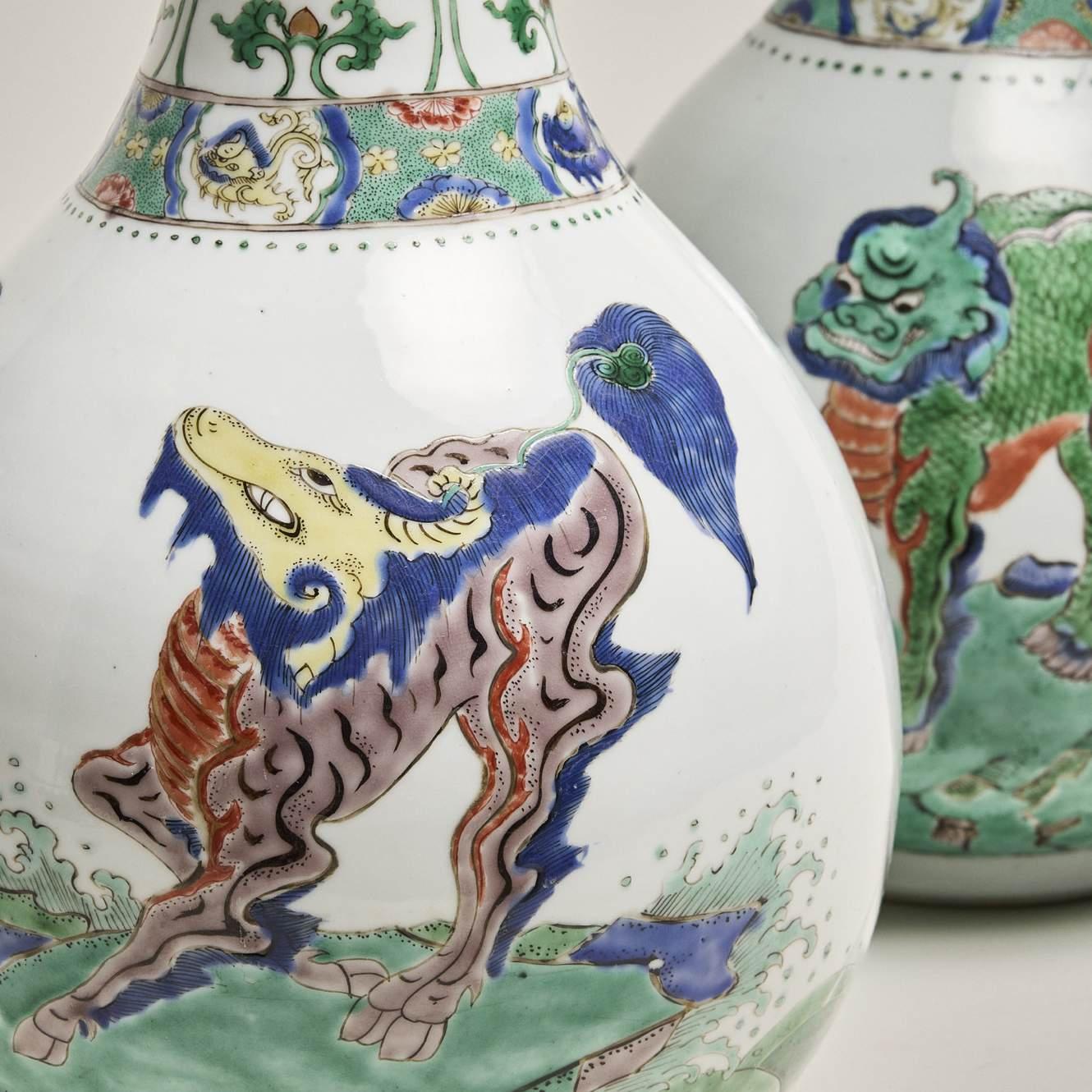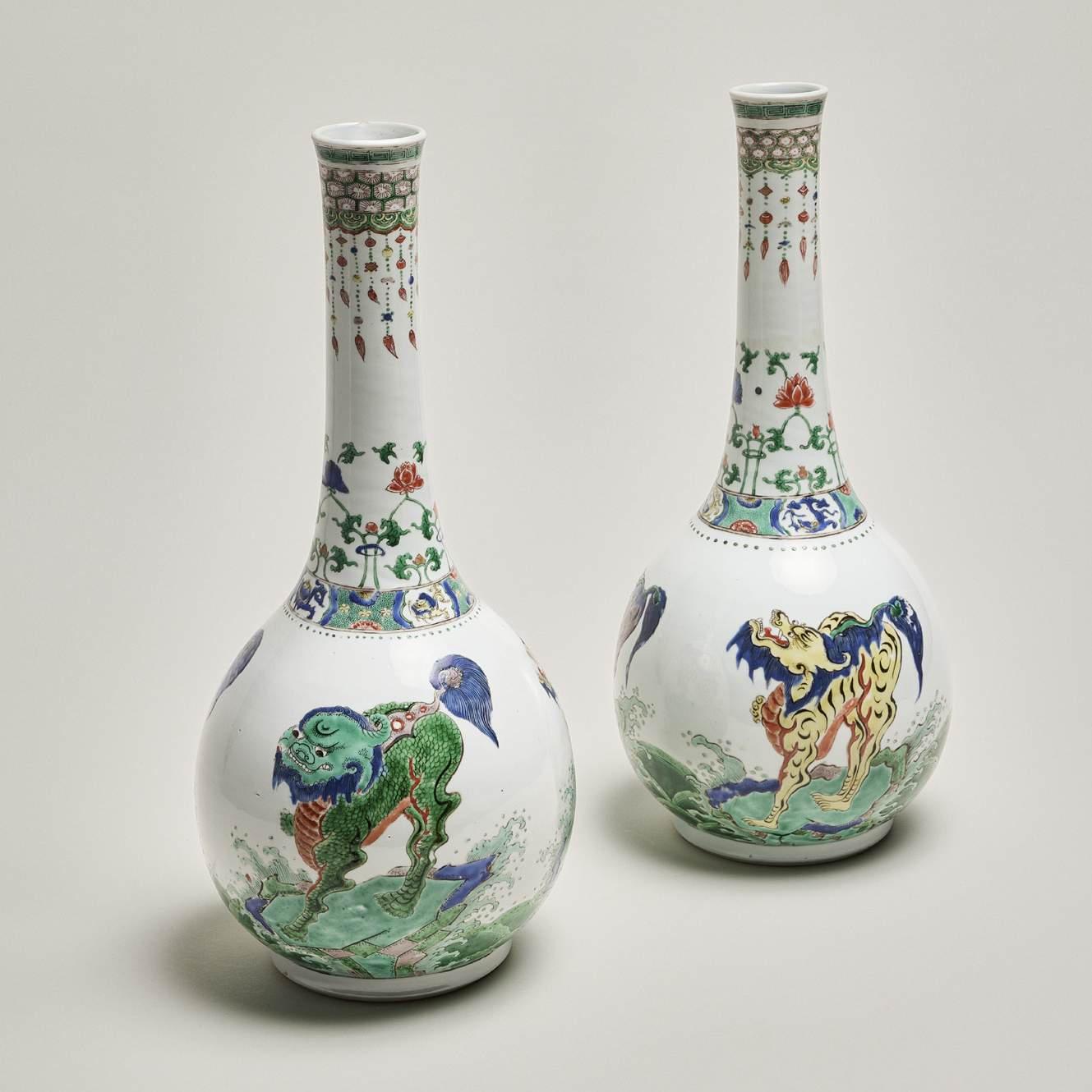 A pair of large bottles on a high foot-ring, lavishly decorated with mythical beasts in bright famille verte enamels. The rounded pearshaped body, tapers into a long cylindrical neck, flaring slightly at the mouth. The main decoration around the body is of three large auspicious animals, standing on rocks amongst waves. Each beast has red flames around their legs underlining their mythical powers. Around the shoulder is a green stippled band with flower heads, interrupted by four blue edged cartouches each with qilong dragons in yellow or blue. The lower part of the neck has lotus scrolls in green with red and blue buds and flowers. The top of the neck has pending tassels hanging from a band of green and yellow ruyi-yuntou 如意雲頭