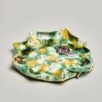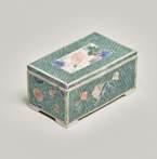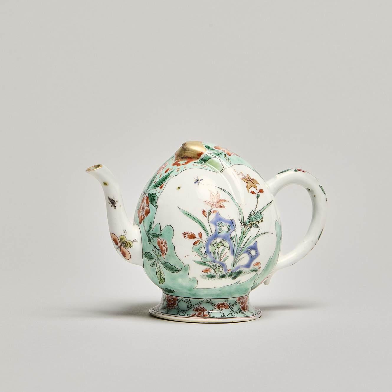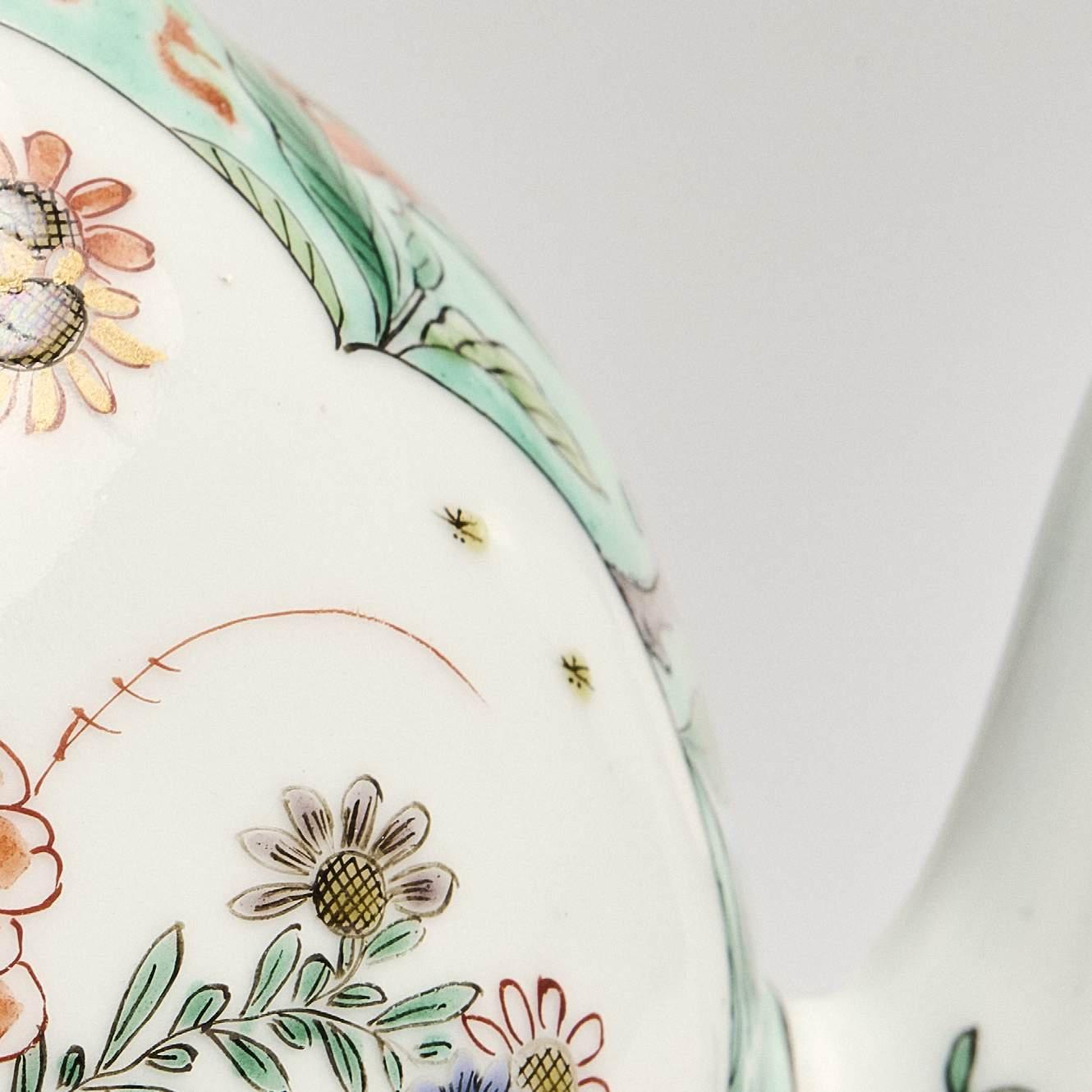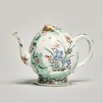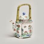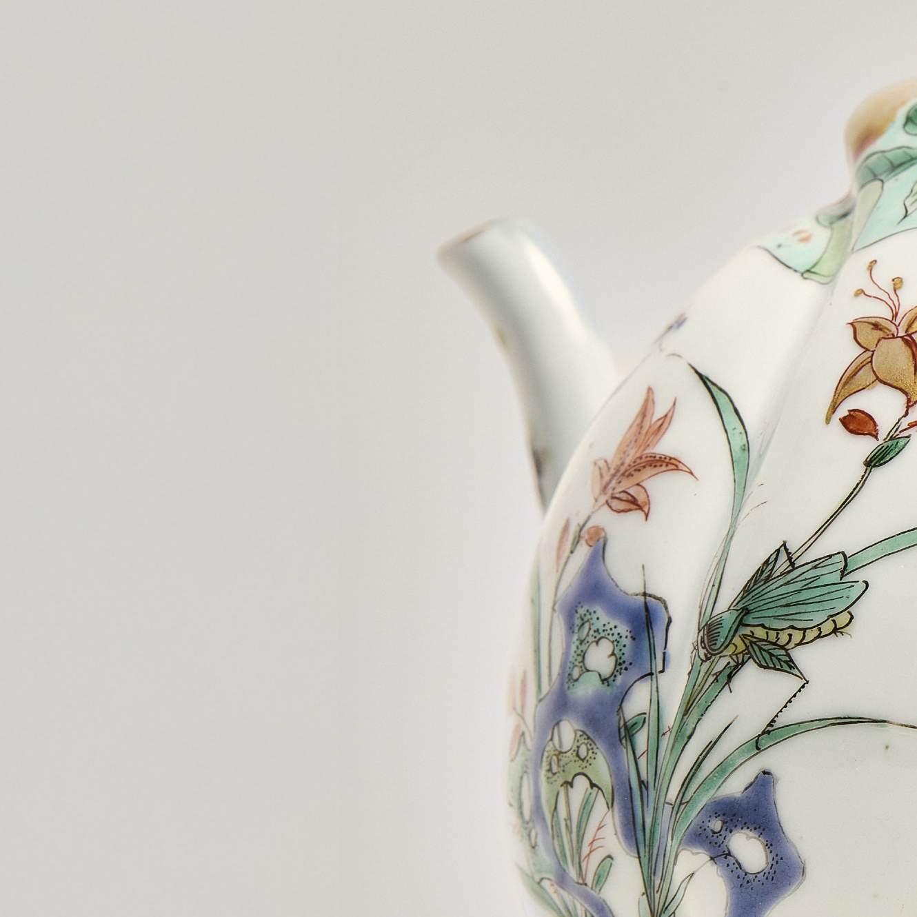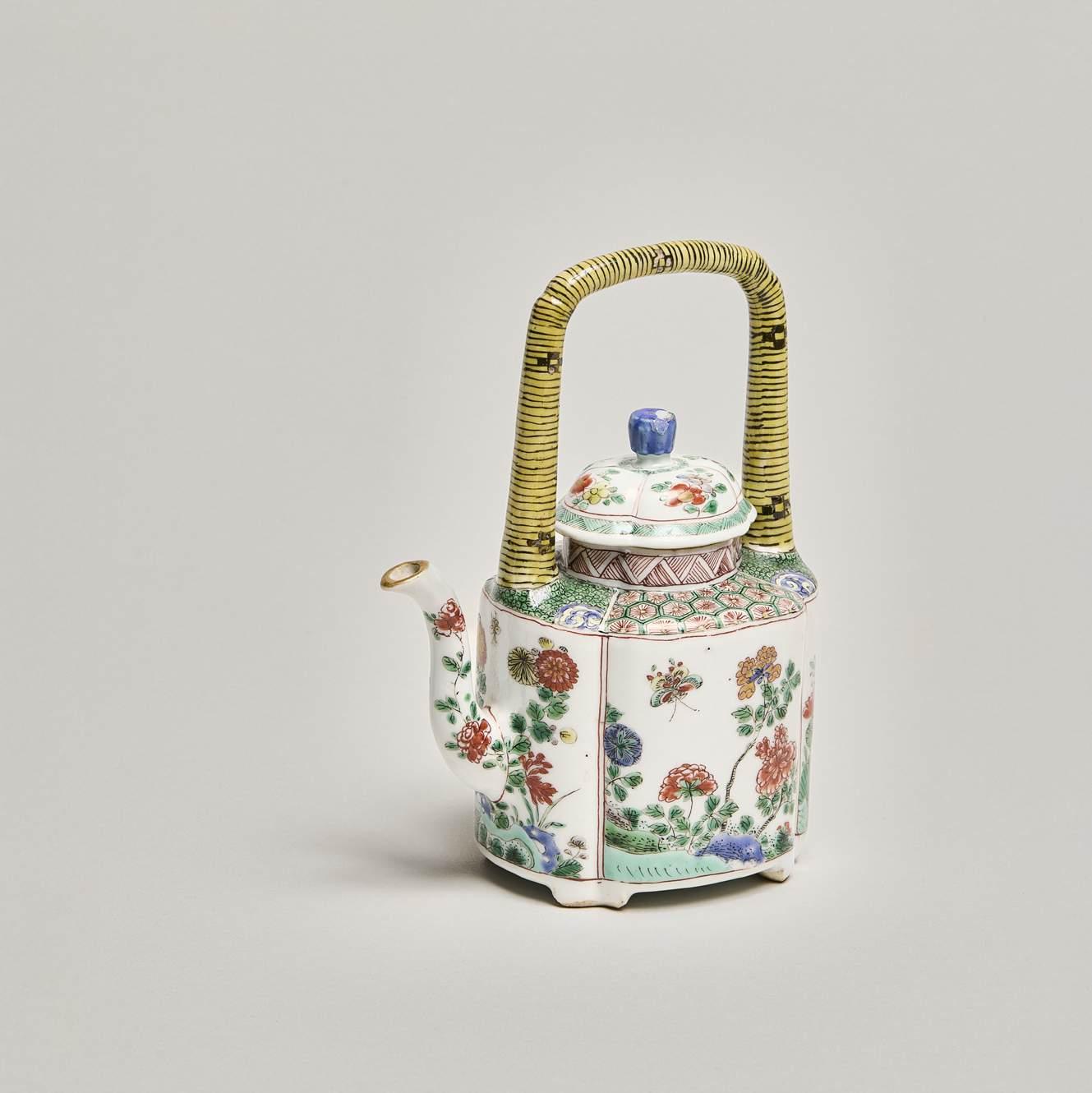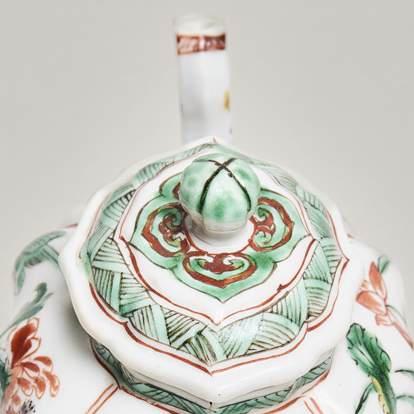 A wine pot with a quatrefoil ovoid section, a high neck, an s-shaped spout and tall arched handle. It stands on four small feet, which are indented to follow the shape of the body. Each lobe of the body, has a landscape with rocks, insects, and birds, painted in several shades of green, red, black, yellow, and aubergine enamels, with some flowers highlighted in gold. The shoulder of the wine pot has two diaper patterns, the sides have a green honeycomb with red starburst; the other two panels green ‘frog-spawn’. The neck is decorated with a chevron pattern in red. The domed lid has the same lobed quatrefoil shape, the four panels are decorated with flower sprays and edged with a green chevron pattern. The handle has been cleverly painted to resemble yellow cane or bamboo. The underside has a glossy transparent glaze.