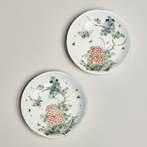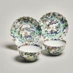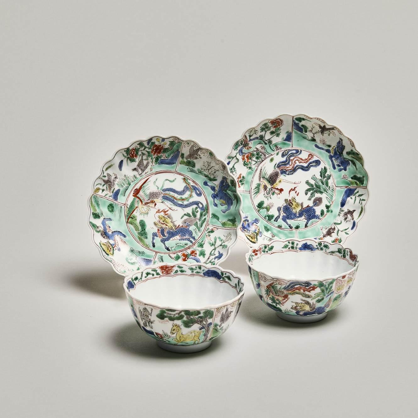 This pair of scallop-edged small bowls and saucers, are fluted to resemble a chrysanthemum flower. They are decorated in bright overglaze enamels in the famille verte palette of greens, red, blue, yellow and aubergine. The saucers have a large central panel with a colourful flying phoenix and a crouching qilin in a garden. The high curved rim, is divided into four panels outlined with a red line. Two have scenes with fabulous creatures, including a Buddhist lion and a Xiezhi. The other two panels are decorated with a scene of a bird on a rock, amongst peony and magnolia bushes; the other with mandarin ducks with reeds and flowers. The backs of the saucers have three simple sprays of peonies and on the base a simplified blossom within a double ring in underglaze blue.