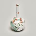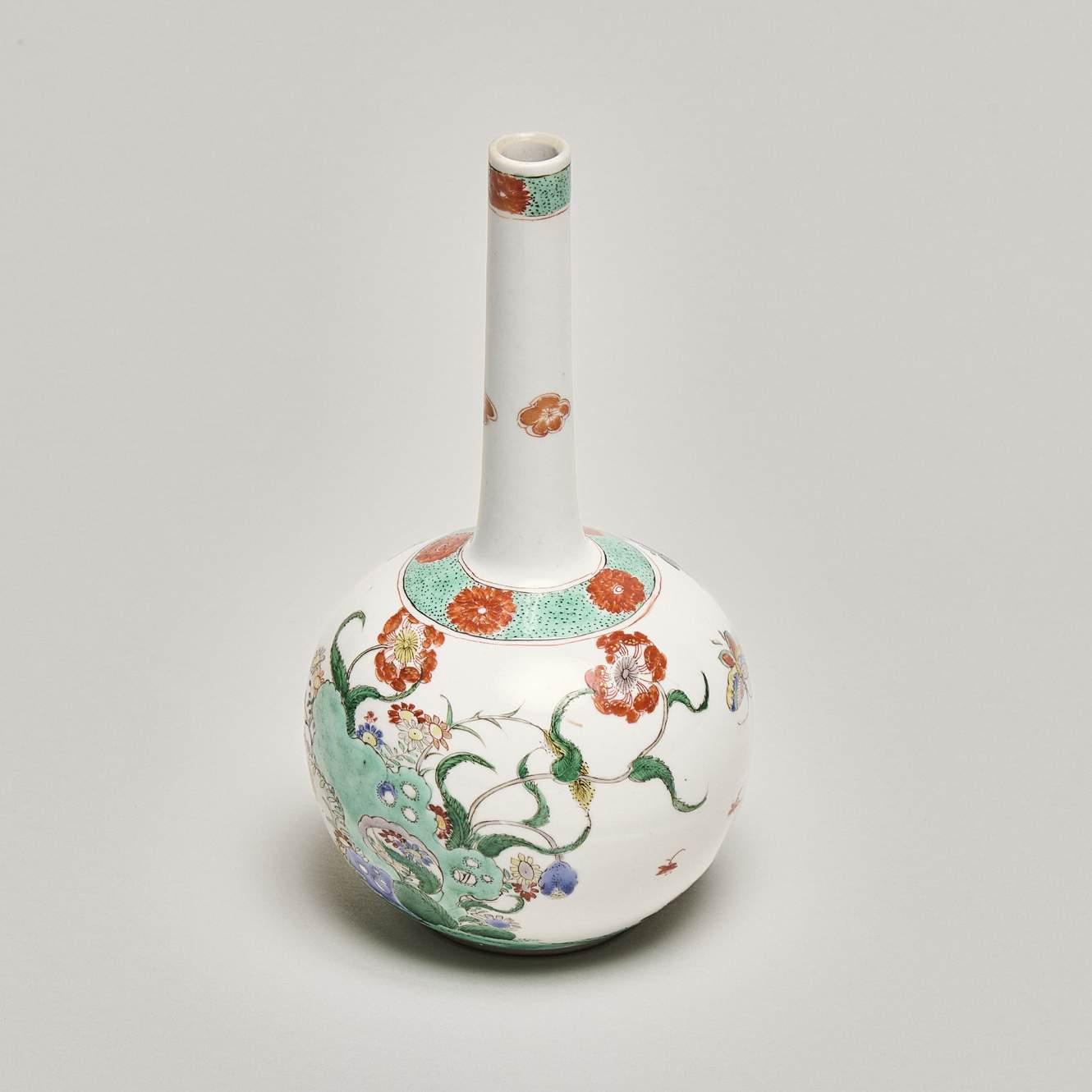 A famille verte bottle vase, with a globular body and straight slender neck. The body is decorated with rockwork, flowers and butterflies, in bright green, red, yellow and blue enamels - some flowers highlighted with gold. The neck has three single red blossoms; around both the mouth and shoulder is a matching band of red peony flowerheads on a green speckled ground. The base bears a letter in underglaze-blue, often identified as the Latin capital G or the Persian letter ye (ی).