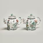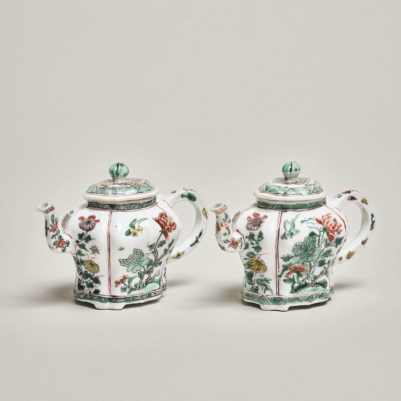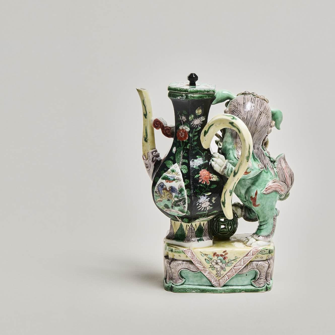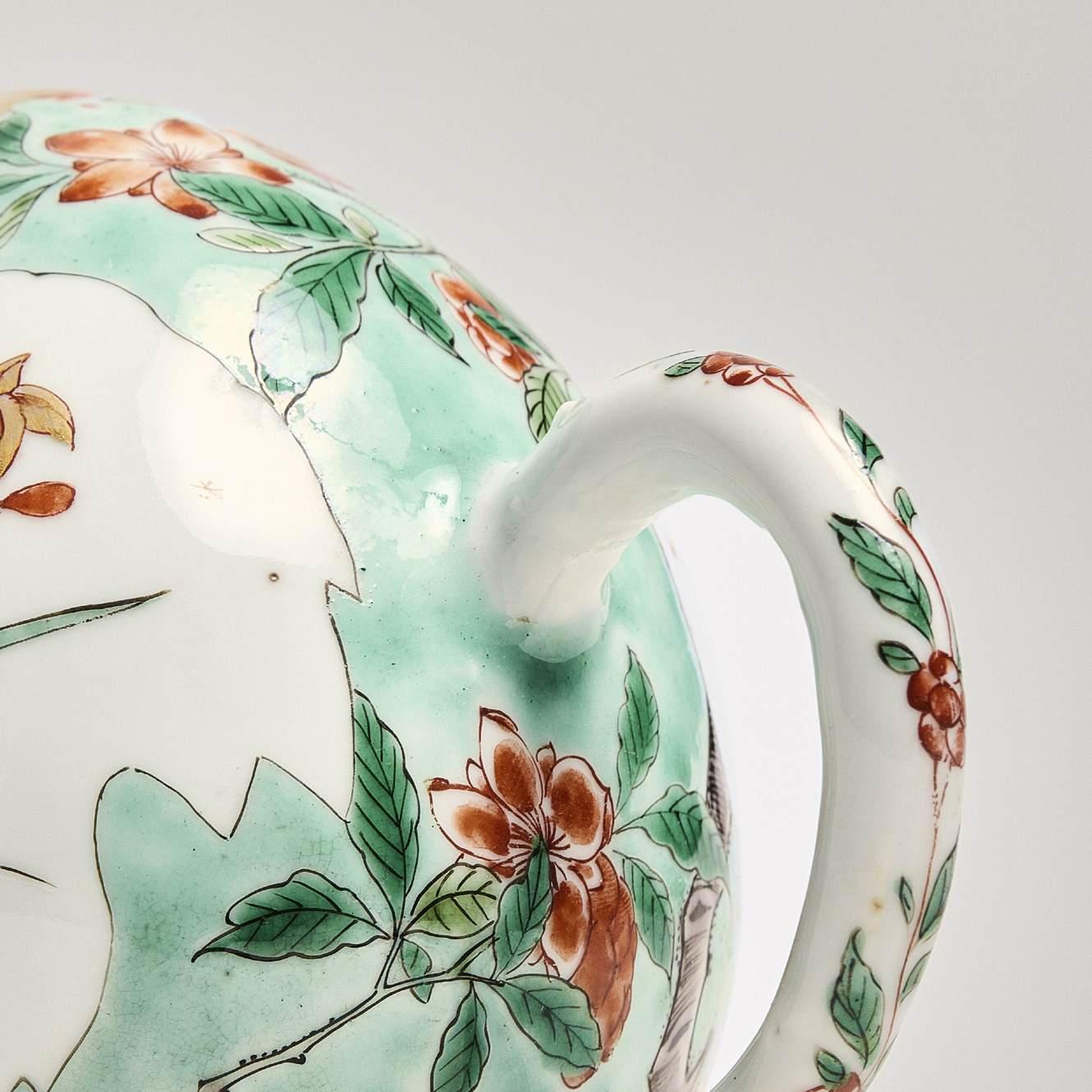 This type of coloured enamelling, using multiple shades of green, is referred to in the West as famille verte. In China these coloured wares are referred to as wucai (five colours) - particularly when all the coloured enamelling - including blue - were added after the first firing. Although these type of wine pots are often considered export porcelain, this shape with a high handle would have been used in China for serving warm rice wine or holding hot water.