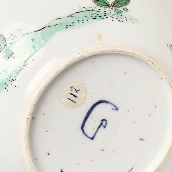 Similarly decorated vases - with the same letter mark - are in the Fitzwilliam Museum, Cambridge (inv.nrs. OC.14A-1938 & OC.14B-1938) and the Royal Porcelain Collection, Dresden (inv.nr. PO 4638). Dresden also has a bowl with the same mark (inv.nr. PO 6881). The Rijksmuseum has a pair of famille verte bottles as well as an underglaze blue vase - of a similar size and shape - also with the letter G. (inv.nr. AK-RKB 16303 & AK-RBK 16340). The Groninger Museum has a famille verte teapot with this mark (inv.nr. 1899-42).