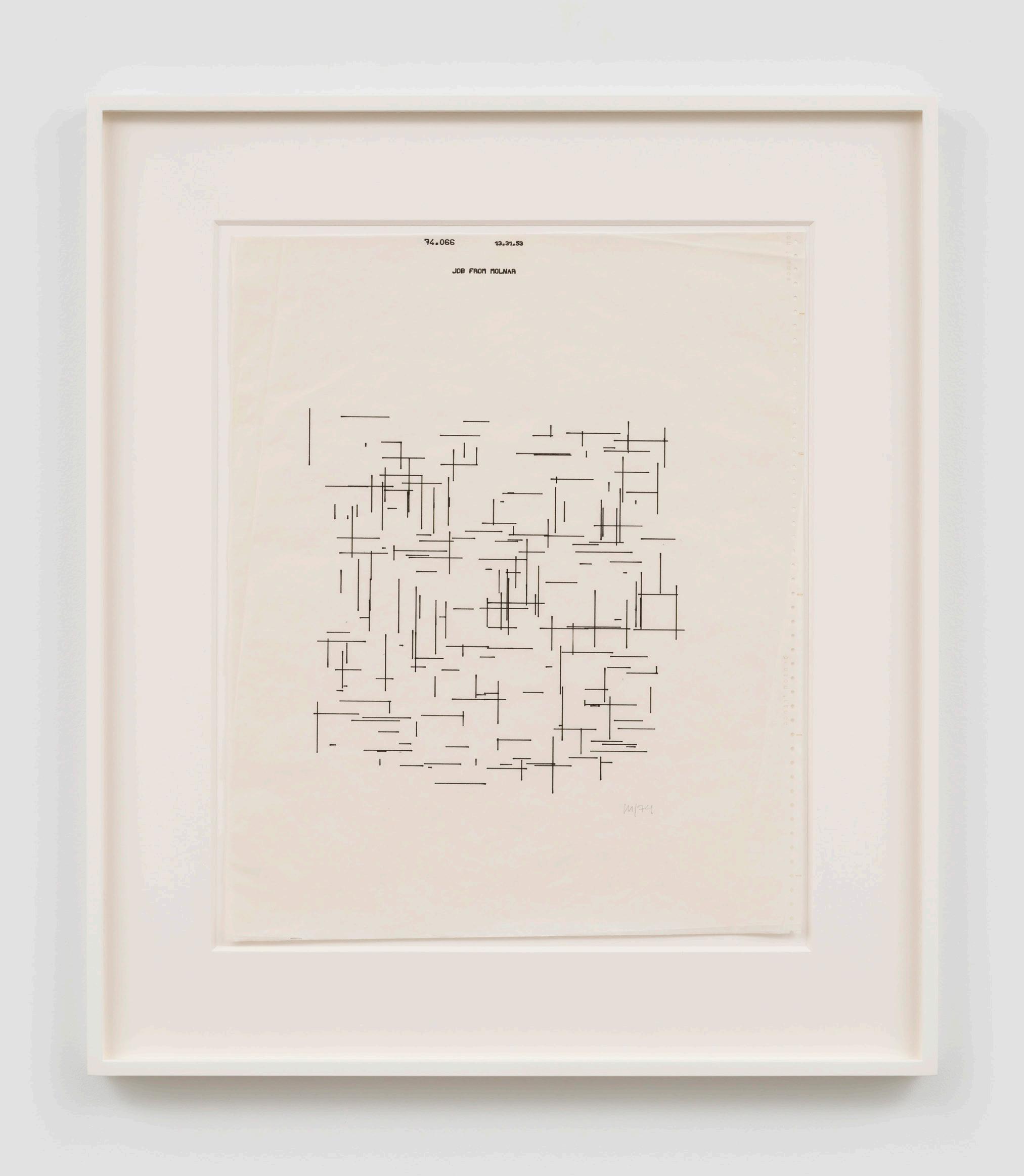 30 lignes (sur 60 possibles) au hasard liant 2 á 2 horizontale et verticale alternativement (30 lines out of 60 possibilities by chance linked 2 by 2 horizontal and vertical alternatively), 1959