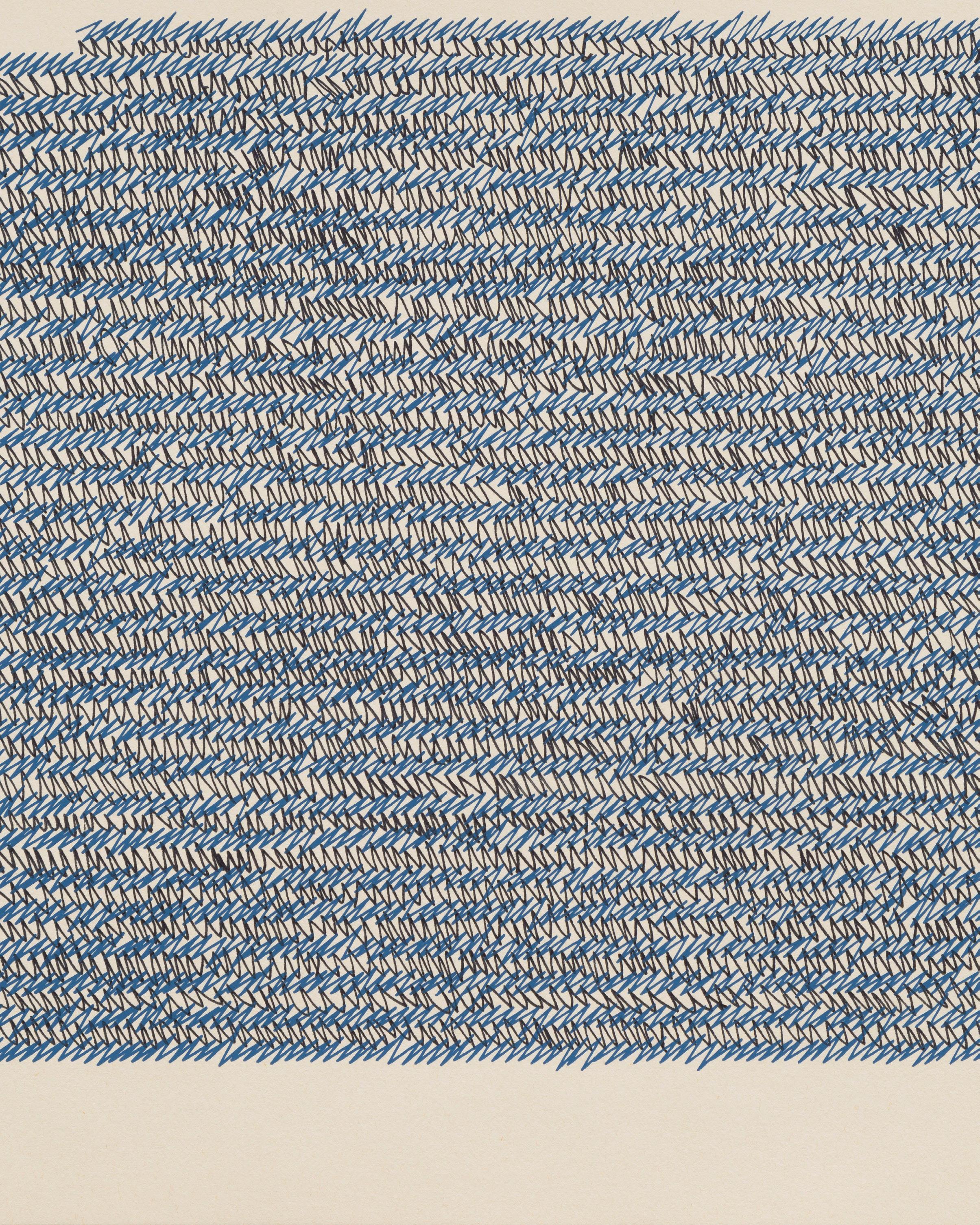 By 1960, Molnar had developed a working method, which she called the “imaginary machine,” in which she conceived simple programs that set forth how a form could be altered. She then executed all the possibilities by hand. The resulting drawings evoke Conceptual art, as it would develop in the second half of the 1960s—notably in Sol LeWitt’s work. Indeed Molnar’s 30 lines out of 60 possibilities by chance linked 2 by 2 horizontal and vertical alternatively (pg. 22) anticipates the instructional titles of LeWitt’s drawings. But while the Conceptual artist claimed that “the idea or concept is the most important aspect of the work” and “what the work of art looks like isn’t too important,” Molnar remained committed to executing the works and reserved the right to decide which ones were visually successful and worth keeping.4