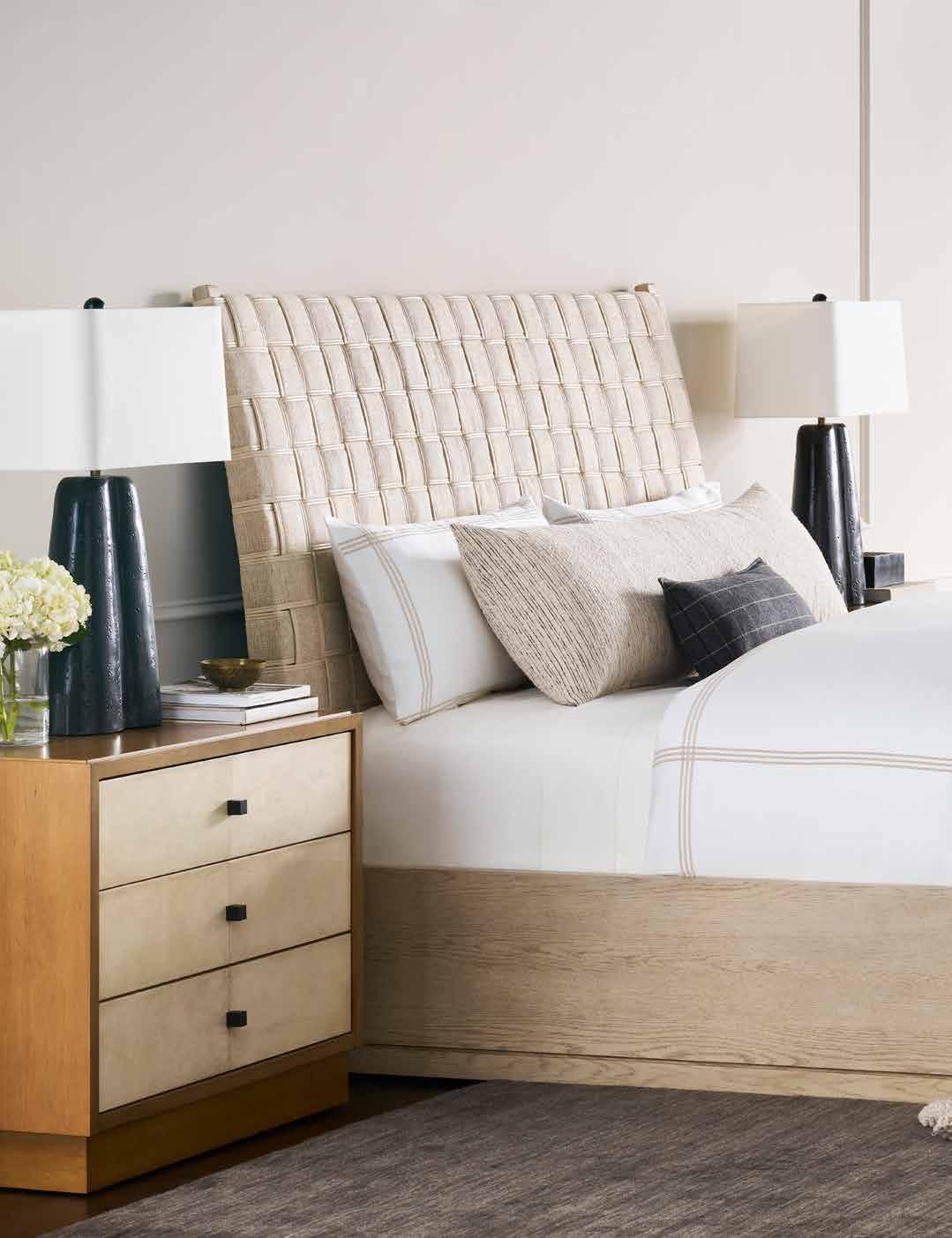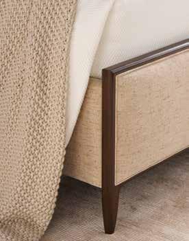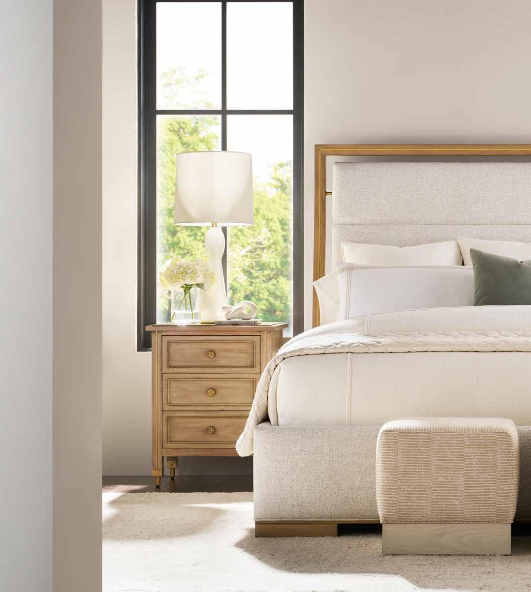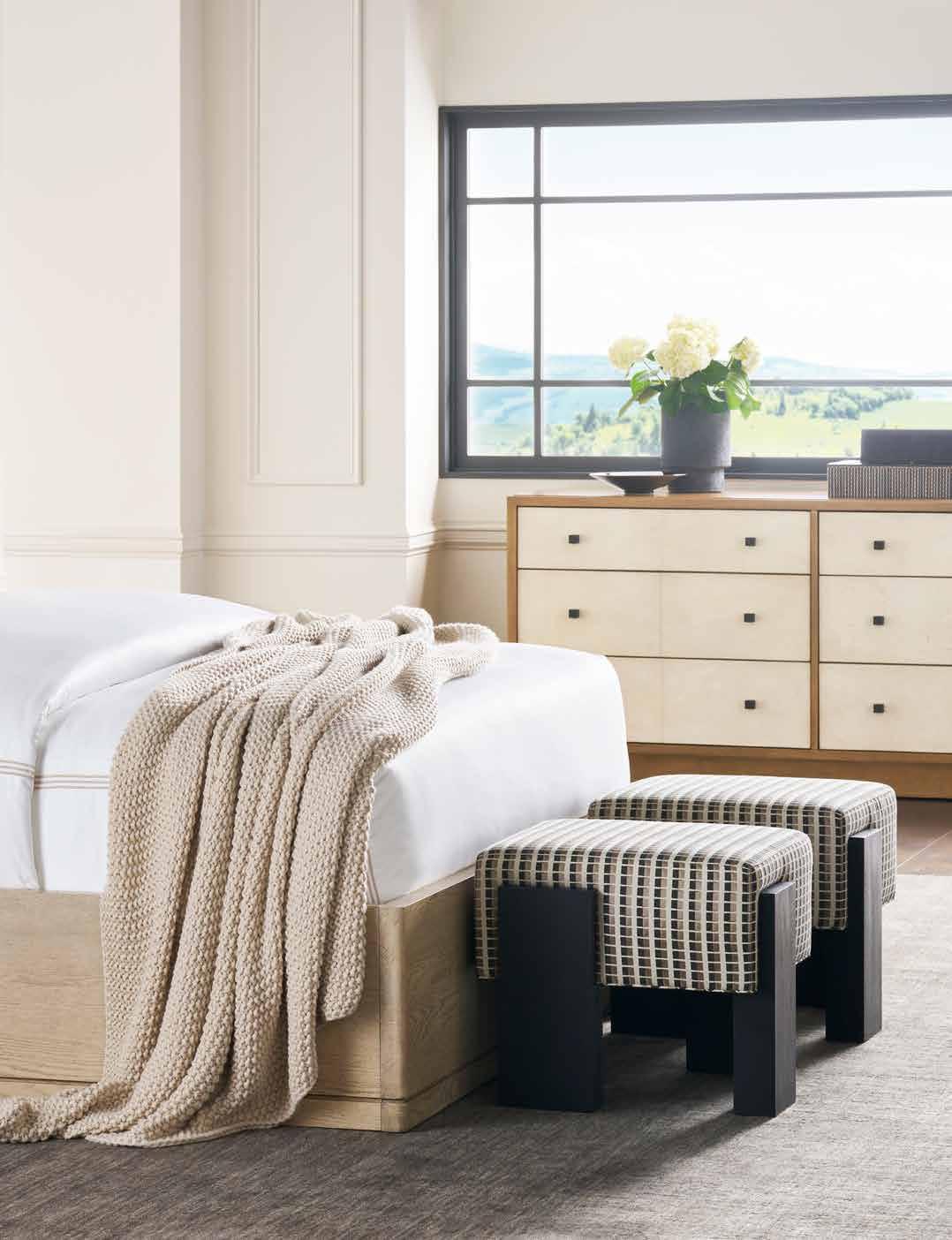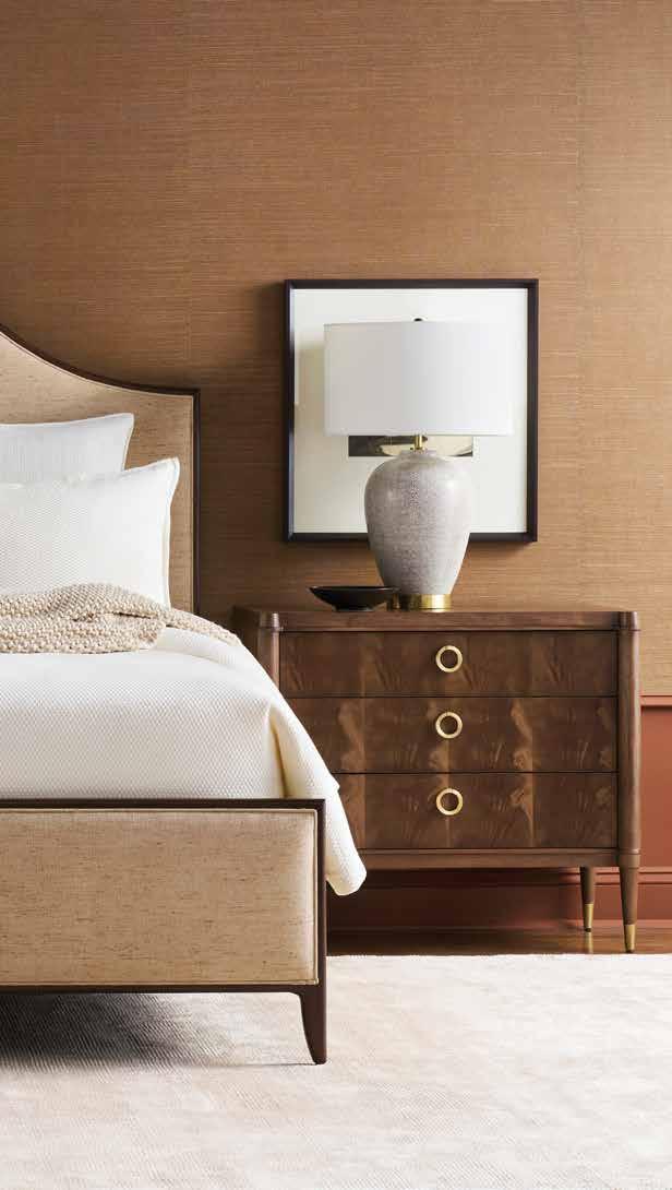A. WIMBORNE OTTOMANS V939-OT (2 shown) (W 19.5 D 19.5 H 19.5) Fabric: Fat Cat Sand. B. BELLE LOVESEAT V7006-L1 (Perspective) (W 72.5 D 34 H 30.5) Fabric: Kempsey Sheepskin; two standard 21" throw pillows in Esther Desert. Finish: Promiseland. Shown with one extra MPS21 pillow in Truvy Truffle (additional charge) C. RENDITION KING BED 8402K-OC (Stocked) . (W 80.5 D 84 H 68) Finish: Mocha. Bleached Crotch Mahogany Headboard with Radial Match Veneer Pattern, Bleached Crotch Mahogany Footboard, Bleached Flat Cut Mahogany Frame and Side Rails. D. RENDITION NIGHTSTAND 8401N1-OC (Stocked) (W 26 D 19.75 H 30) Finish: Mocha. Bleached Flat Cut Mahogany Veneers and Solids, Three Drawers, Lacquered Natural Brass Hardware and Ferrules. FOR MORE INFORMATION ON THE RENDITION COLLECTION, REFER TO PAGES 92-93.