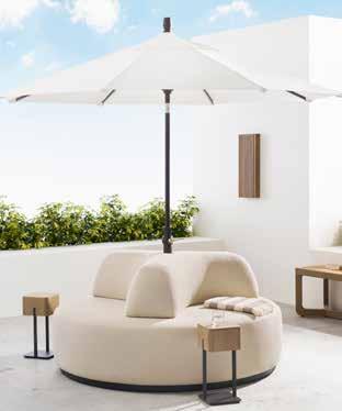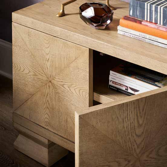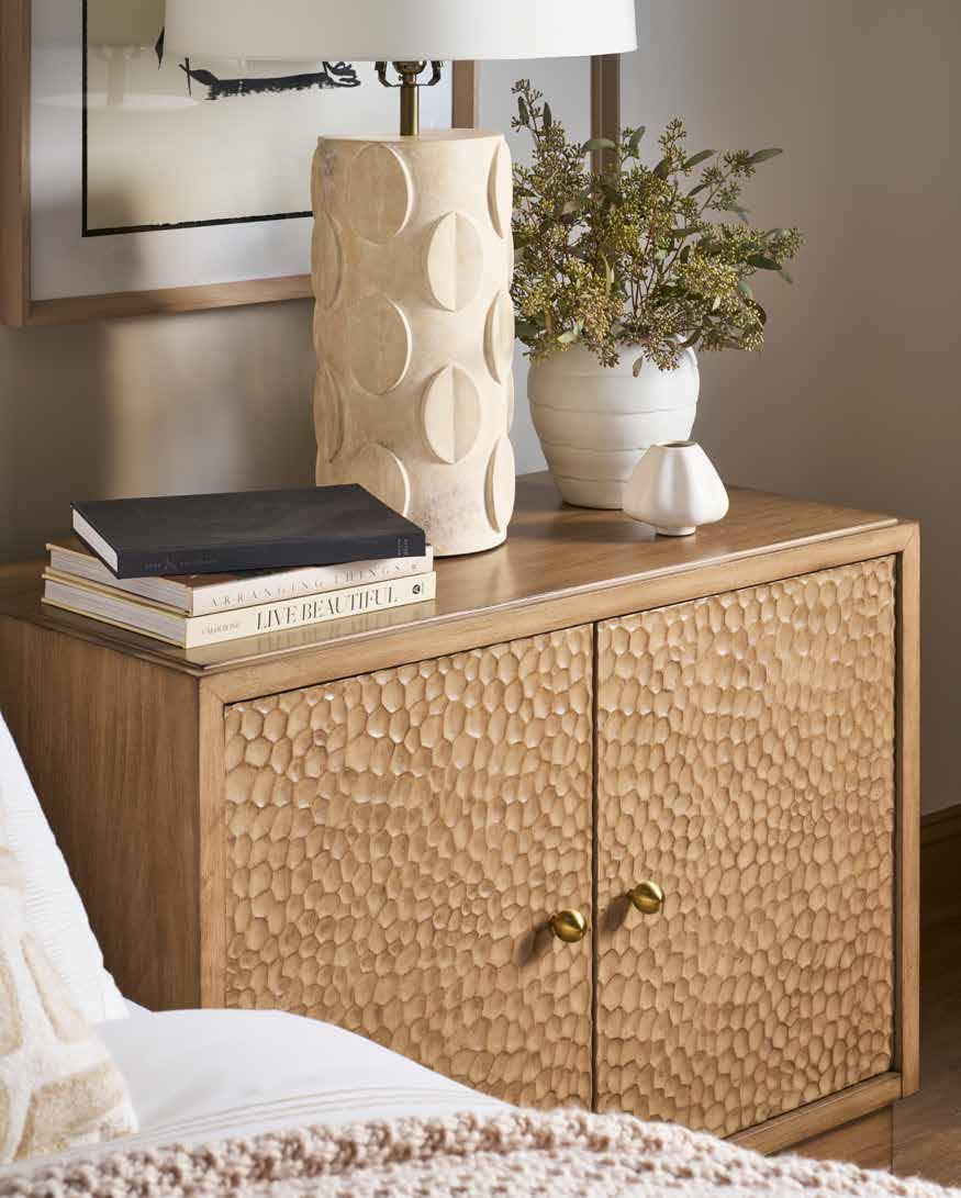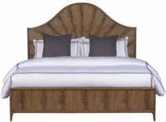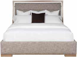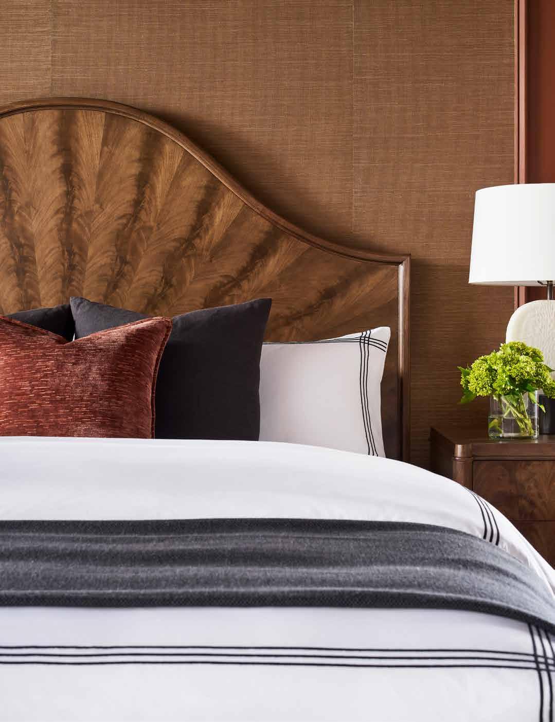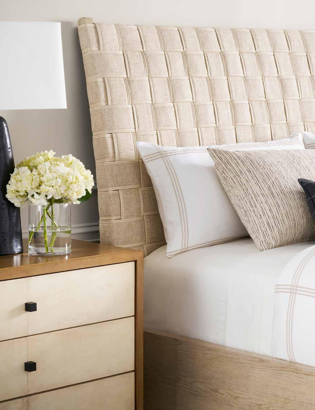 A. WIMBORNE OTTOMANS V939-OT (2 shown) (W 19.5 D 19.5 H 19.5) Fabric: Fat Cat Sand. B. BELLE LOVESEAT V7006-L1 (Perspective) (W 72.5 D 34 H 30.5) Fabric: Kempsey Sheepskin; two standard 21" throw pillows in Esther Desert. Finish: Promiseland. Shown with one extra MPS21 pillow in Truvy Truffle (additional charge) C. RENDITION KING BED 8402K-OC (Stocked) . (W 80.5 D 84 H 68) Finish: Mocha. Bleached Crotch Mahogany Headboard with Radial Match Veneer Pattern, Bleached Crotch Mahogany Footboard, Bleached Flat Cut Mahogany Frame and Side Rails. D. RENDITION NIGHTSTAND 8401N1-OC (Stocked) (W 26 D 19.75 H 30) Finish: Mocha. Bleached Flat Cut Mahogany Veneers and Solids, Three Drawers, Lacquered Natural Brass Hardware and Ferrules. FOR MORE INFORMATION ON THE RENDITION COLLECTION, REFER TO PAGES 92-93.