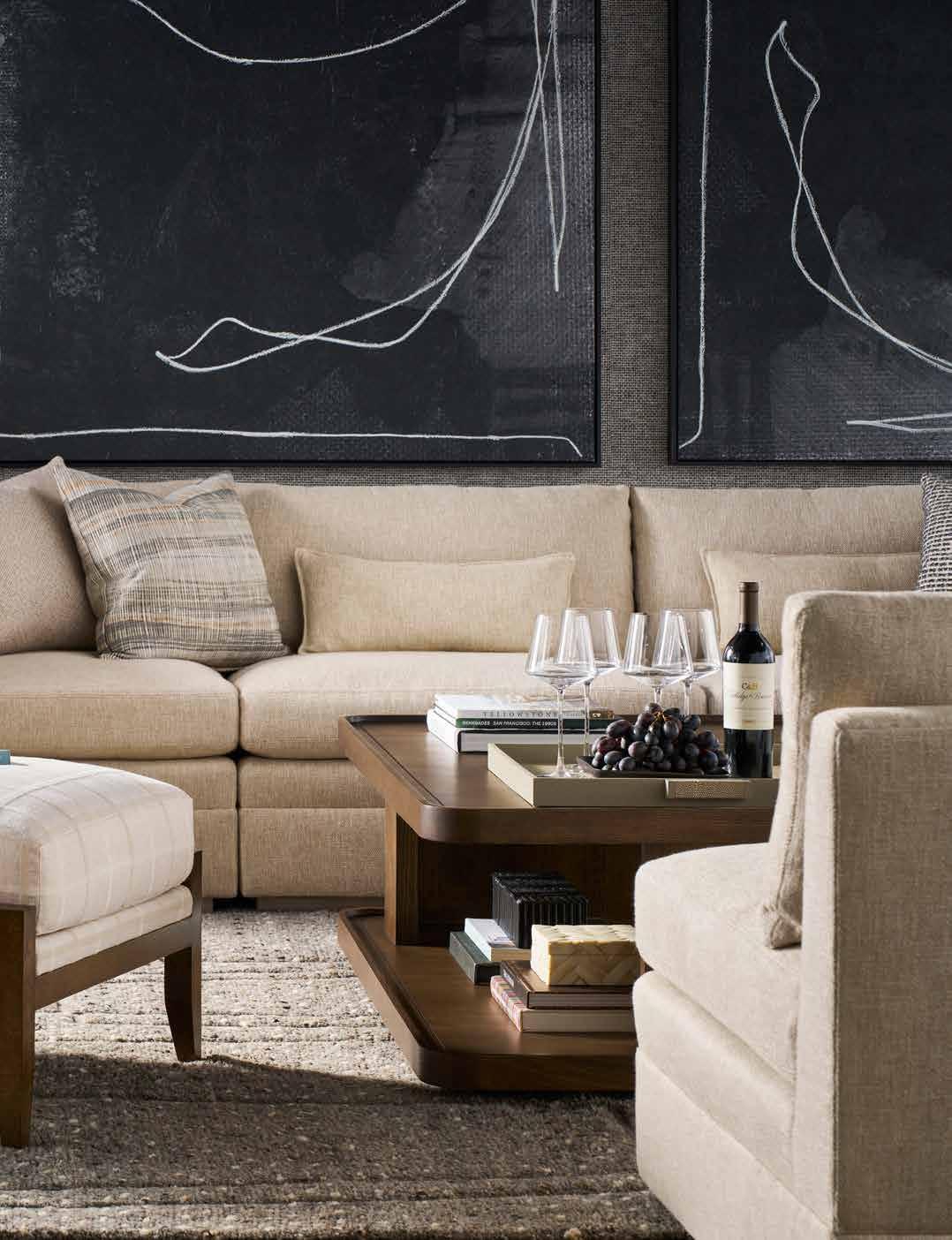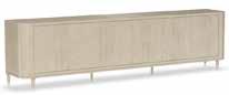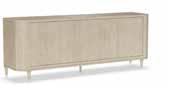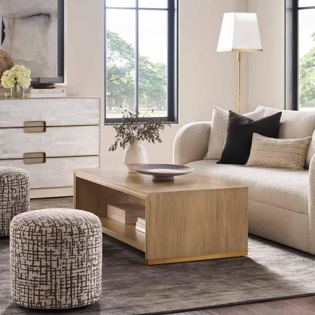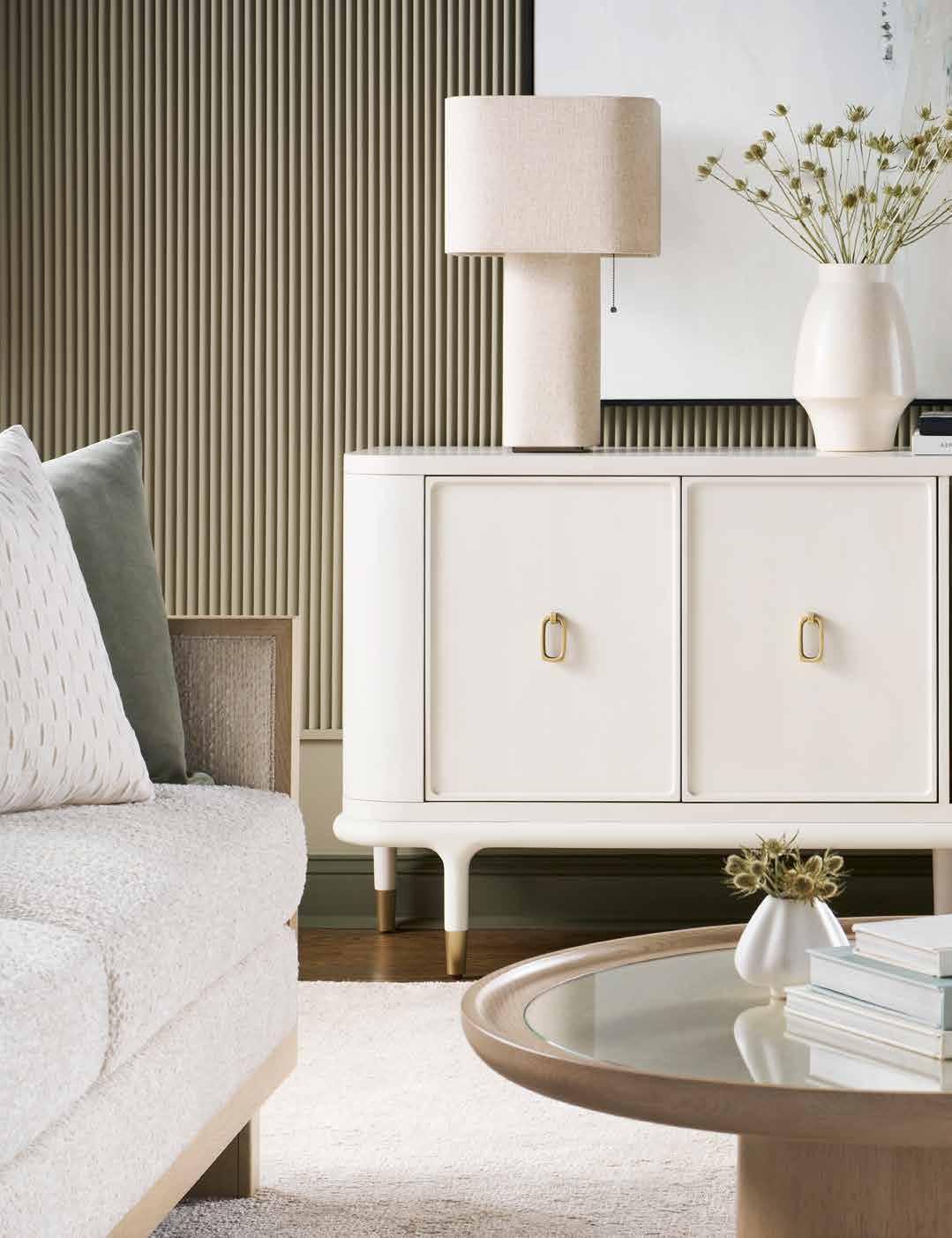 A. ATTITUDE TWO SEAT SOFA V1226-2S. (W 92.25 D 36.75 H 36) Fabric: Kibble Porcelain; two standard 21" throw pillows in Vesper Granite. Finish: Almond with Snowdrift Raffia Inset Panels. Wood Frame. Shown with two extra MPSP22 pillows in Cecilia Sand. B. PIERSON STORAGE CABINET CC110P (Make It Yours Storage) (W 83 D 20 H 34.75) Finish: Casa Blanca. Tall Retro Base with Metal Ferrules in Satin Brass, Premium Curved Frame Face (upcharge) , Textured Pendant Hardware in Satin Brass/One Centered on Each Door, Four Doors, One Adjustable Shelf Behind Each Set of Doors. C. ENTWINE COCKTAIL TABLE P585L. (W 36 D 36 H 20) Finish: Almond with Snowdrift Raffia. Wirebrushed Oak Base, Raffia on Inset Top with Glass Overlay. Can Nest with P585E and P585C. D. DAYDREAM STOCKED SWIVEL CHAIR TV118-SW (Stocked Ease) (W 32.5 D 30.5 H 29) Fabric: Reynolds Linen. Finish: Almond. Oak Solids and Veneers, 360 Degree Swivel. FOR MORE INFORMATION ON MAKE IT YOUR STORAGE, REFER TO PAGES 96-99.
