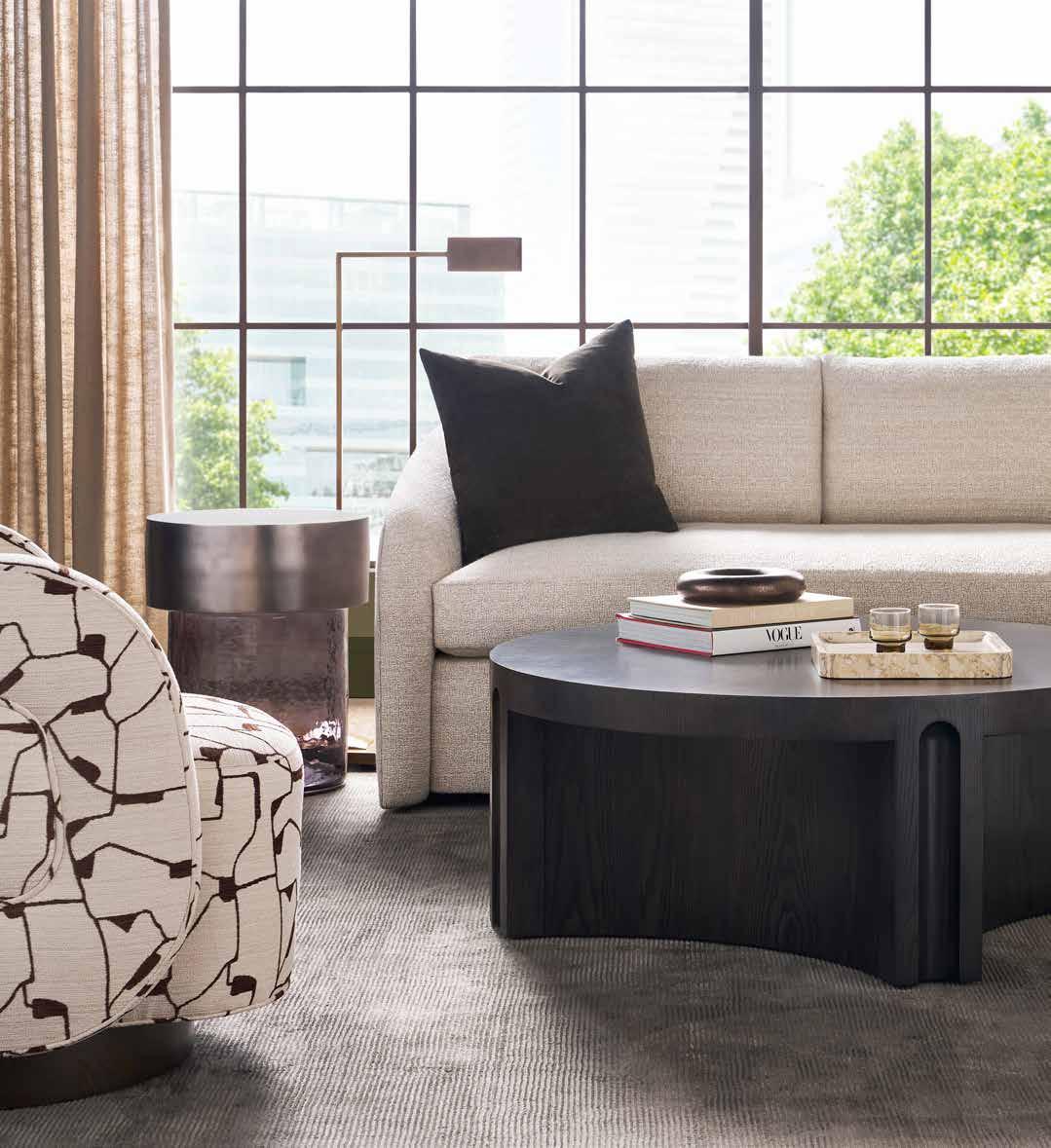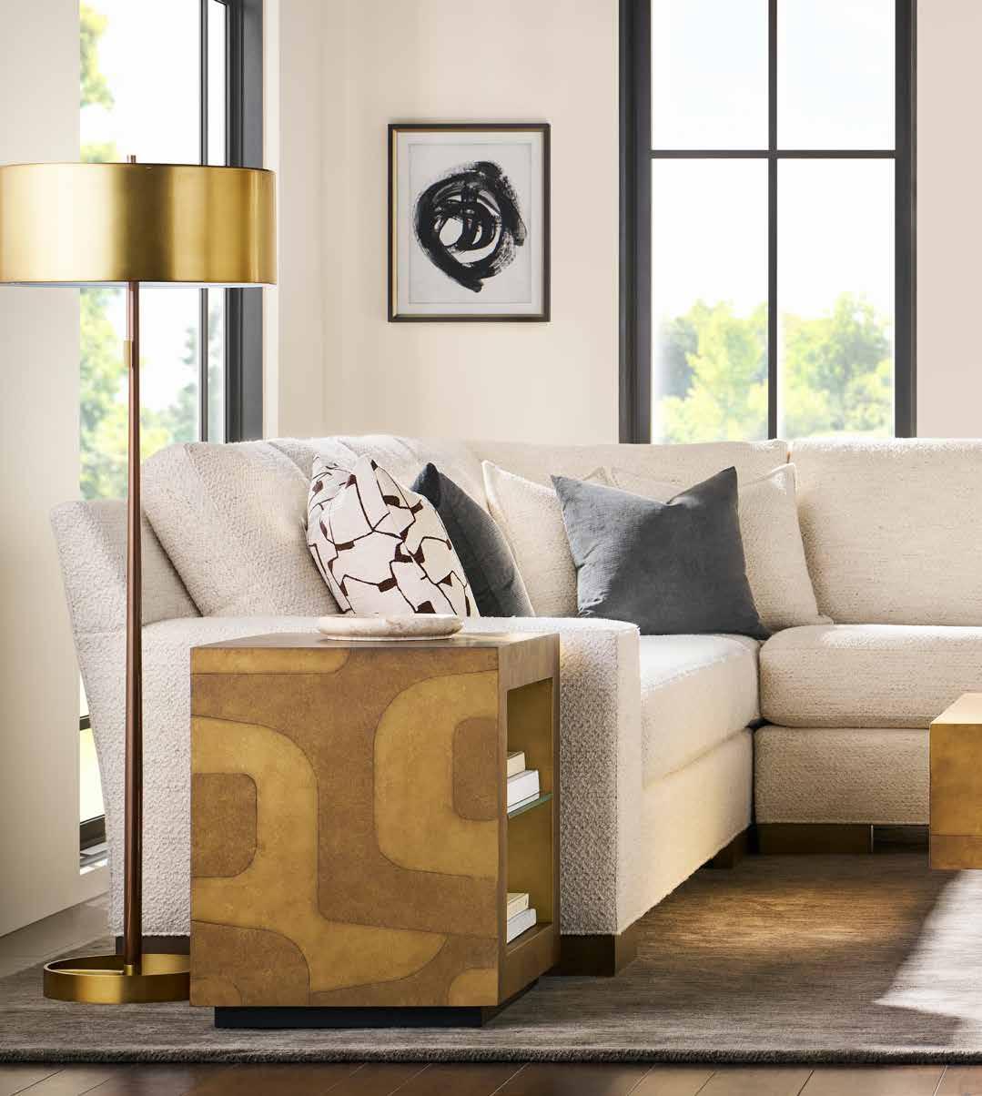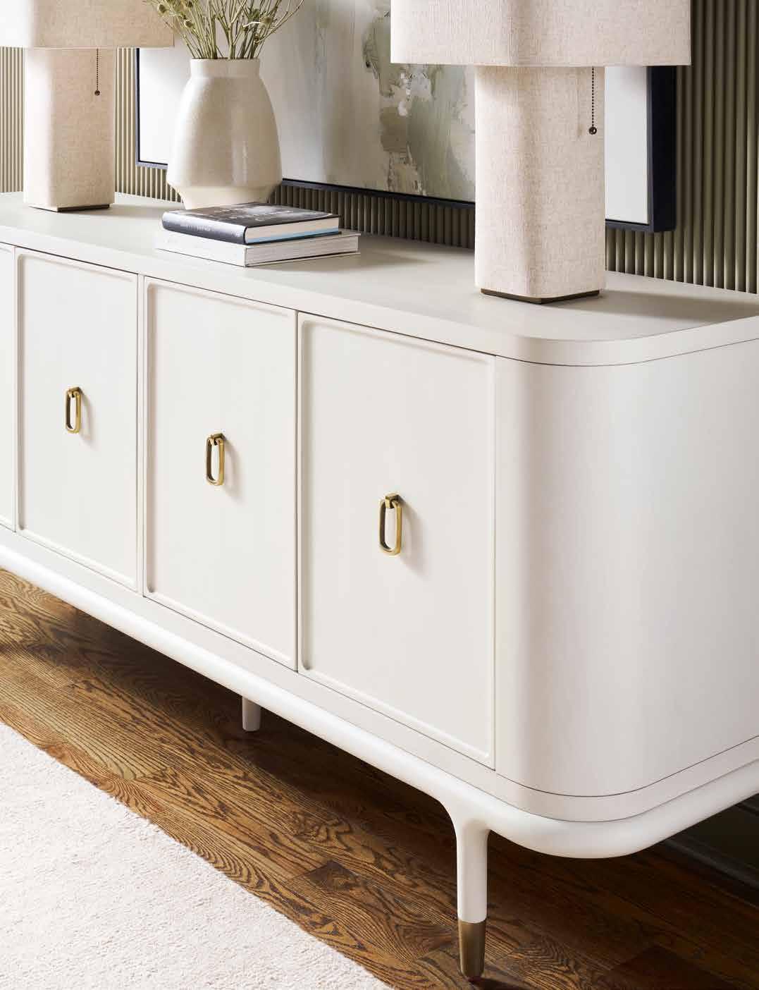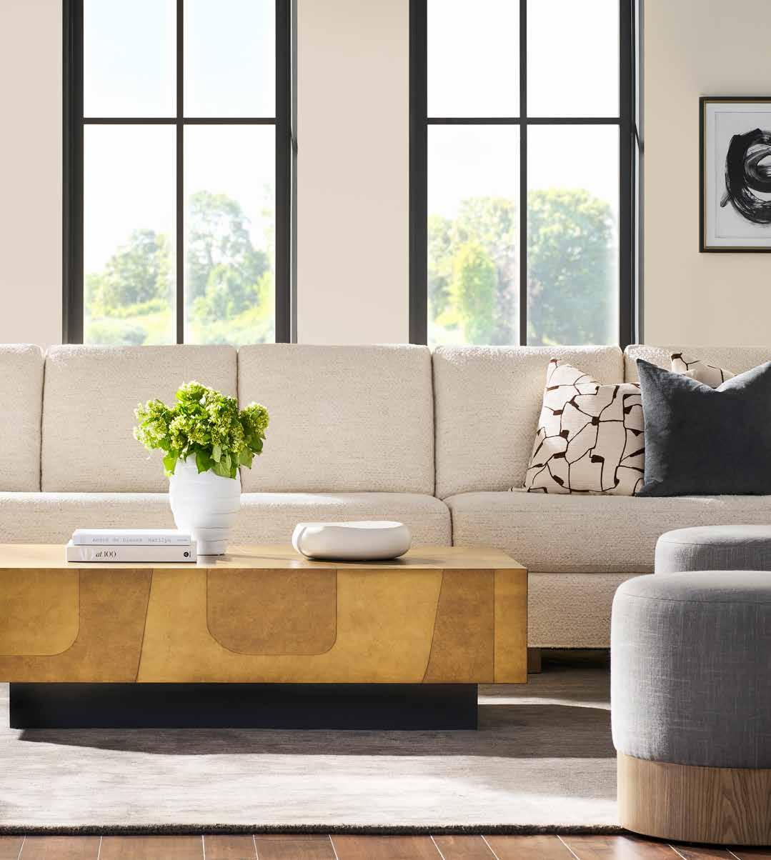 A. ATTITUDE TWO SEAT SOFA V1226-2S. (W 92.25 D 36.75 H 36) Fabric: Kibble Porcelain; two standard 21" throw pillows in Vesper Granite. Finish: Almond with Snowdrift Raffia Inset Panels. Wood Frame. Shown with two extra MPSP22 pillows in Cecilia Sand. B. PIERSON STORAGE CABINET CC110P (Make It Yours Storage) (W 83 D 20 H 34.75) Finish: Casa Blanca. Tall Retro Base with Metal Ferrules in Satin Brass, Premium Curved Frame Face (upcharge) , Textured Pendant Hardware in Satin Brass/One Centered on Each Door, Four Doors, One Adjustable Shelf Behind Each Set of Doors. C. ENTWINE COCKTAIL TABLE P585L. (W 36 D 36 H 20) Finish: Almond with Snowdrift Raffia. Wirebrushed Oak Base, Raffia on Inset Top with Glass Overlay. Can Nest with P585E and P585C. D. DAYDREAM STOCKED SWIVEL CHAIR TV118-SW (Stocked Ease) (W 32.5 D 30.5 H 29) Fabric: Reynolds Linen. Finish: Almond. Oak Solids and Veneers, 360 Degree Swivel. FOR MORE INFORMATION ON MAKE IT YOUR STORAGE, REFER TO PAGES 96-99.