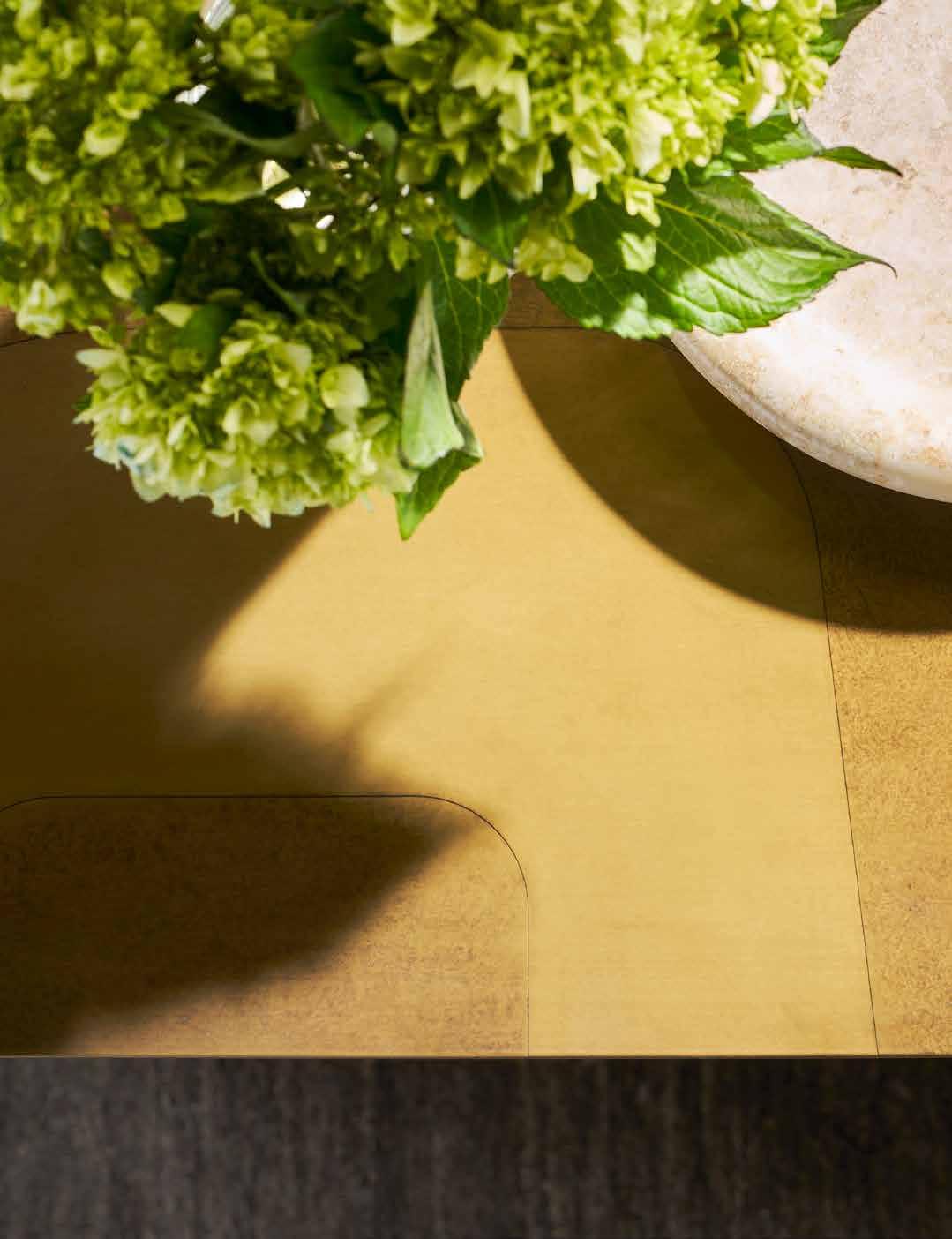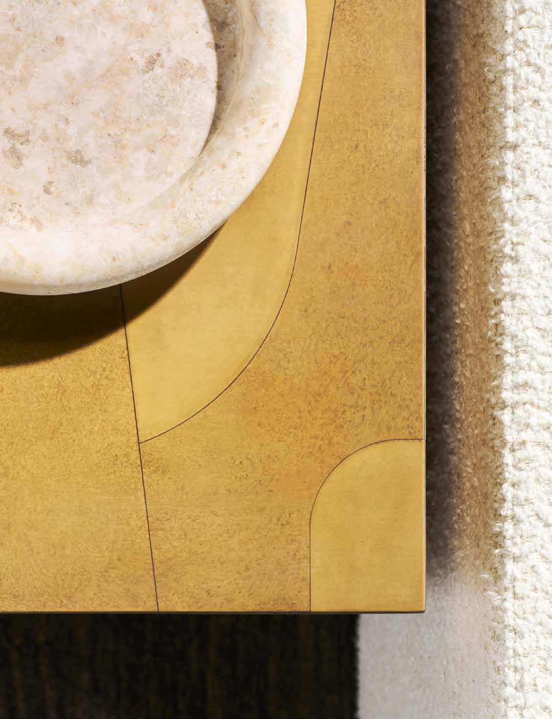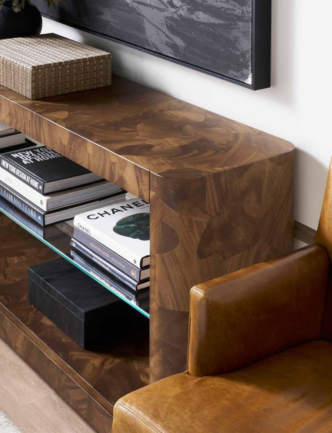 A. VERGE CONSOLE P845S. (W 72 D 16 H 30) Finish: Saddle. Crazy-cut Mahogany and Bleached Flat Cut Mahogany Veneers and Solids, Adjustable Tempered Glass Shelf, Inset Plinth Base. B. RUDIN LEATHER ARM CHAIR L1178APL. (W 25 D 25 H 32.25) Leather: Mont Blanc Tarragon. Finish: Film Noir. Plain Back. C. VERGE COCKTAIL TABLE P845CR-LD (Stocked) (W 56 D 32 H 18) Finish: Almond. Crazy-cut Mahogany and Bleached Flat Cut Mahogany Veneers and Solids. D. VERGE END TABLE P845L-LD (Stocked) (W 30 D 20 H 25) Finish: Almond.