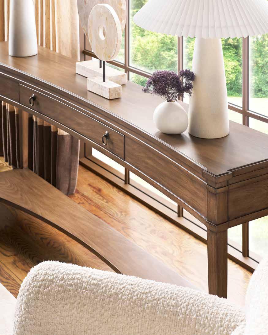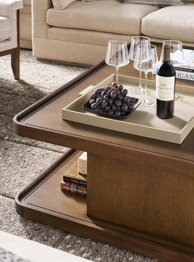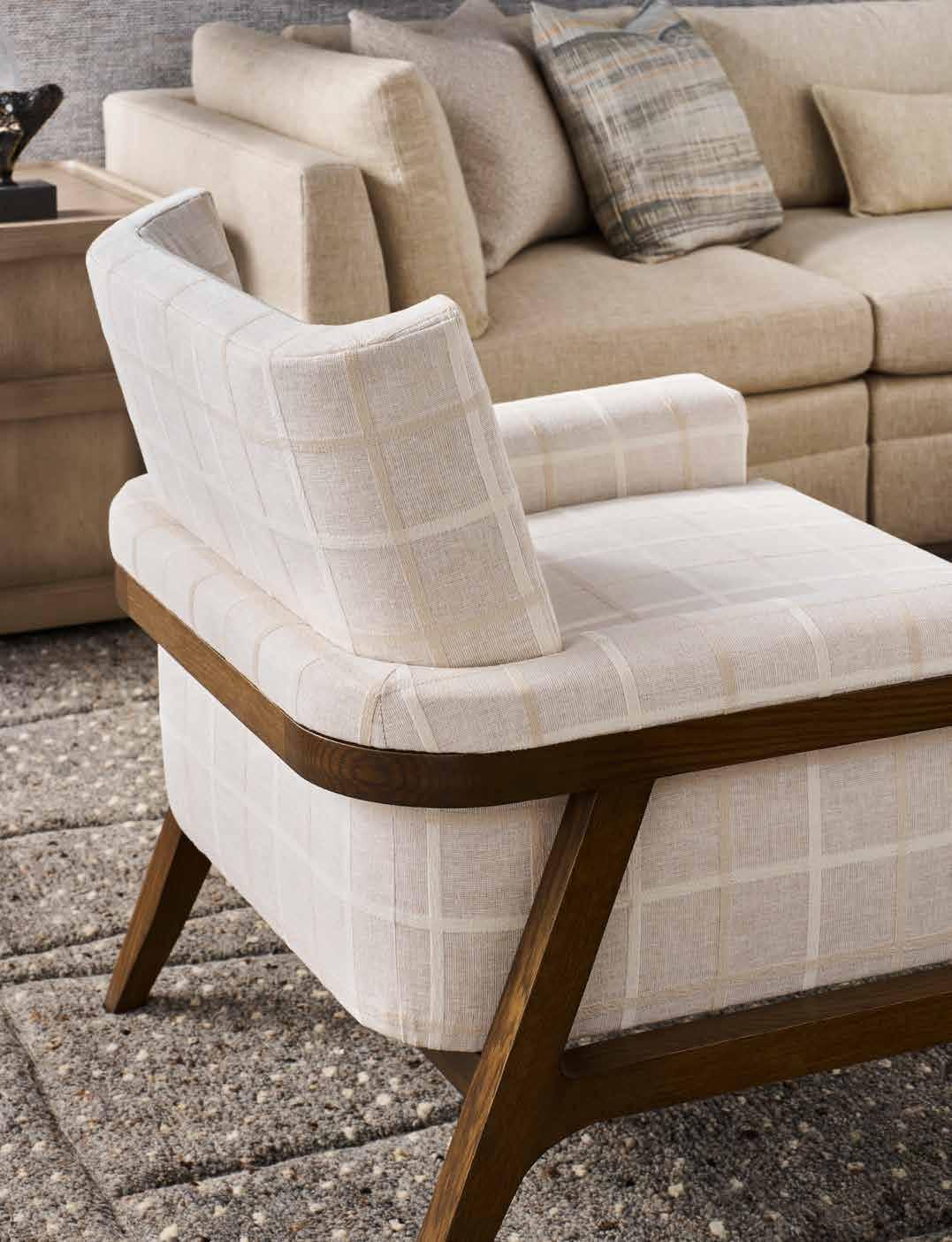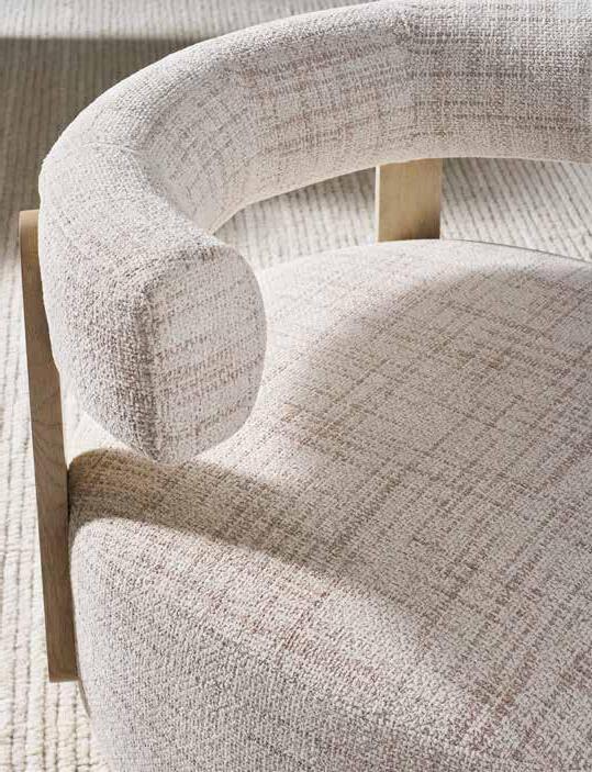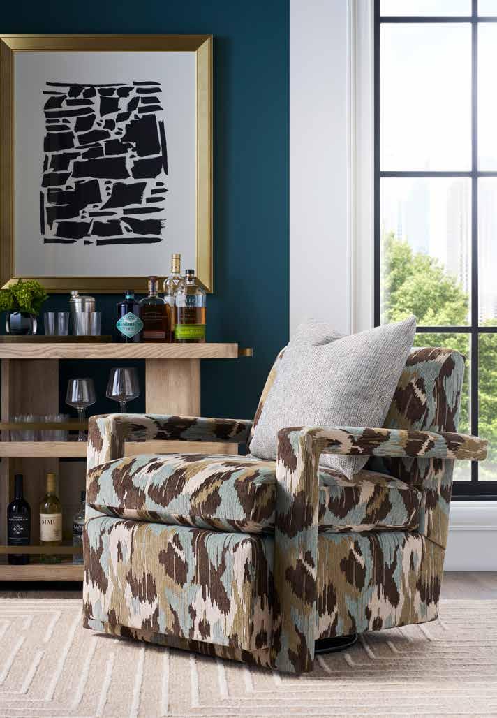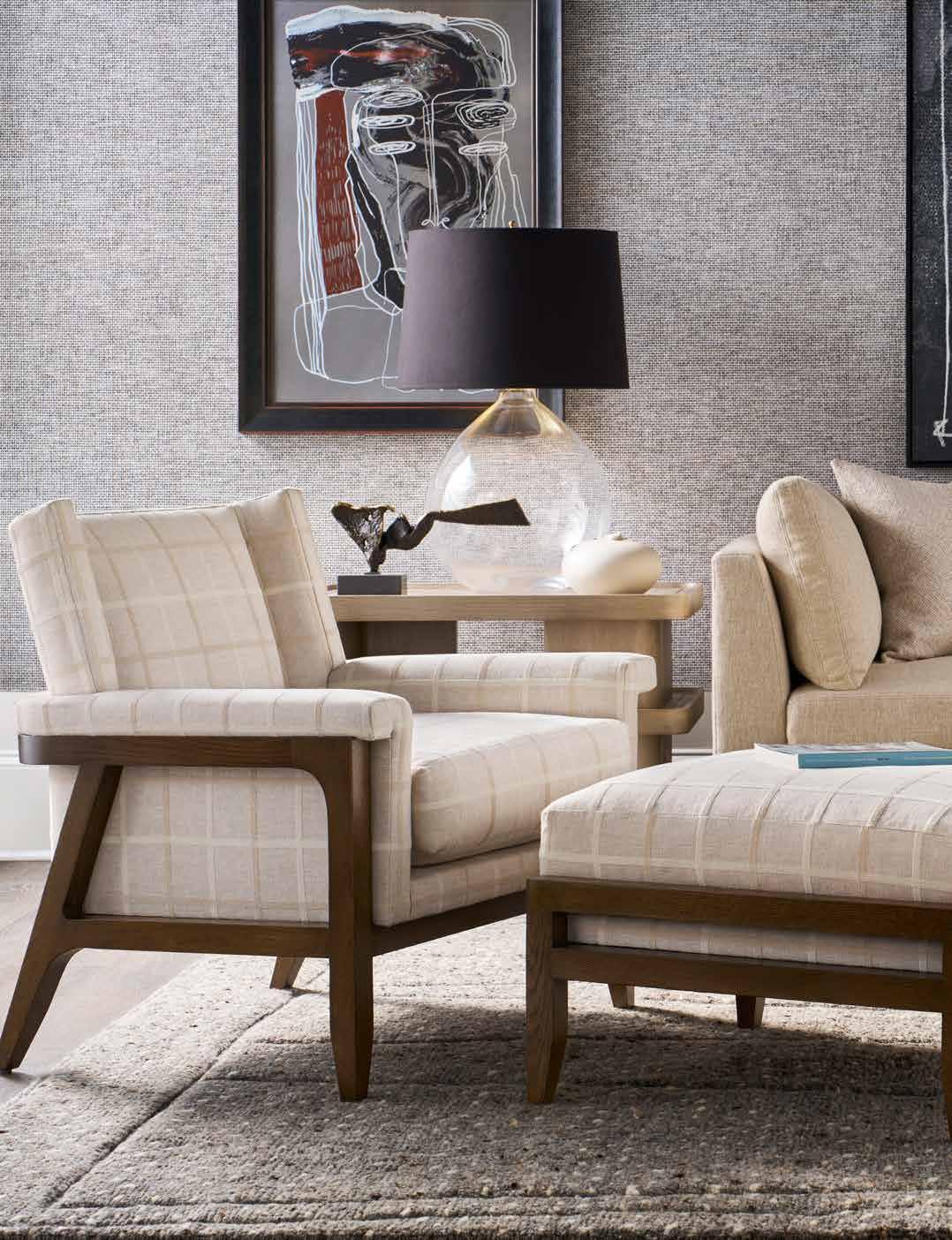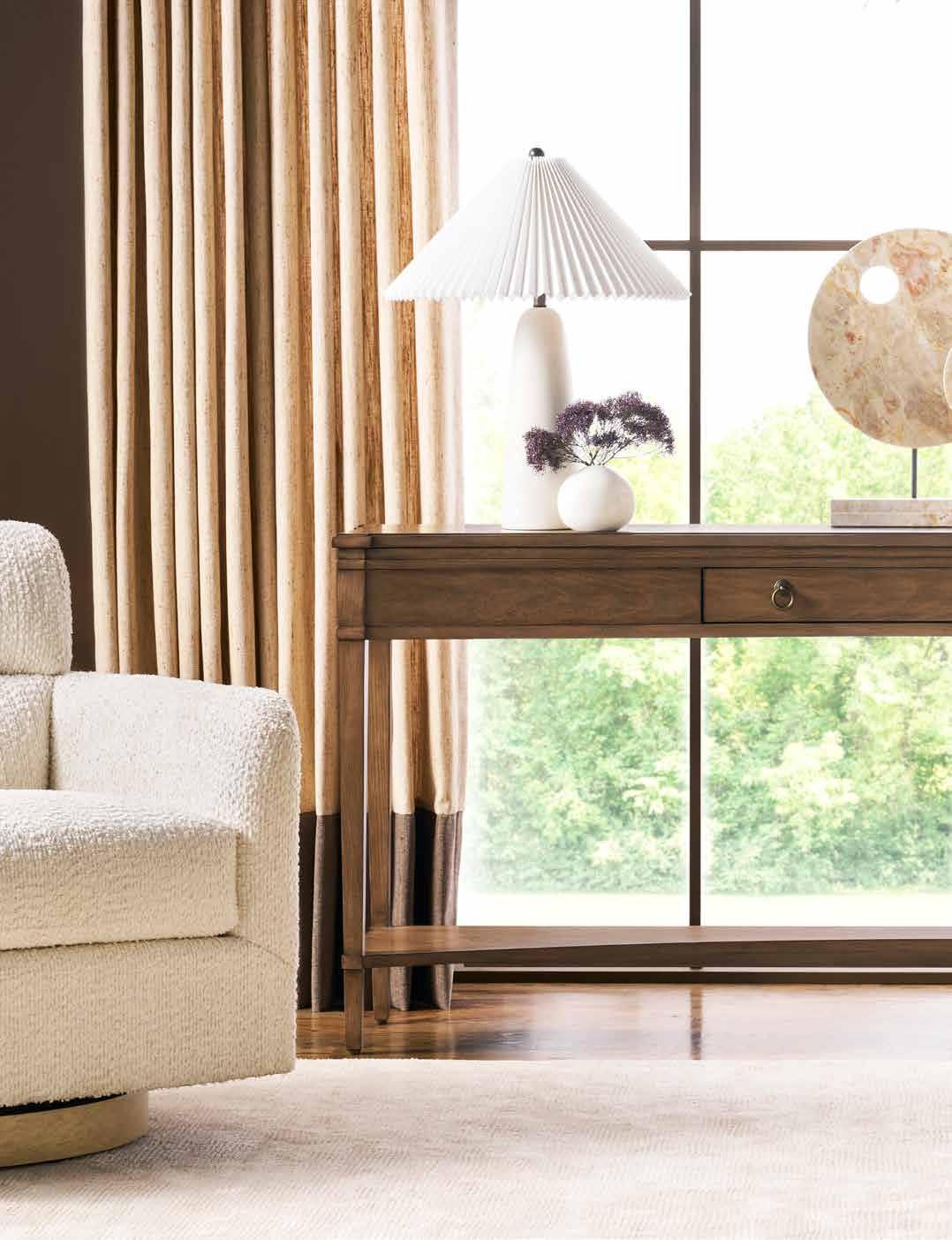 D 33.5 H 29.5) Fabric: Tork Linen. Finish: Arles. Exposed Wood Base. E. VERGE CONSOLE P845S. (W 72 D 16 H 30) Finish: Saddle. Crazy-cut Mahogany and Bleached Flat Cut Mahogany Veneers and Solids, Adjustable Tempered Glass Shelf, Inset Plinth Base. F. VIRTUOSO SIDE CHAIR V1229S. (W 20 D 27 H 32) Fabric: Nomad Snow. Finish: Arles. Exposed Wood Base. G. VIRTUOSO ROCKER V1229RKR. (W 23 D 33.5 H 29.5) Fabric: Cecilia Sand. Finish: Finley. Exposed Wood Rocker Base.