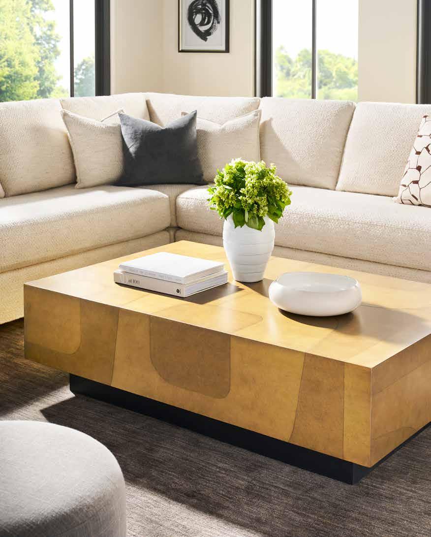 Fabric: Kibble Porcelain; two standard 21" throw pillows in Vista Cypress. Finish: Almond with Snowdrift Raffia Inset Panels. Wood Frame. Shown with two extra MPSP22 pillows in Cecilia Sand. C. ENTWINE COCKTAIL TABLE P585L. (W 36 D 36 H 20) Finish: Almond with Snowdrift Raffia. Wirebrushed Oak Base, Raffia on Inset Top with Glass Overlay. Can Nest with P585E and P585C. D. ENTWINE END TABLE P585E. (W 24 D 24 H 24) Finish: Almond with Snowdrift Raffia. Wirebrushed Oak Base, Raffia on Inset Top with Glass Overlay. Can Nest with P585C and P585L. E. PIERSON STORAGE CABINET CC110P (Make It Yours Storage) (W 83 D 20 H 34.75) Finish: Casa Blanca. Tall Retro Base with Metal Ferrules in Satin Brass, Premium Curved Frame Face (upcharge) , Textured Pendant Hardware in Satin Brass/One Centered on Each Door, Four Doors, One Adjustable Shelf Behind Each Set of Doors. F. DAYDREAM STOCKED