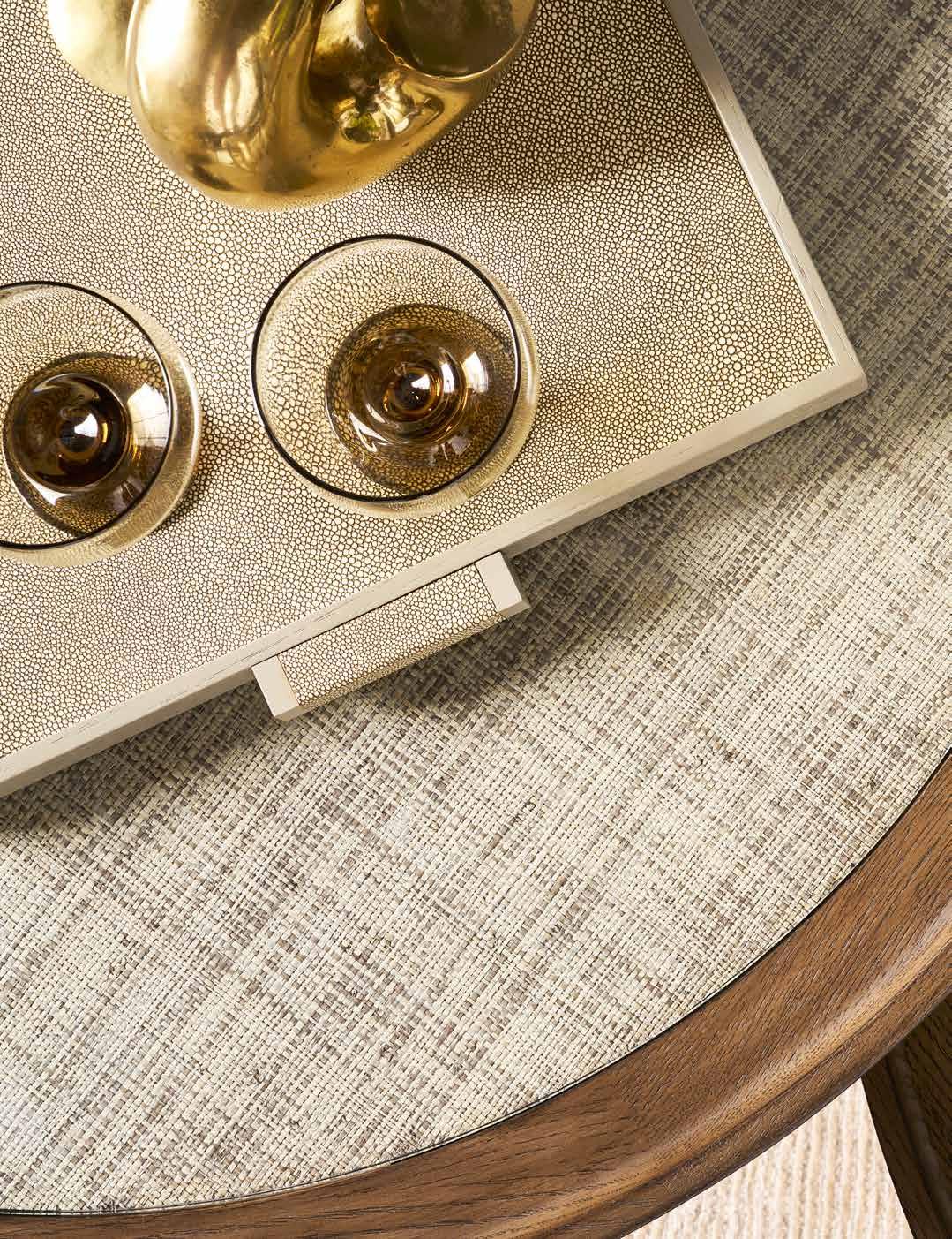 Flaxen Stone with Desert Raffia. Wirebrushed Oak Base, Raffia on Inset Top with Glass Overlay. Can Nest with P585E and P585L. E. ENTWINE COCKTAIL