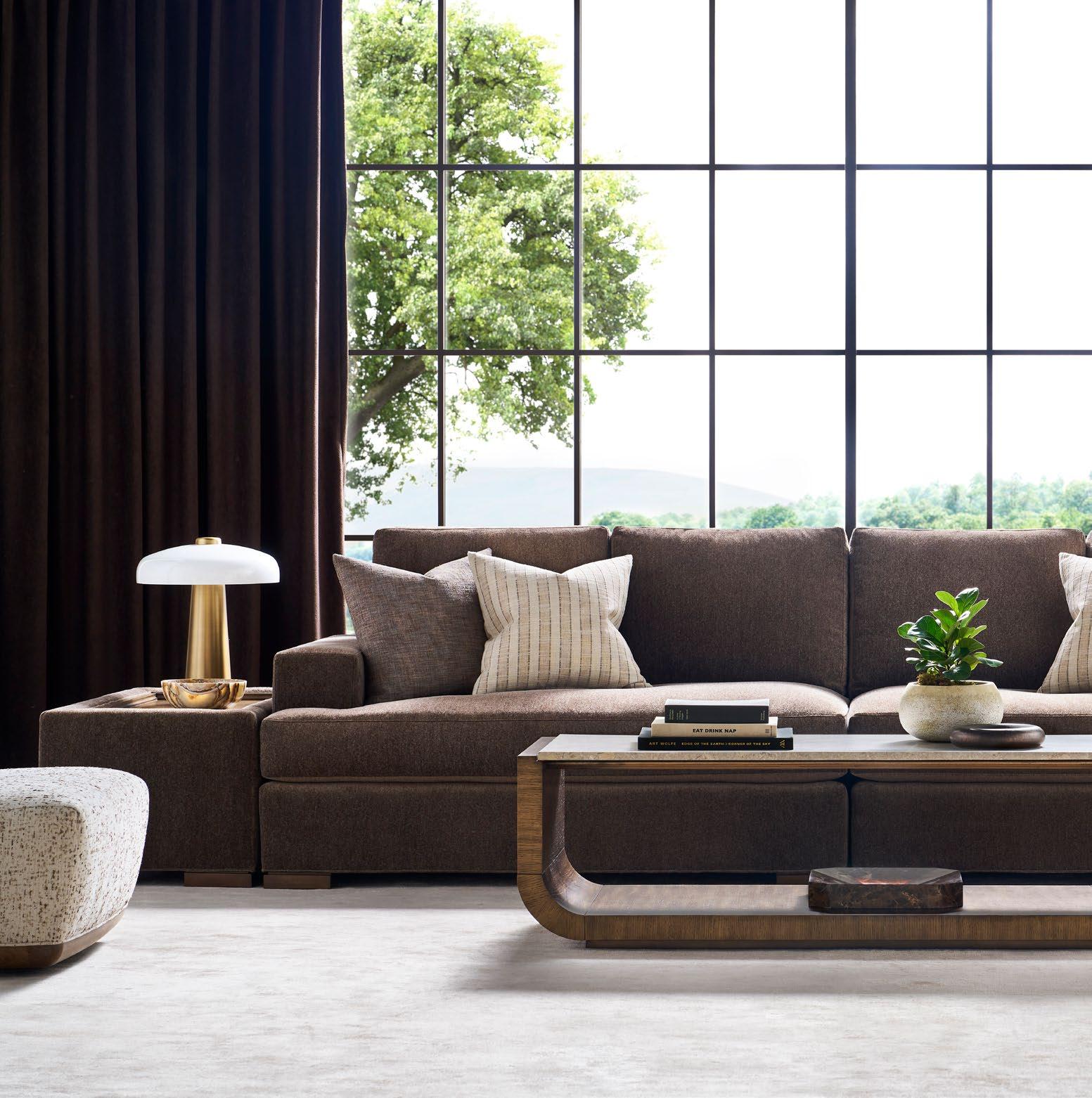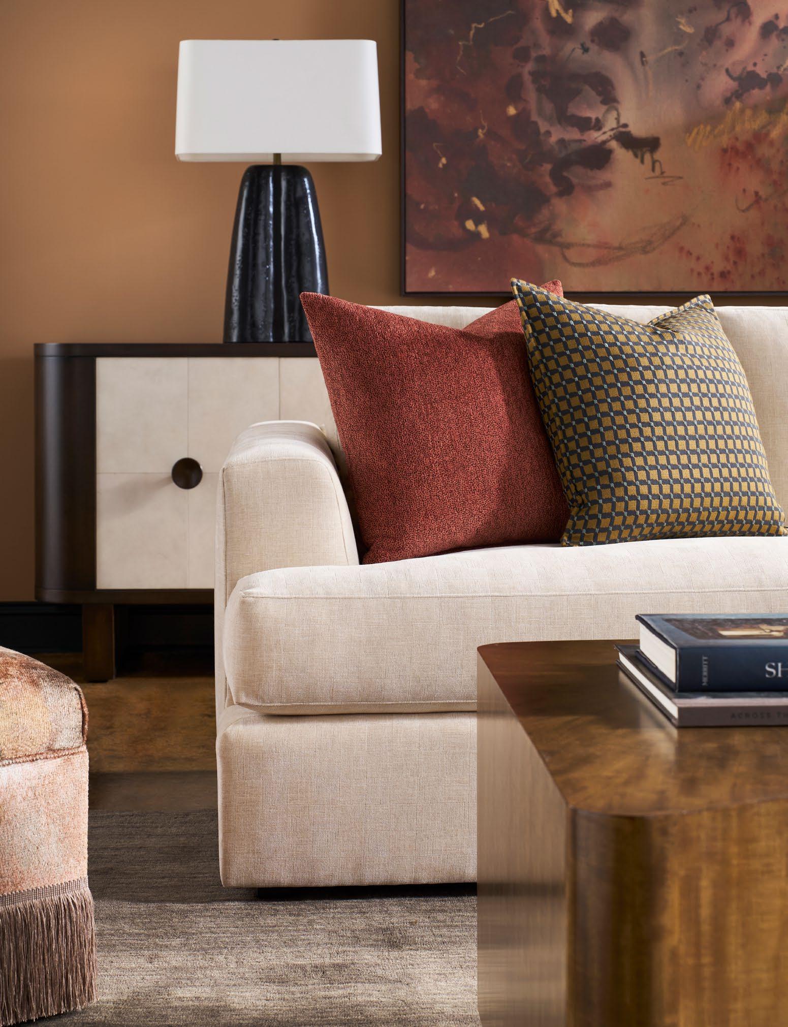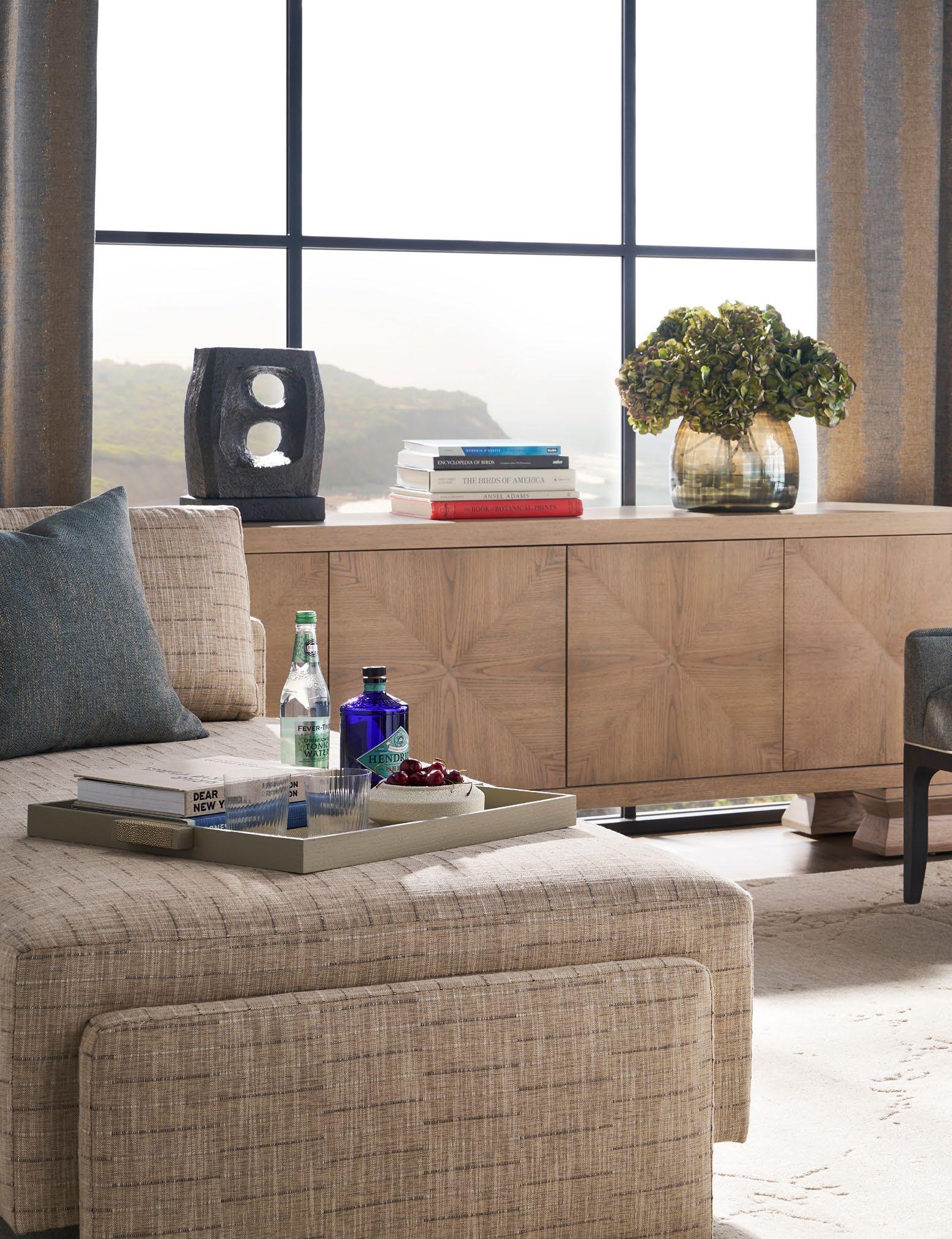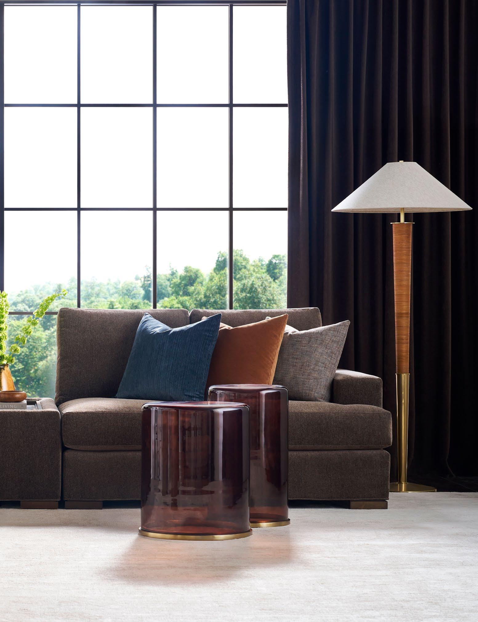 A. CANYON END TABLES P109E (Stocked) (2 shown) (W 18 D 18 H 22) Weathered Stone Travertine. B. REFUGE EXTENDED TWO SEAT SOFAS V281-2ES (2 shown) (W 111 D 45 H 33.5) Fabric: Napoli Alabaster; two standard 21" throw pillows in Jalex Mudstone. Finish: Mocha. Oak Plinth Base. Shown with two extra MPSP22 pillows in Trenton Leaf (additional charge) C. POPPY STOOLS V303ST (2 shown) (W 19 D 19 H 20) Fabric: Napoli Willow. D. YATES ROUND COCKTAIL TABLE P295C1-UV (Stocked) (W 56 D 56 H 18) Paldao Veneers. Finish: Cavallo. Glass Top, Brass Accents. E. PIERSON MAKE IT YOURS STORAGE CABINET CC111M. (W 118.75 D 20 H 32.25) Finish: Mocha. Beech Solids and Veneers, Maple Solids, Six Doors, One Adjustable Shelf Behind Each Set of Doors, Low Drum Base, Premium Modern Face (upcharge) , No Hardware.