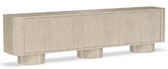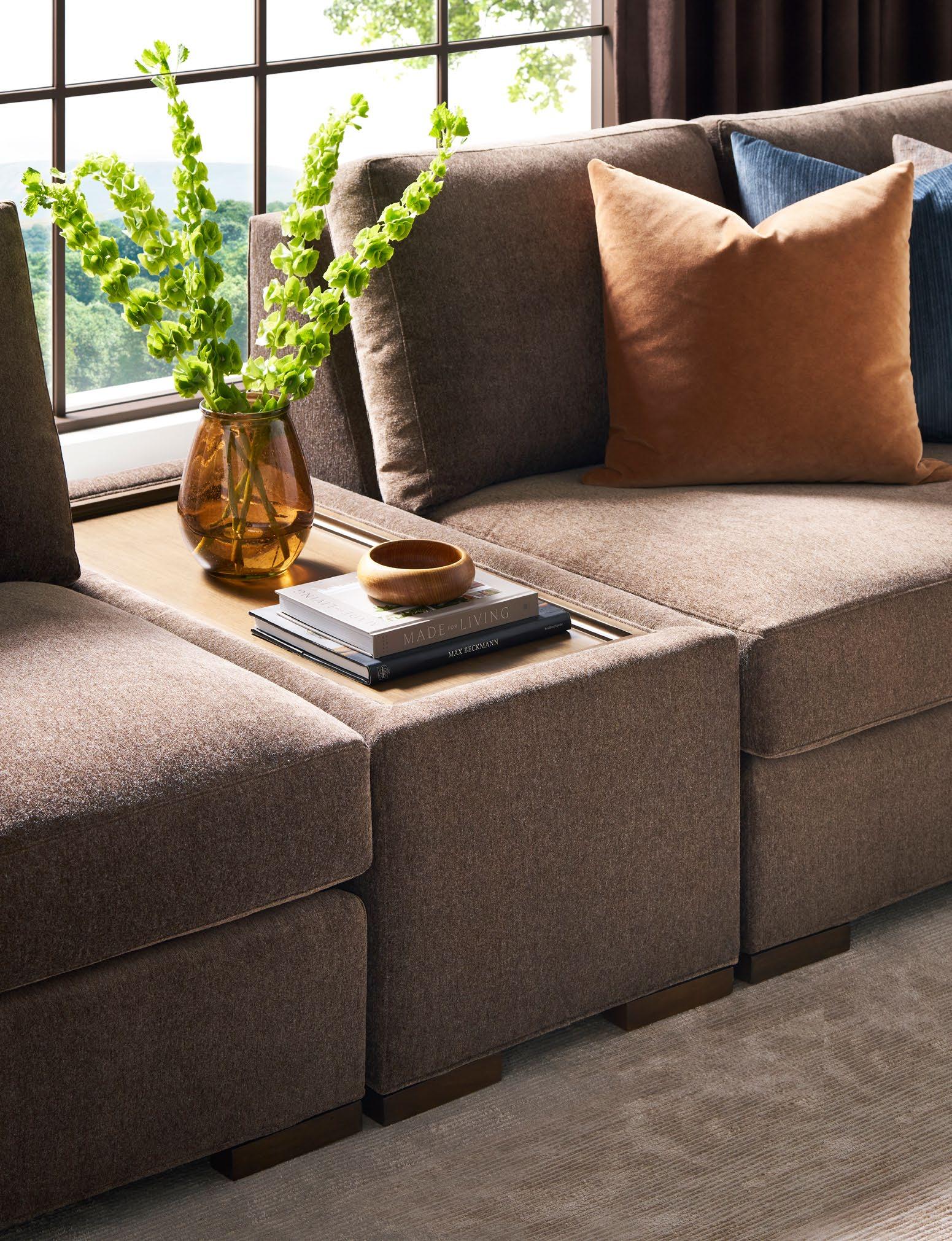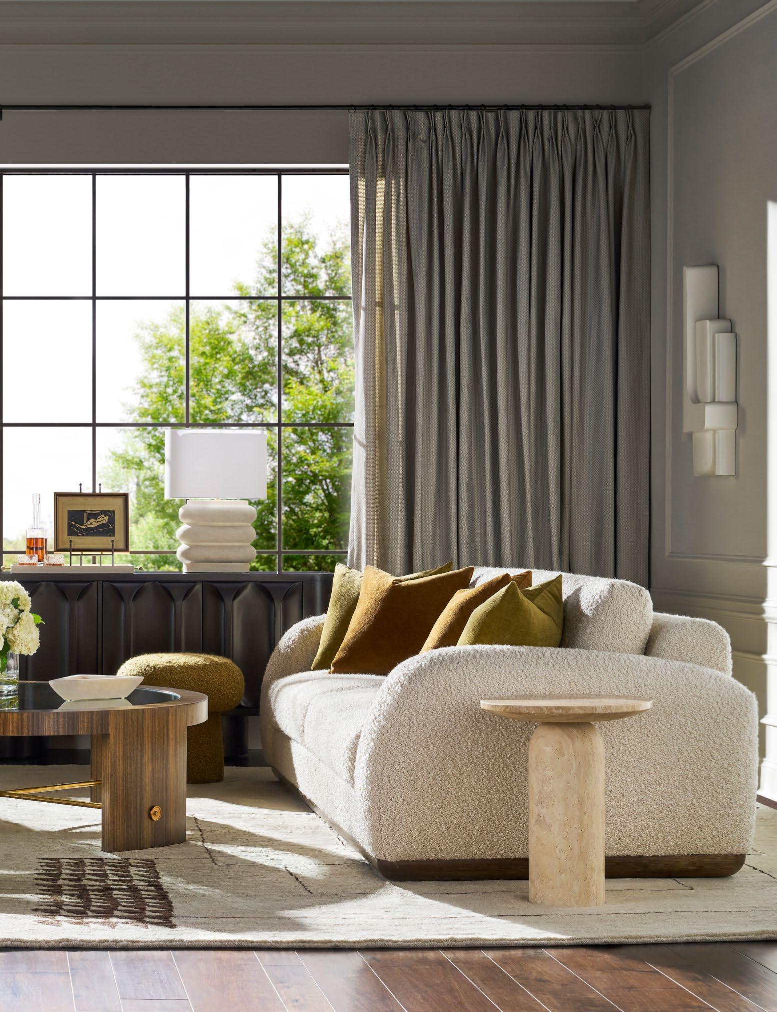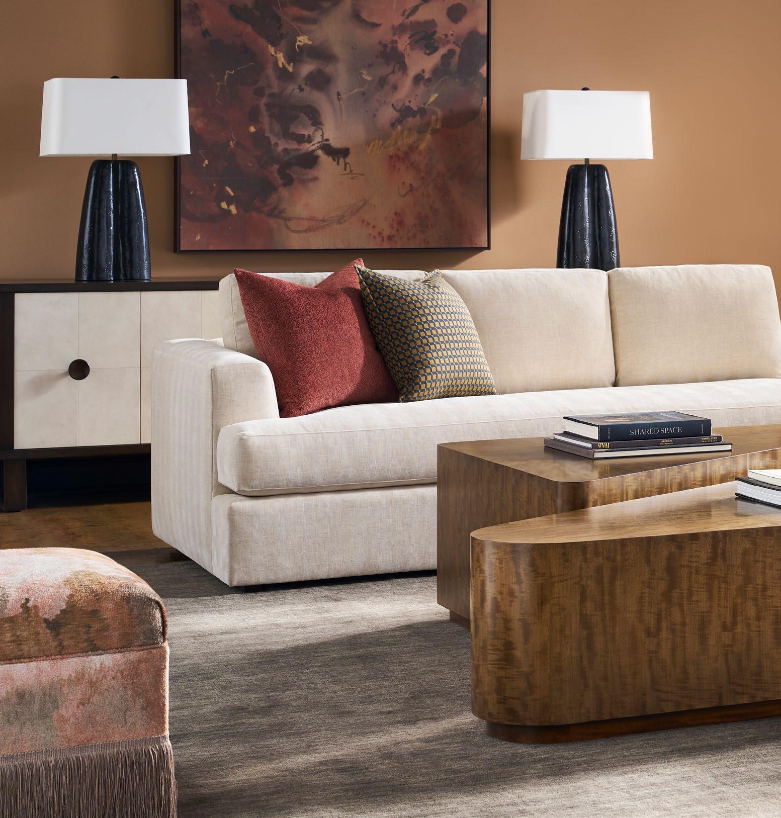 A. CANYON END TABLES P109E (Stocked) (2 shown) (W 18 D 18 H 22) Weathered Stone Travertine. B. REFUGE EXTENDED TWO SEAT SOFAS V281-2ES (2 shown) (W 111 D 45 H 33.5) Fabric: Napoli Alabaster; two standard 21" throw pillows in Jalex Mudstone. Finish: Mocha. Oak Plinth Base. Shown with two extra MPSP22 pillows in Trenton Leaf (additional charge) C. POPPY STOOLS V303ST (2 shown) (W 19 D 19 H 20) Fabric: Napoli Willow. D. YATES ROUND COCKTAIL TABLE P295C1-UV (Stocked) (W 56 D 56 H 18) Paldao Veneers. Finish: Cavallo. Glass Top, Brass Accents. E. PIERSON MAKE IT YOURS STORAGE CABINET CC111M. (W 118.75 D 20 H 32.25) Finish: Mocha. Beech Solids and Veneers, Maple Solids, Six Doors, One Adjustable Shelf Behind Each Set of Doors, Low Drum Base, Premium Modern Face (upcharge) , No Hardware.