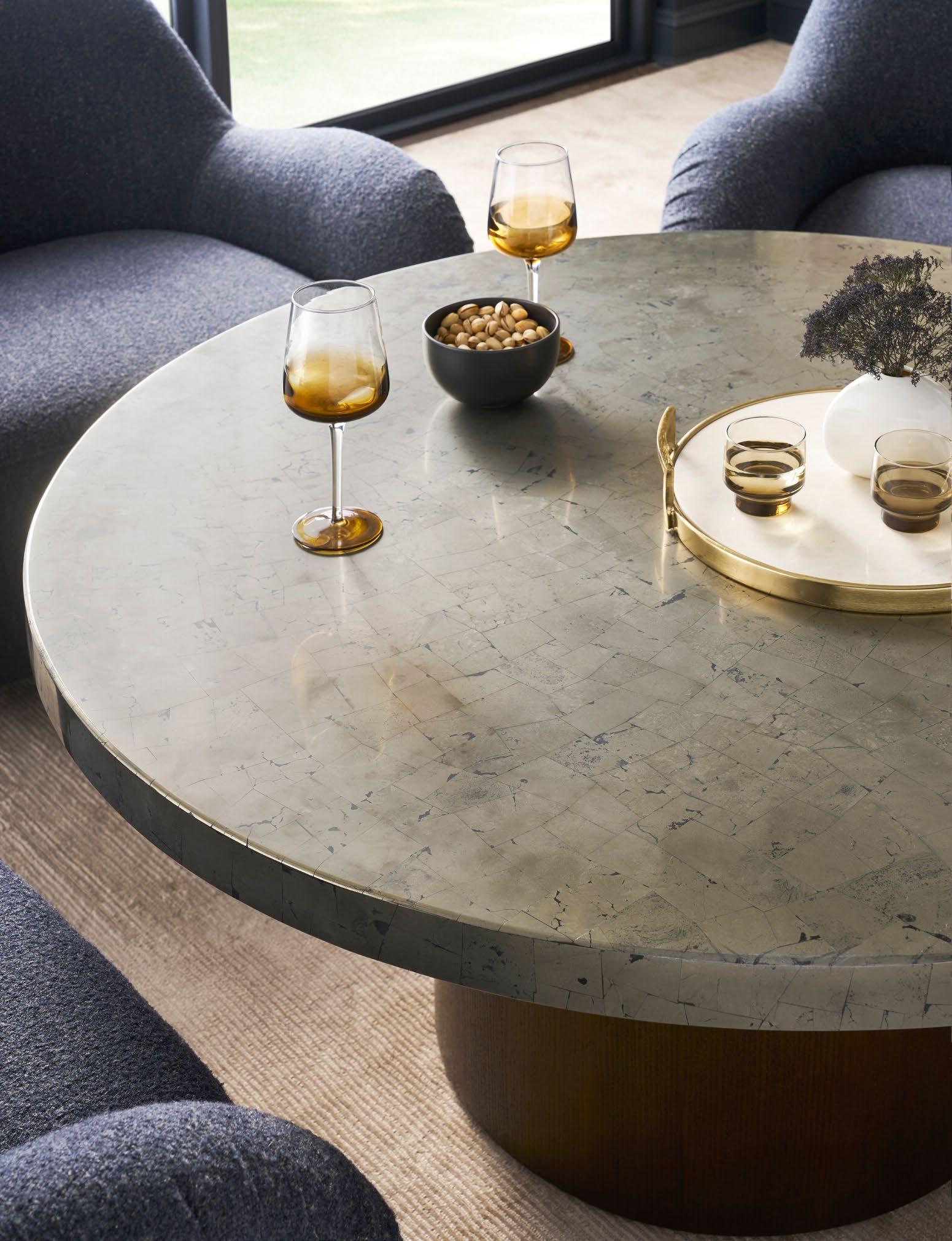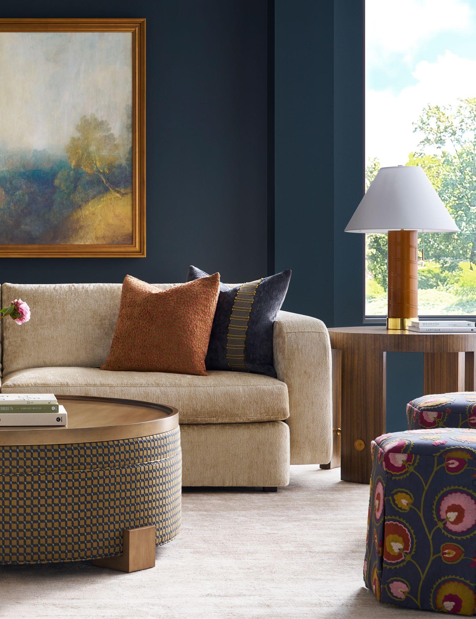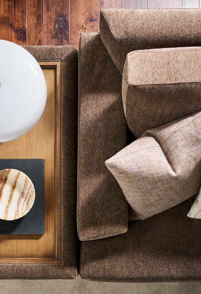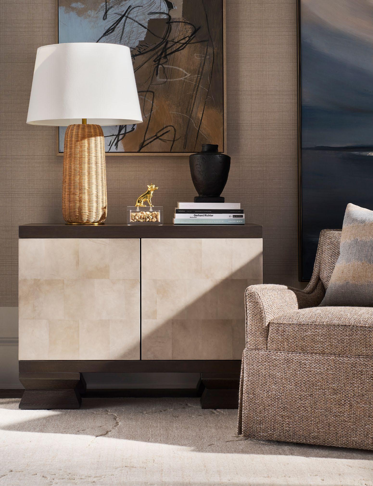 A. CANYON END TABLES P109E (Stocked) (2 shown) (W 18 D 18 H 22) Weathered Stone Travertine. B. REFUGE EXTENDED TWO SEAT SOFAS V281-2ES (2 shown) (W 111 D 45 H 33.5) Fabric: Napoli Alabaster; two standard 21" throw pillows in Jalex Mudstone. Finish: Mocha. Oak Plinth Base. Shown with two extra MPSP22 pillows in Trenton Leaf (additional charge) C. POPPY STOOLS V303ST (2 shown) (W 19 D 19 H 20) Fabric: Napoli Willow. D. YATES ROUND COCKTAIL TABLE P295C1-UV (Stocked) (W 56 D 56 H 18) Paldao Veneers. Finish: Cavallo. Glass Top, Brass Accents. E. PIERSON MAKE IT YOURS STORAGE CABINET CC111M. (W 118.75 D 20 H 32.25) Finish: Mocha. Beech Solids and Veneers, Maple Solids, Six Doors, One Adjustable Shelf Behind Each Set of Doors, Low Drum Base, Premium Modern Face (upcharge) , No Hardware.
