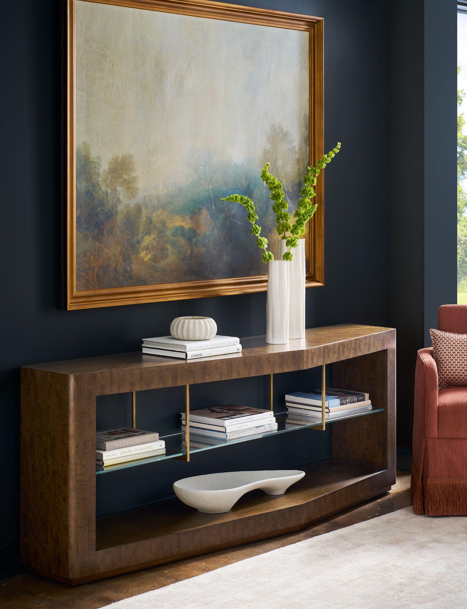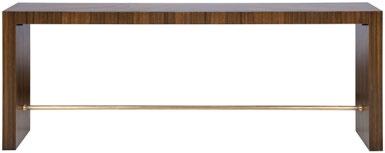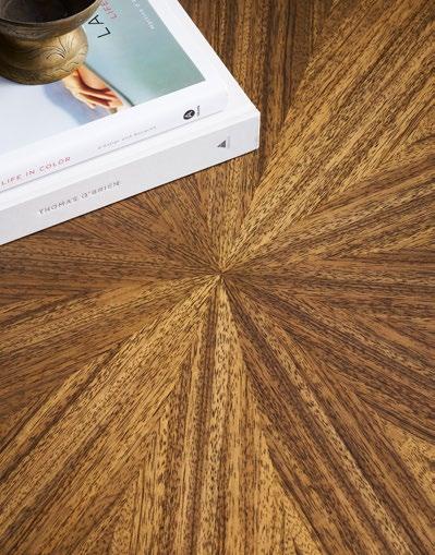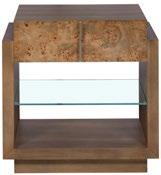H 29.5) Finish: Mocha. 60" Round Top (ash solids and veneers) , Round Edge Profile, Cross Pedestal Base (ash solids and veneers) with Satin Brass Metal Accents. C. NOVA CHEST P375H-LN (Stocked). (W 42 D 20 H 38) Random Matched Mappa Burl Veneers on Door Faces, Ash Solids and Veneers on Case and Base, Two Doors, Two Adjustable Shelves Behind Doors, Satin Brass Hardware.