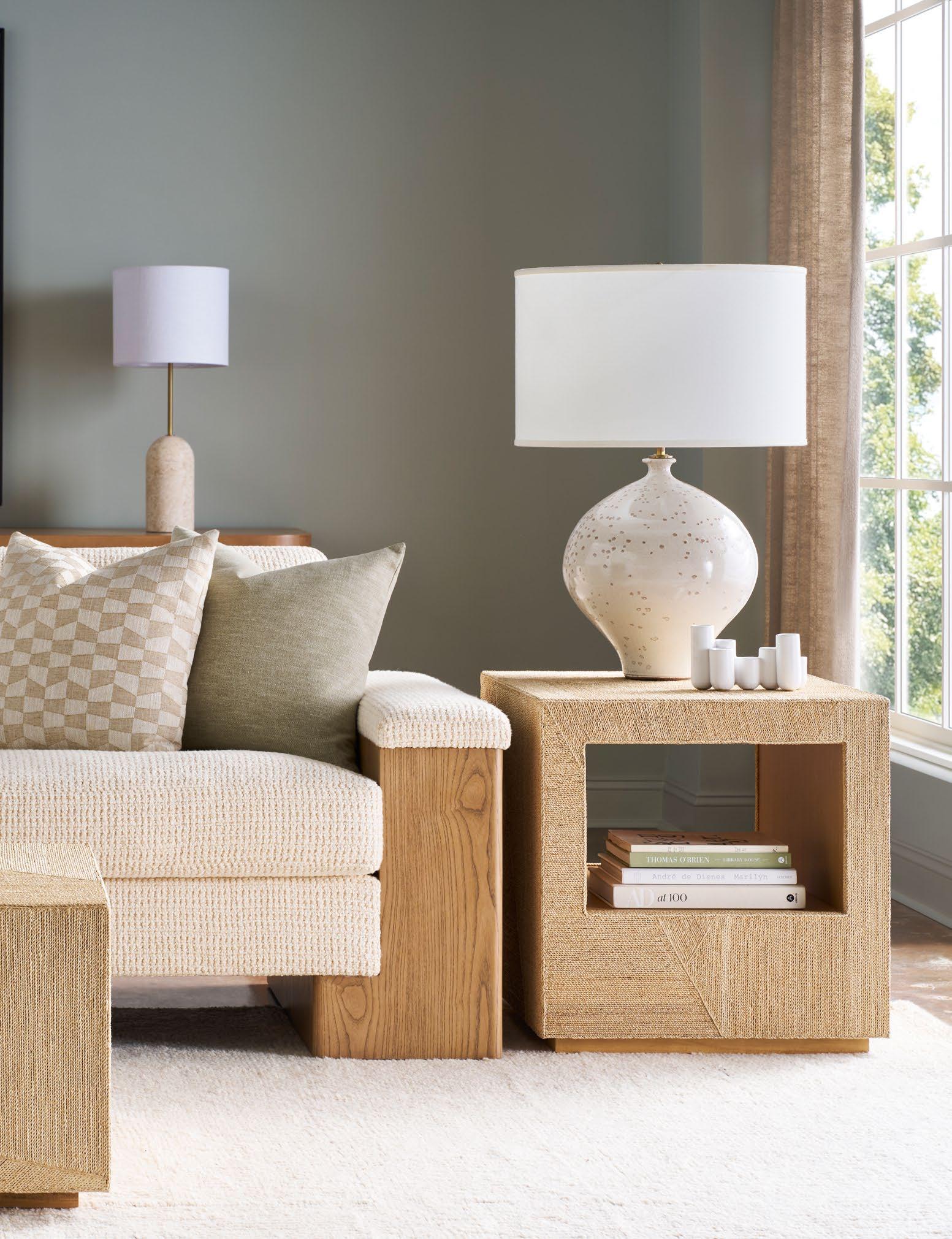 A. ANDOVER END TABLE 9275L. (W 32 D 24 H 24) Finish: Pebble Path. Ash Solids and Veneers. B. AARON BENCH SEAT SOFA 9050-1S. (W 105 D 43.5 H 33.5) Fabric: Ryker Storm; two standard 12.5"x31.5" kidney pillows and two 12.5"x29" arm pillows. Finish: Pebble Path. White Oak Base. Shown with one extra MPSP21 pillow in Dawson Bisque (additional charge) C. WOLCOTT COCKTAIL TABLE 9020C1. (W 55 D 55 H 17.5) Finish: Pebble Path. Ash Solids and Veneers, Clear Glass Top, Fixed Shelf. D. UTICA CHAIR 9054-CH. (W 29.5 D 35.5 H 32) Fabric: Dawson Bisque. Fully Upholstered. E. UTICA OTTOMAN 9054-OT. (W 24 D 24 H 19.5) Fabric: Dawson Bisque. Fully Upholstered. F. ROME SPOT TABLE 9018EE (Stocked) (W 12 D 12 H 20) Toronto Stone.