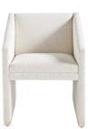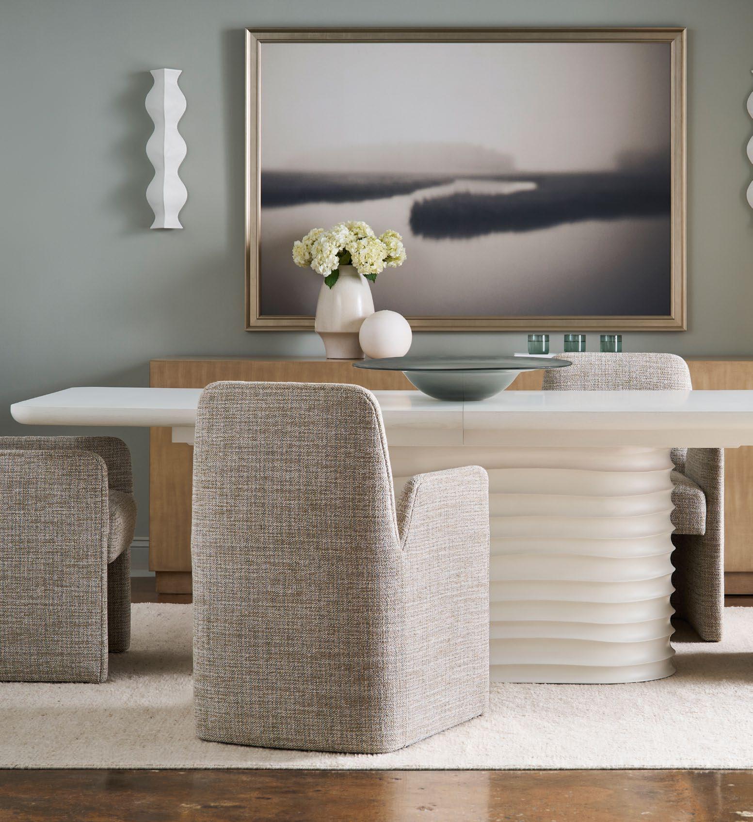A. VEGA ARM CHAIRS V1219A (4 shown) (W 24 D 24.5 H 34.25) Fabric: Tove Whisper. Fully Upholstered. B. MAKE IT YOURS DINING PEDESTAL TABLE TL94BD22. (W 94 D 48 H 29.5) Finish: Casa Blanca. 94" Rounded Corner Top (ash solids and veneers) , Half Round Edge Profile, Organic Pedestal Base (luxury composite) C. SPLENDOR ENTERTAINMENT CENTER P815ET. (W 86 D 19 H 32) Finish: Almond. Bleached Figured Maple Veneers, Maple Solids, Four Doors, Two Drawers, One Adjustable Shelf Behind Each Door, Soft Bronze Metal Accents. D. BANKS SWIVEL CHAIR V1192-SW. (W 37 D 38.5 H 33) Fabric: Thane Ivory. Finish: Cascade. 360 Degree Swivel, Soft Brass Metal Accents. E. CANYON END TABLE P107E (Stocked) . (W 18 D 18 H 22) Ambaji White Stone. F. VEGA STOCKED ARM CHAIR TV1219A. (W 24 D 24.5 H 34.25) Fabric: Kendra Sand. Fully Upholstered.