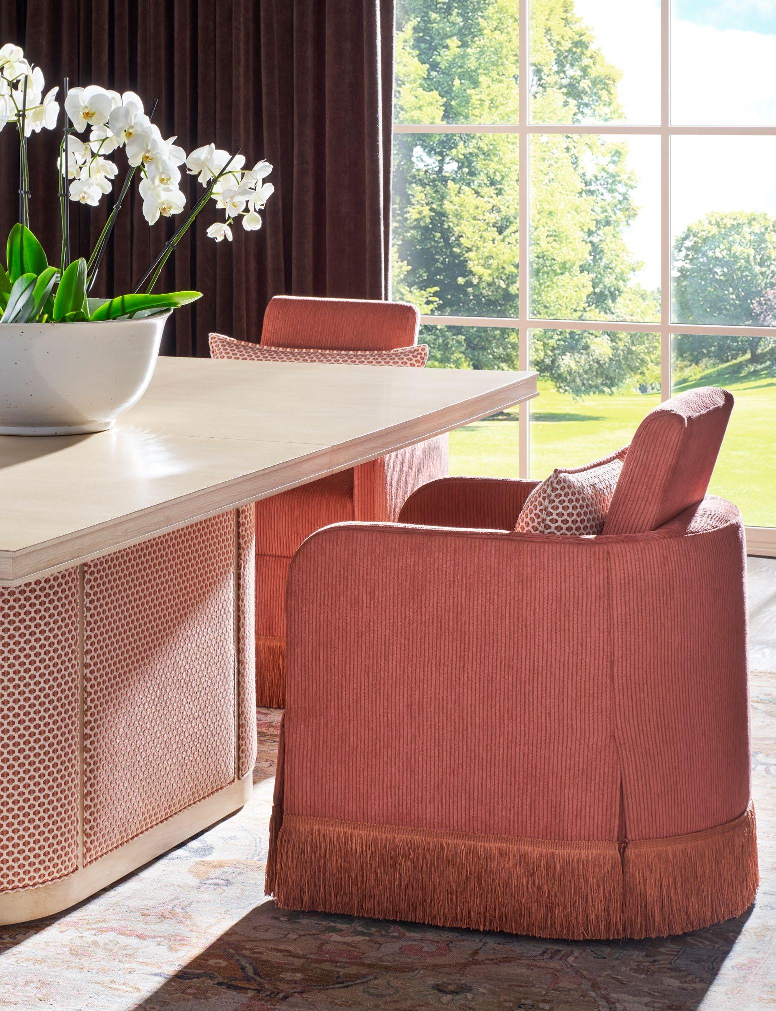 A. MAKE IT YOURS DINING PEDESTAL TABLE TL94AB24. (W 94 D 48 H 29.5) Fabric: Eva Koi. Finish: Almond. 94" Rectangular Top (ash solids and veneers) , Grooved Edge Profile, Upholstered Elliptical Pedestal Base with Wood Borders. B. LAURA ARM CHAIRS V1172WA (3 shown) . (W 24.5 D 27.5 H 33.5) Fabric: Ryan Spiced Cider with optional Fringe Spice at bottom of skirt (upcharge) Waterfall Skirt, Ball Casters in Antique Brass or Brushed Nickel. Each chair is shown with one extra MP128 kidney pillow in Eva Koi (additional charge) C. LAURA STOCKED ARM CHAIR TV1172WA. (W 24.5 D 27.5 H 33.5) Fabric: Icey Cream. Waterfall Skirt, Ball Casters in Antique Brass or Brushed Nickel.