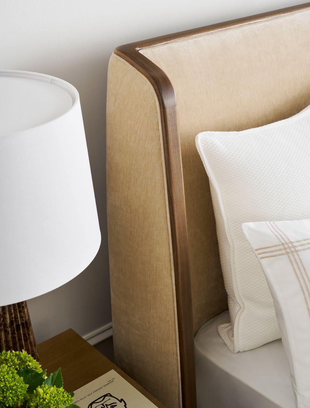Nova’s signature, fully upholstered shelter bed features a softly curved headboard accentuated by exposed wood trim—emphasizing the way the design envelops you in sophistication. Its elegant frame offers endless support as you relax and unwind in comfort.