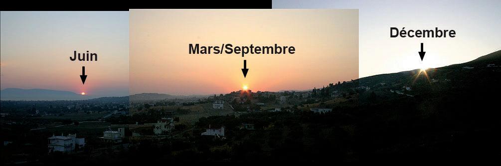 Au cours de l’année, la position des levers et des couchers du Soleil varie également. En effet, la longueur du jour change tout au long de l’année, tout comme le trajet apparent du Soleil dans le ciel, ainsi que les positions des levers, des couchers et de la hauteur du Soleil à midi. Plus le Soleil sera haut, plus son rayonnement sera concentré en énergie.