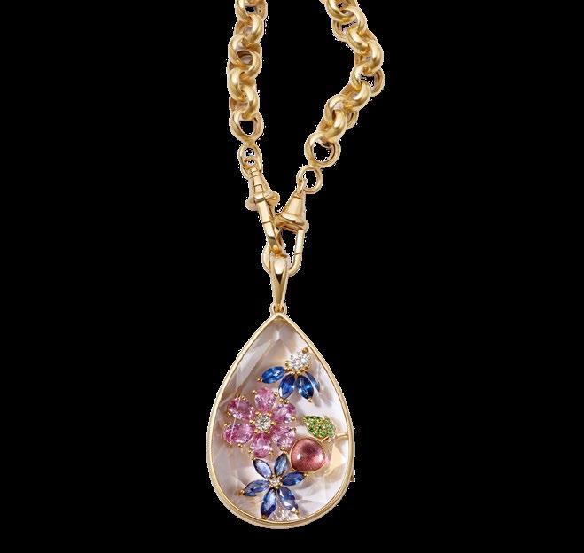 Treasure your precious memories with Loquet’s new Lunar Cushion locket (left), which can be opened and personalised with your chosen charms. Handcrafted in 18k solid gold, illuminated by a single cushion-cut diamond, this round locket is edged with diamonds and set with a faceted crystal that draws inspiration from the moon’s gentle constancy. Four flower charms are handcrafted in 18k gold set with marquise and pear-shaped sapphires and diamonds. Loquet’s Sugar Plum charm in 18k solid gold, set with green tsavorite leaves and a pink cabochon sapphire, is a perfect sweet treat. Founded in 2013 by British environmentalist and columnist Sheherazade Goldsmith, Loquet takes a contemporary approach to the eraspanning idea of a keepsake locket. A charming piece.