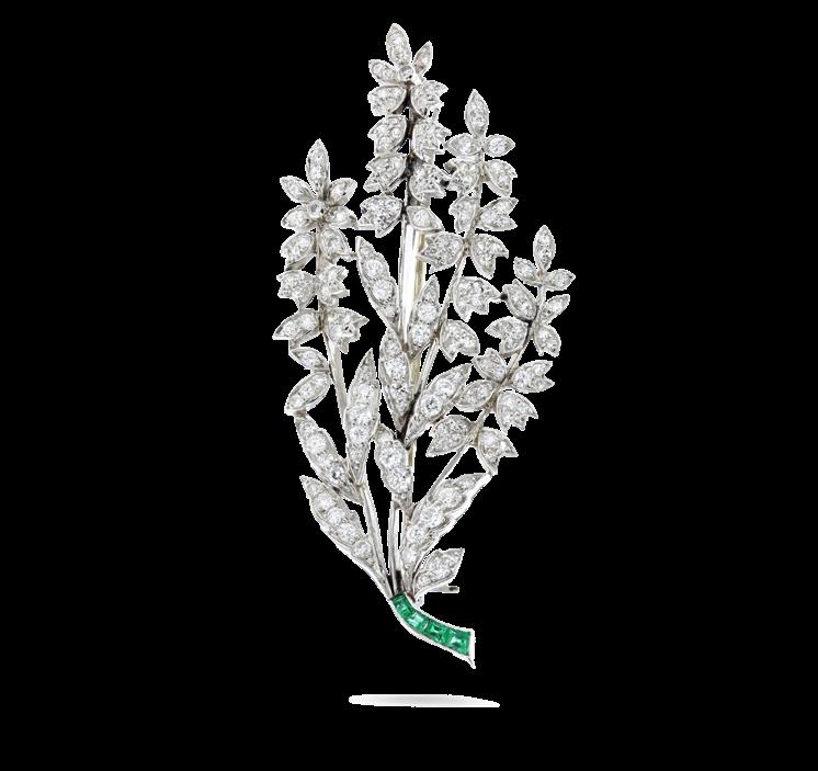 Netflix series The Crown reignited interest in the life and style of Princess Margaret, the rebellious and enchanting younger sister of Queen Elizabeth II. The fashionable royal’s exceptionally good taste extended to her jewellery collection. Diamond specialists Baker Brothers successfully bid for a number of the Princess’s personal jewels at a Sotheby’s auction, including this historic diamond and emerald heather brooch (right), presented to her in 1947 to mark the launch of the RMS Edinburgh Castle. The 6.2cm brooch is a masterclass in mid-century design and craftsmanship, with brilliant-cut diamond adorning a delicate spray of Scottish heather, with calibre-cut emeralds on the stem. A sparkling piece of history.