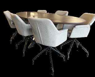Massief eiken ovale eettafel (240 x 110 cm) met verjongd blad in fraaie walnootkleur. Inclusief 6 arm/draaistoelen bekleed met trendy stof Alpine natural. Compleet voor een superprijs! Uit voorraad leverbaar!