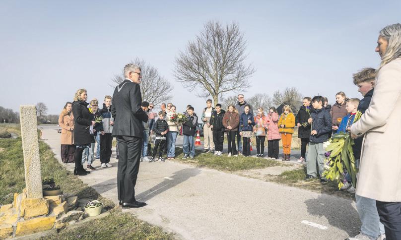 FRANEKER - Burgemeester André van de Nadort legde op vrijdag 6 maart samen met leerlingen van obs De Steven bloemen bij het oorlogsmonument aan de Riedsterweg tussen Dongjum en Boer.
