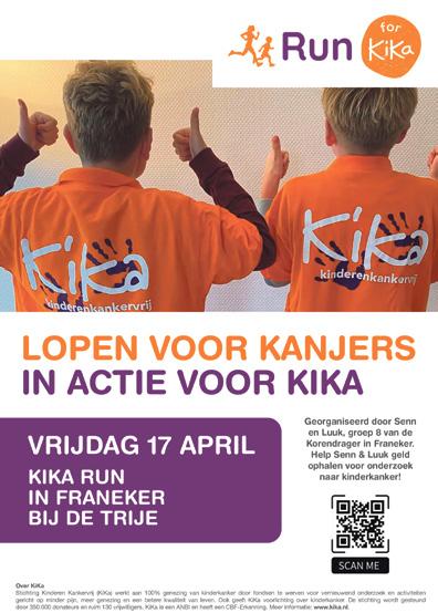 Nu is het bijna zover en stijgt de spanning. Op vrijdag 17 april, tijdens de Koningsspelen, kunnen deelnemers rondjes gaan rennen. Sponsoren kunnen dan een vast bedrag storten of per ronde een bepaald bedrag doneren. “En we hebben ook een QR-code, dus betalen is reuze gemakkelijk”, vult Luuk aan. “Ons doel is om 5000 euro in te zamelen.” Zo! Inschrijving is bij de school De Korendrager. De groepen 5, 6, 7 en 8 kunnen meedoen.