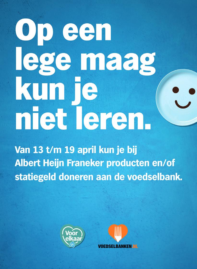 dels al ruim 20 jaar. Naast deze inzamelingsactie ondersteunt AH Franeker de voedselbank ook op wekelijkse basis. Producten die tegen de houdbaarheidsdatum aanlopen, waaronder vleeswaren, worden zorgvuldig ingevroren en vervolgens gedoneerd aan de voedselbank. Dankzij deze samenwerking kan de voedselbank haar voorraden aanvullen en complete voedselpakketten beschikbaar stellen voor de mensen in onze gemeente die dit hard nodig hebben. Samen gaan we ook deze week weer voor een mooie opbrengst!