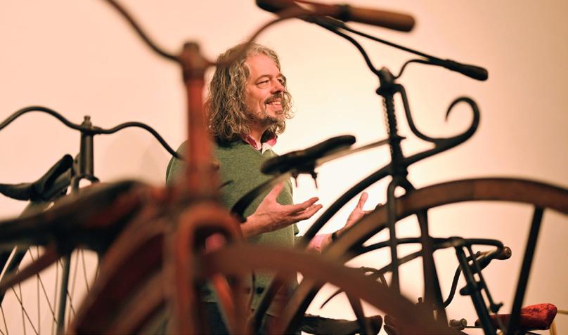 Op de foto conservator Josse Pietersma bij de historische fietsencollectie.