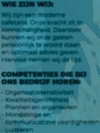 Wij zijn een moderne cafetaria. Onze kracht zit in kleinschaligheid. Daardoor kunnen wij onze gasten persoonlijk te woord staan en optimaal advies geven. Hiervoor nemen wij de tijd.
