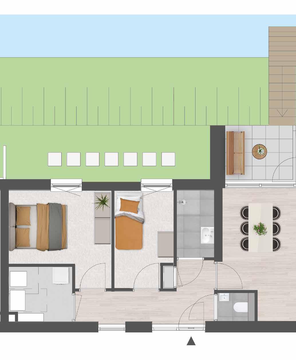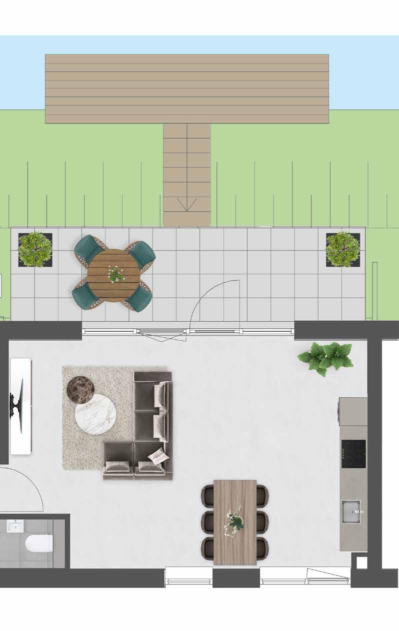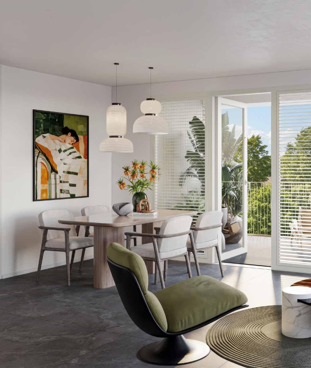 The apartments are designed with an eye for space and light. Large floor-to-ceiling windows allow daylight to flow in generously and enhance the open character of the homes. The ground-floor apartments